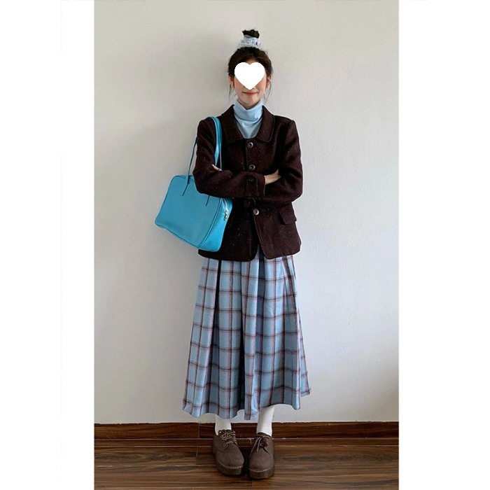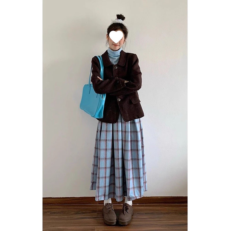 빈티지 패션 올 매치 블루 체크 무늬 기모 스커트 중간 길이 A 라인 스커트스토어 가기