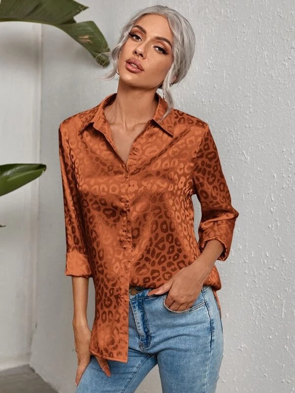 유럽과 미국의 국경 간 여성 2024 가을 새 옷깃 오픈 버클 레오파드 자카드 셔츠 아마존 긴 소매 셔츠스토어 가기