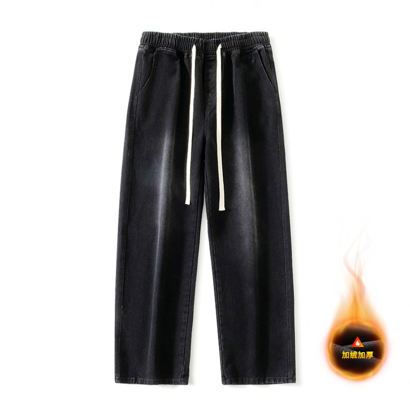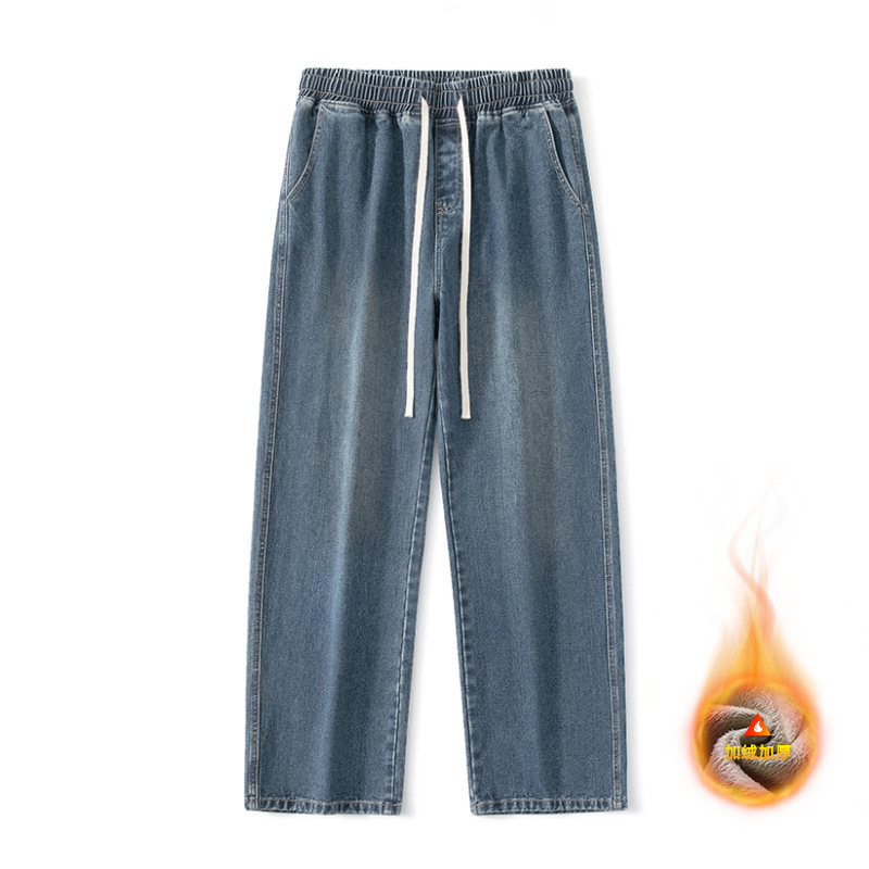 무추 남성복∣후리스 안감 두꺼운 미국식 하이 스트리트 레트로 워싱 데님 팬츠 남성 트렌디 브랜드 루즈핏 스트레이트 와이드 팬츠