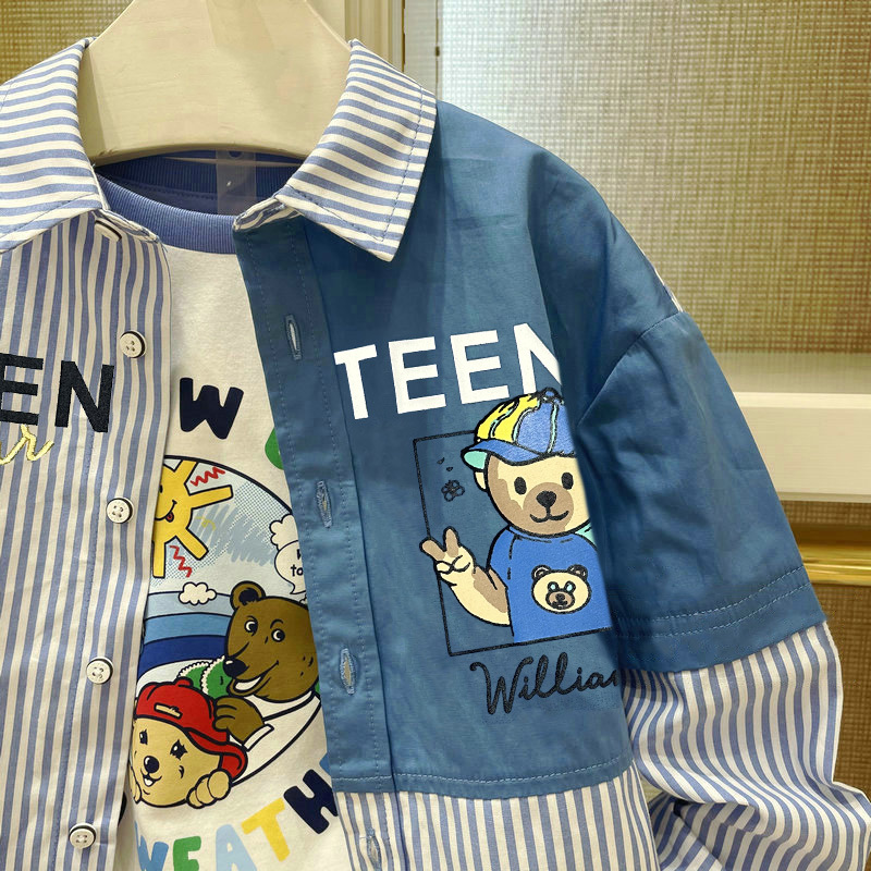 곰 새 소년 셔츠 스플 라이스 스트라이프 중형 및 대형 어린이 옷깃 만화 프린트 아동 자켓 탑스토어 가기