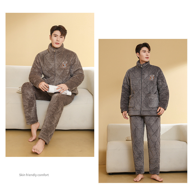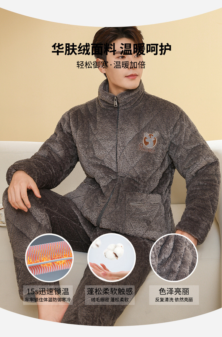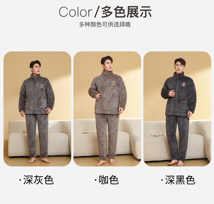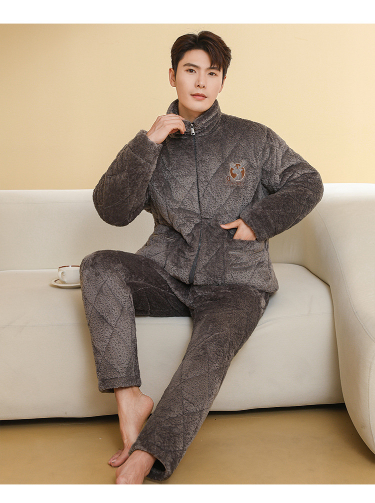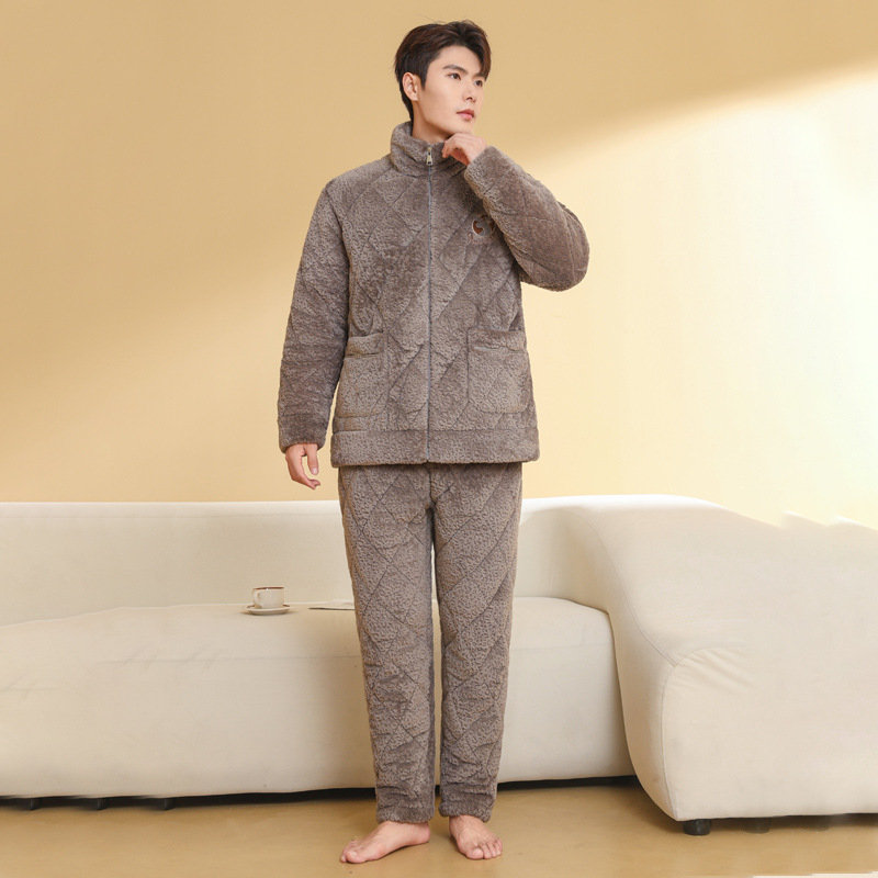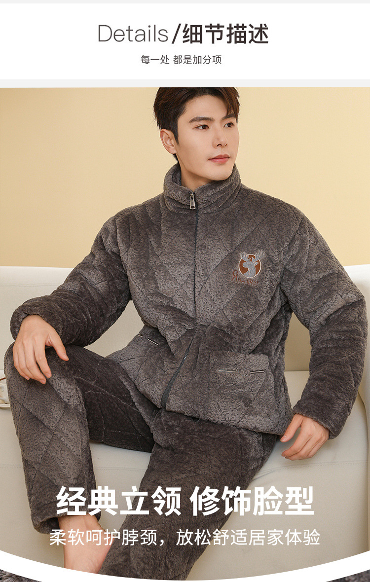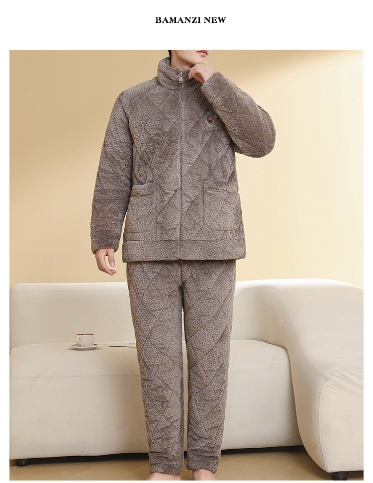 Ba Manzi 남자의 가을과 겨울 새로운 잠옷 수직 칼라 캐주얼 스타일 두꺼운 홈 옷 세트 어두운 간단한 따뜻한 옷