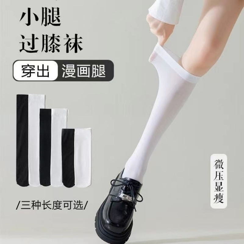 작은 다리 양말 흑백 양말 여성의 약간 눌린 검은 색 실크 슬리밍 무릎 높이 스타킹 중간 튜브 높은 스타킹 통기성 AliExpress