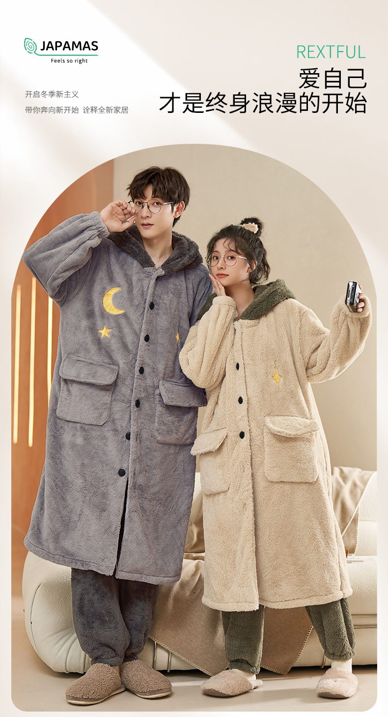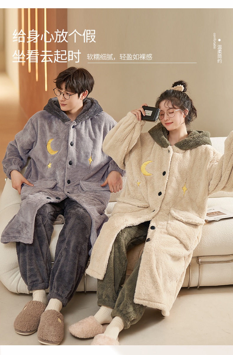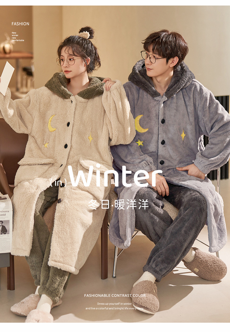 두꺼운 긴 산호 양털 커플 파자마 여성의 겨울 후드 나이트 가운 남성 플란넬 홈 의류 세트스토어 가기