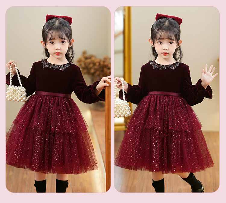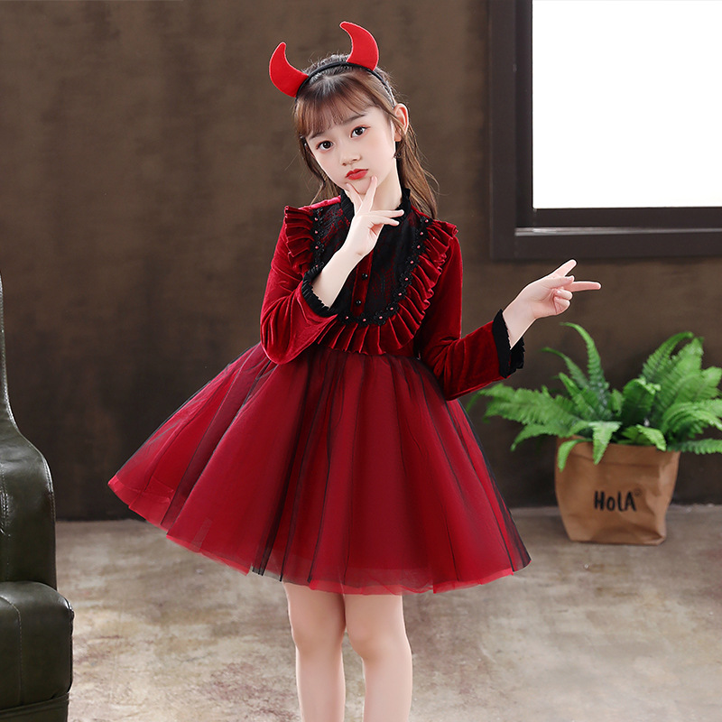 소녀의 원피스 빨간 베일 원피스 긴 소매 어린이 푹신한 공주 원피스 기모 어린 소녀의 원피스 봄과 가을