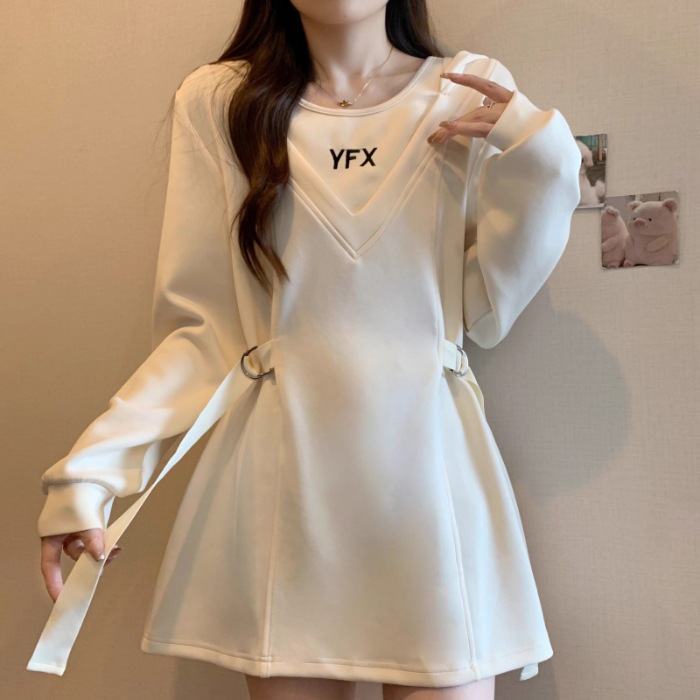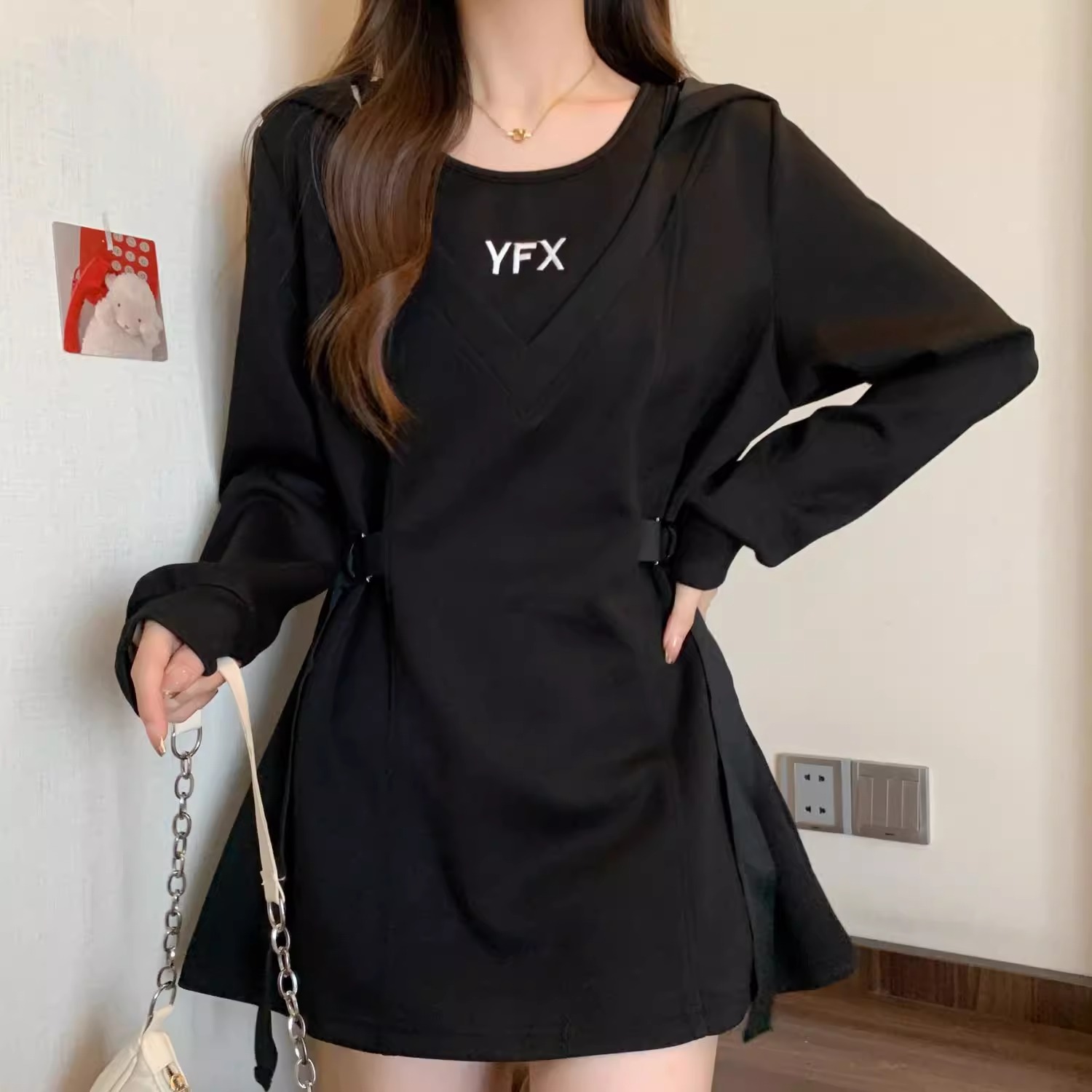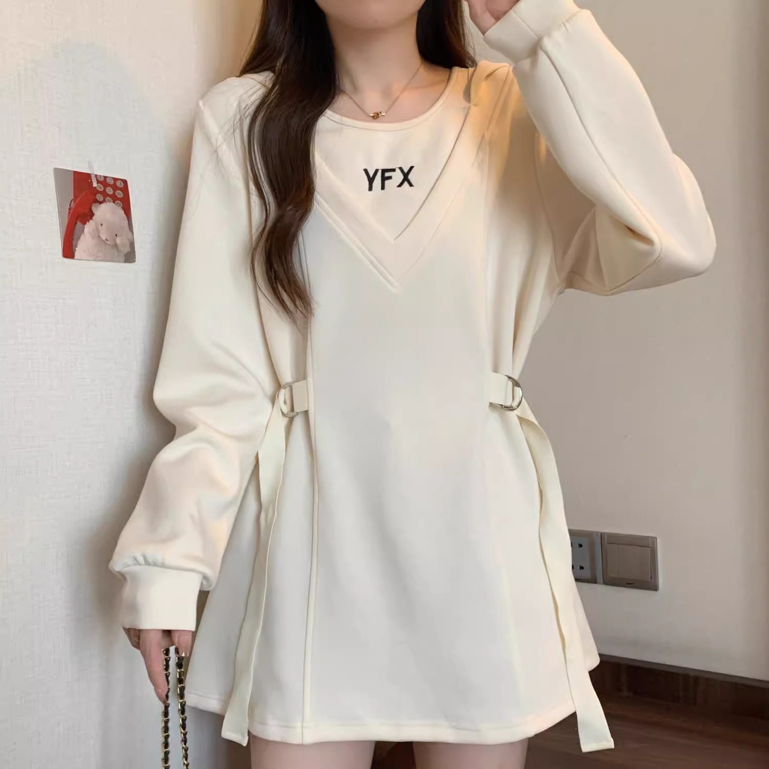 통통녀 틈새 타이트 허리 후드 숄더 스웨트 셔츠 여성용 슬리밍 벨리 커버 가짜 투피스 유행 긴팔 탑스토어 가기