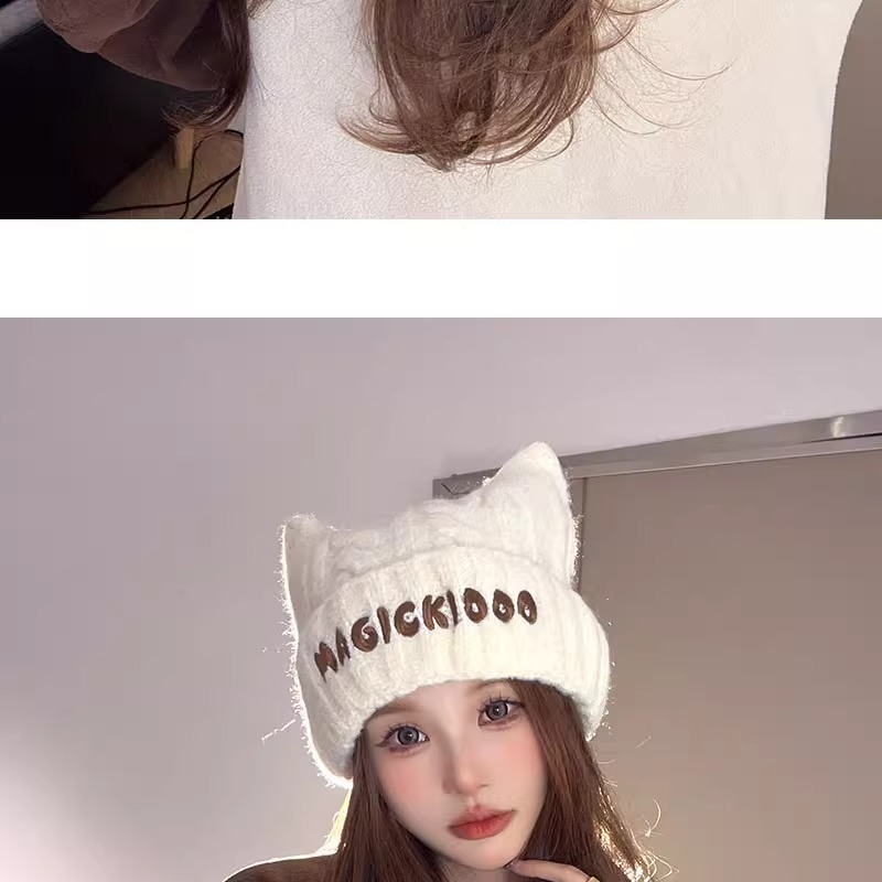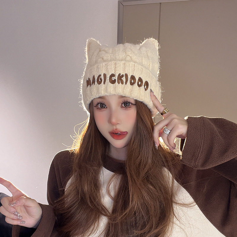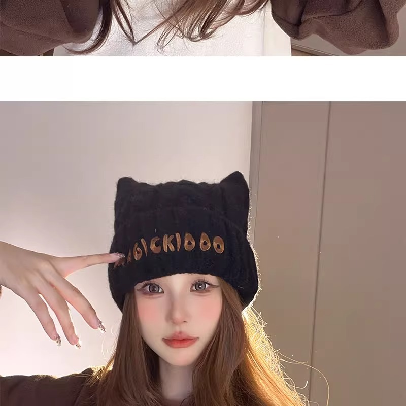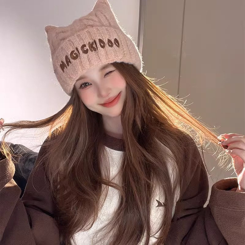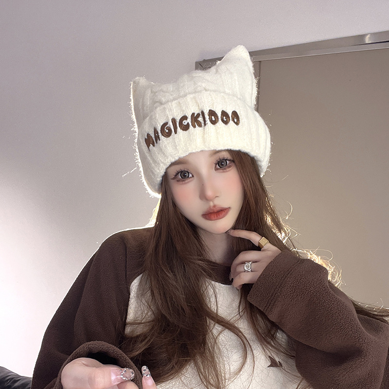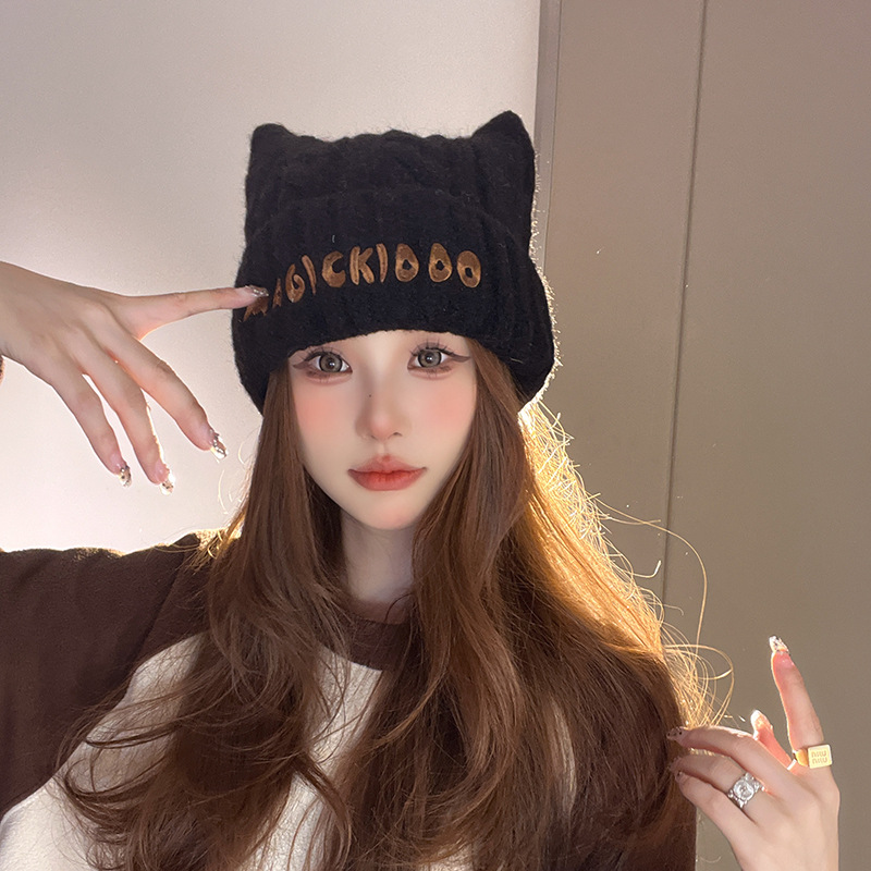 귀여운 작은 악마 양모 니트 모자 여성의 가을과 겨울 2024 새로운 일본 단색 올 매치 따뜻한 방한 학생스토어 가기