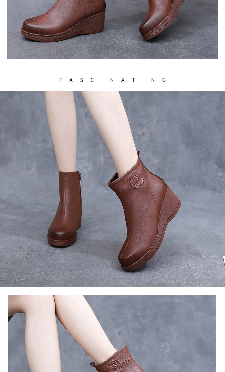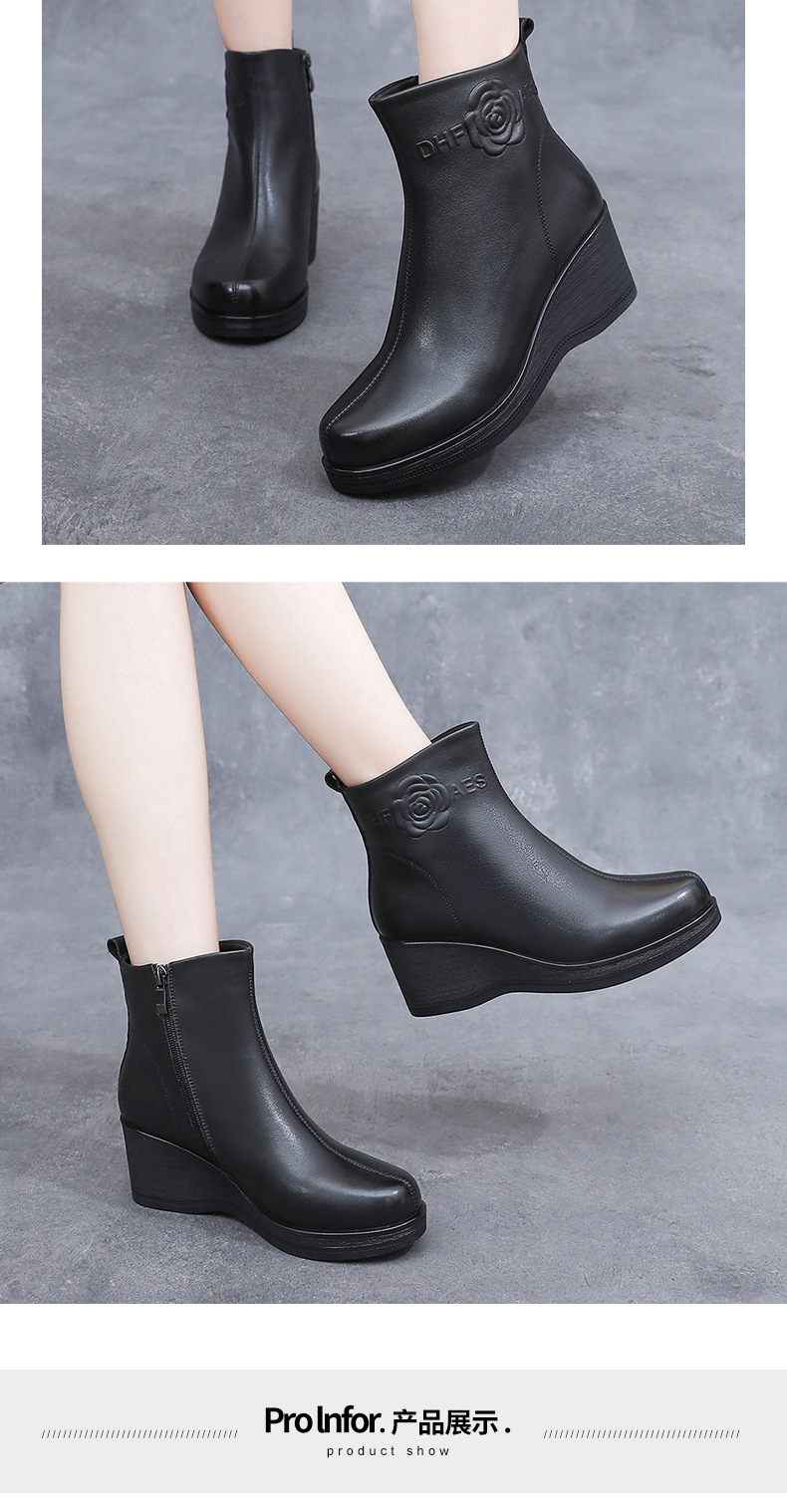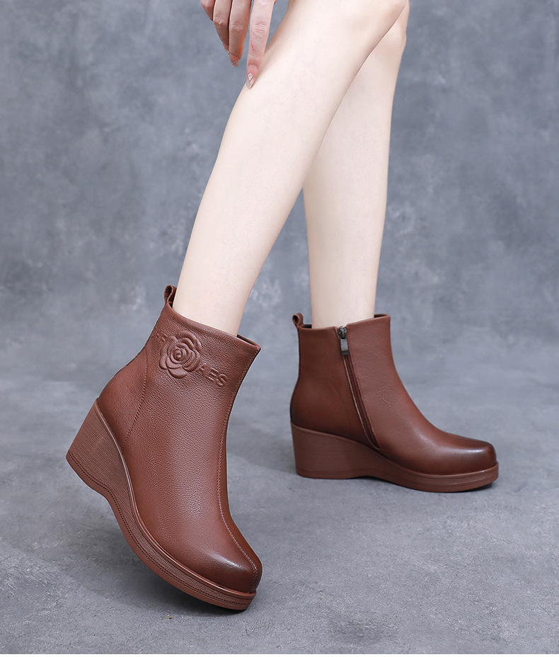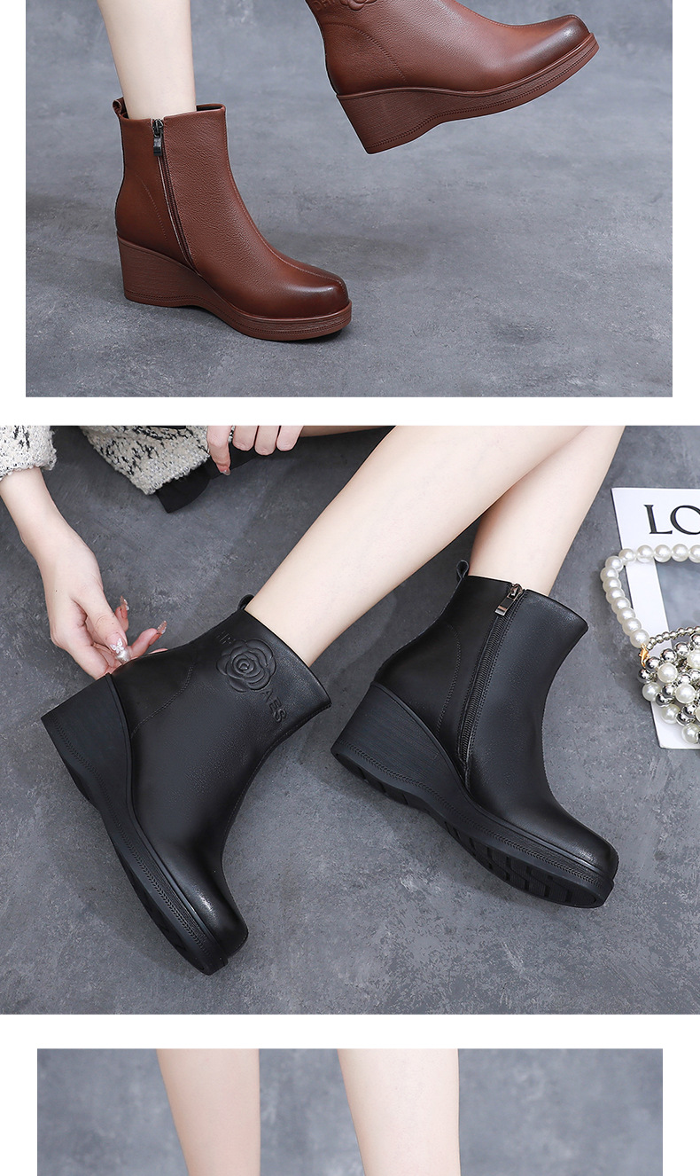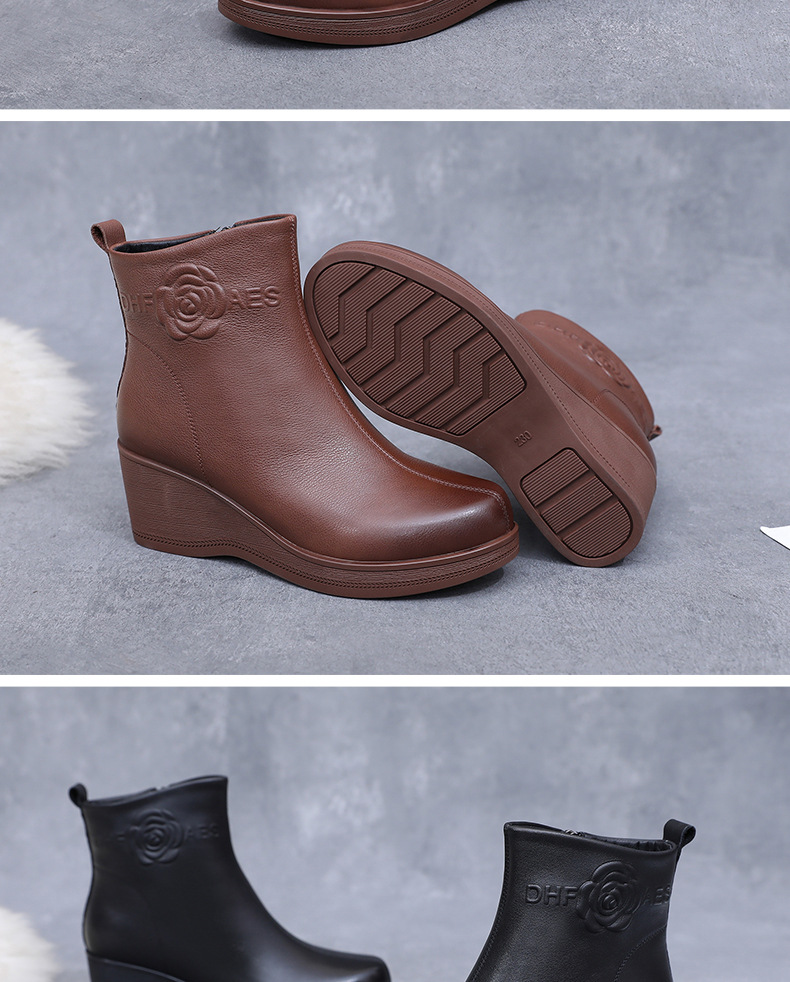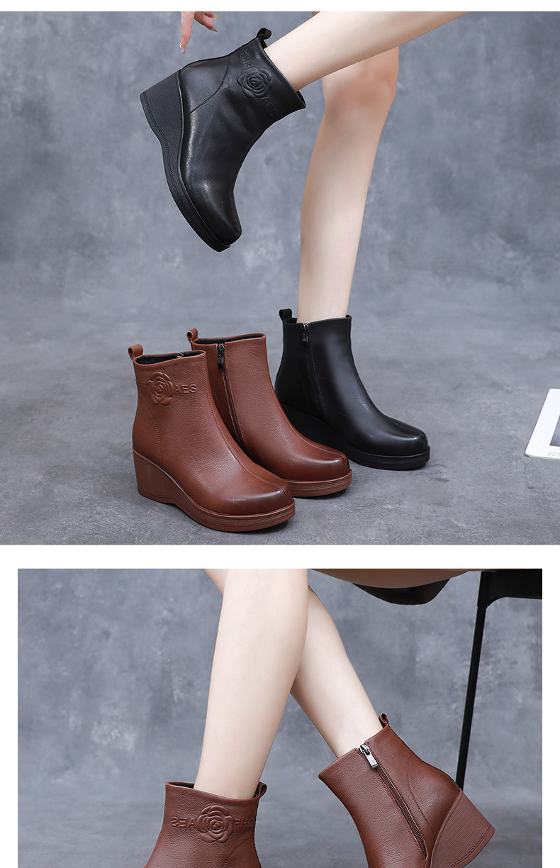 빈티지 디자인 센스 라운드 발가락 웨지 가죽 발목 부츠 여성의 2024 가을 및 겨울 새로운 탑 레이어 Cowhide 사이드 지퍼 대형 부츠스토어 가기