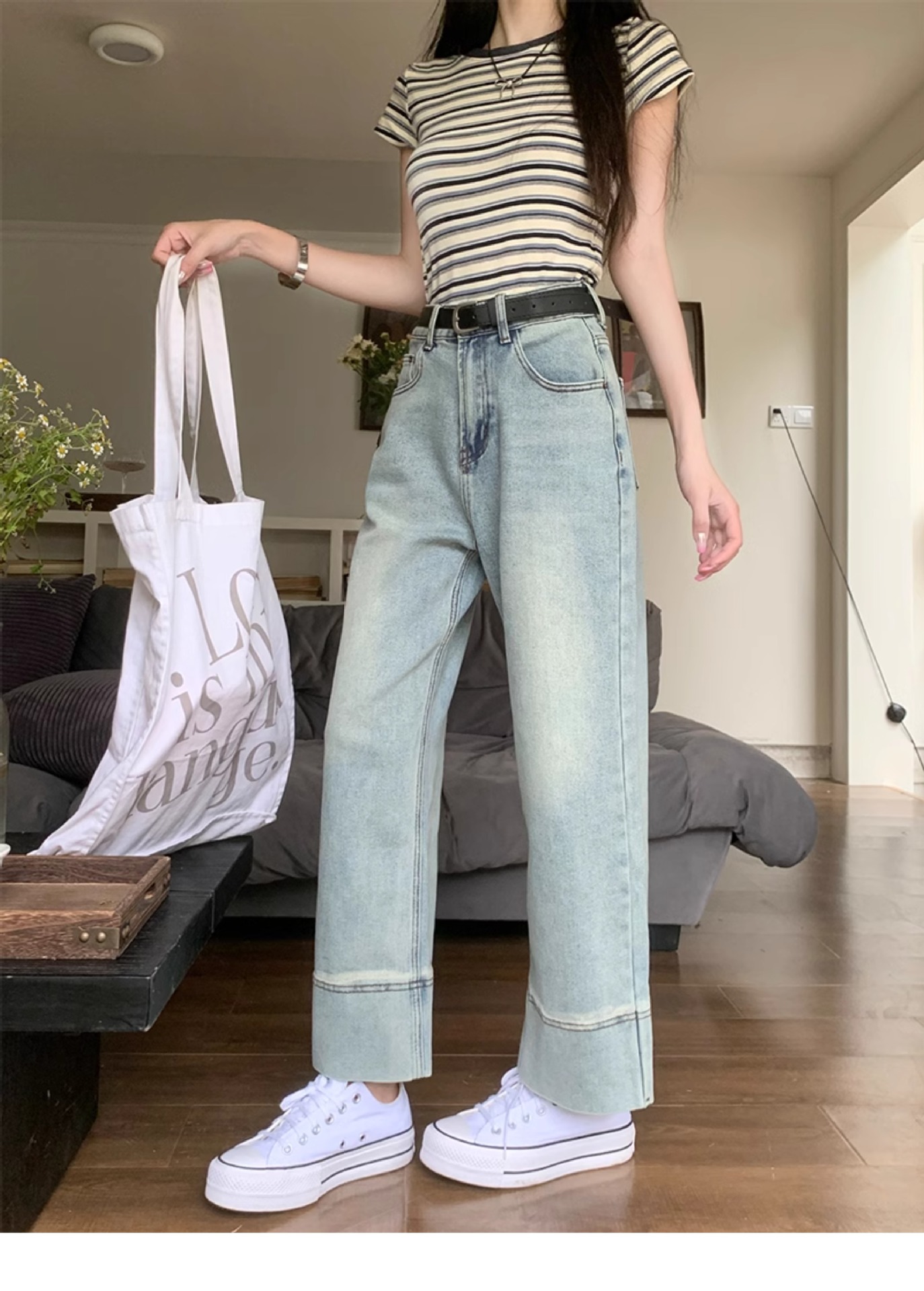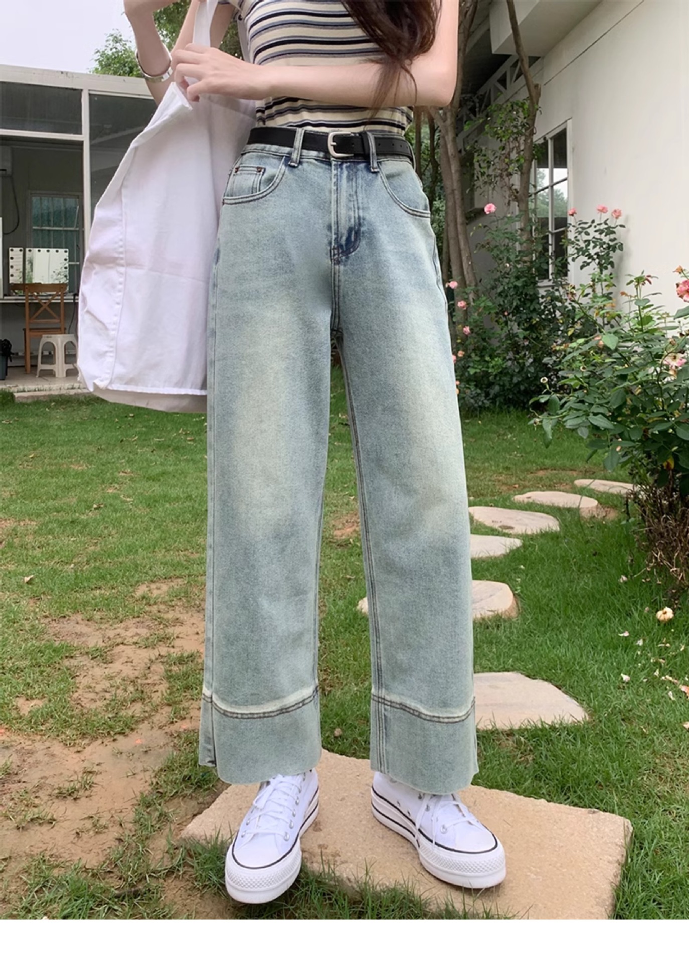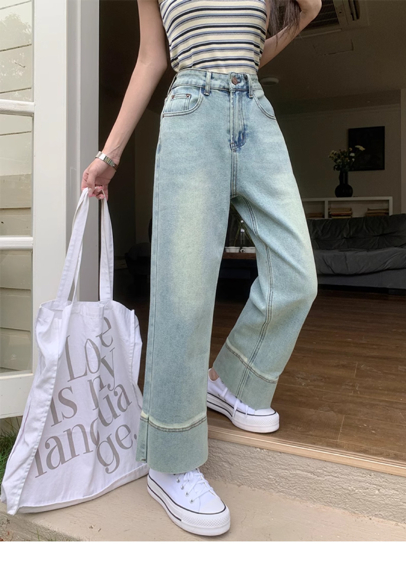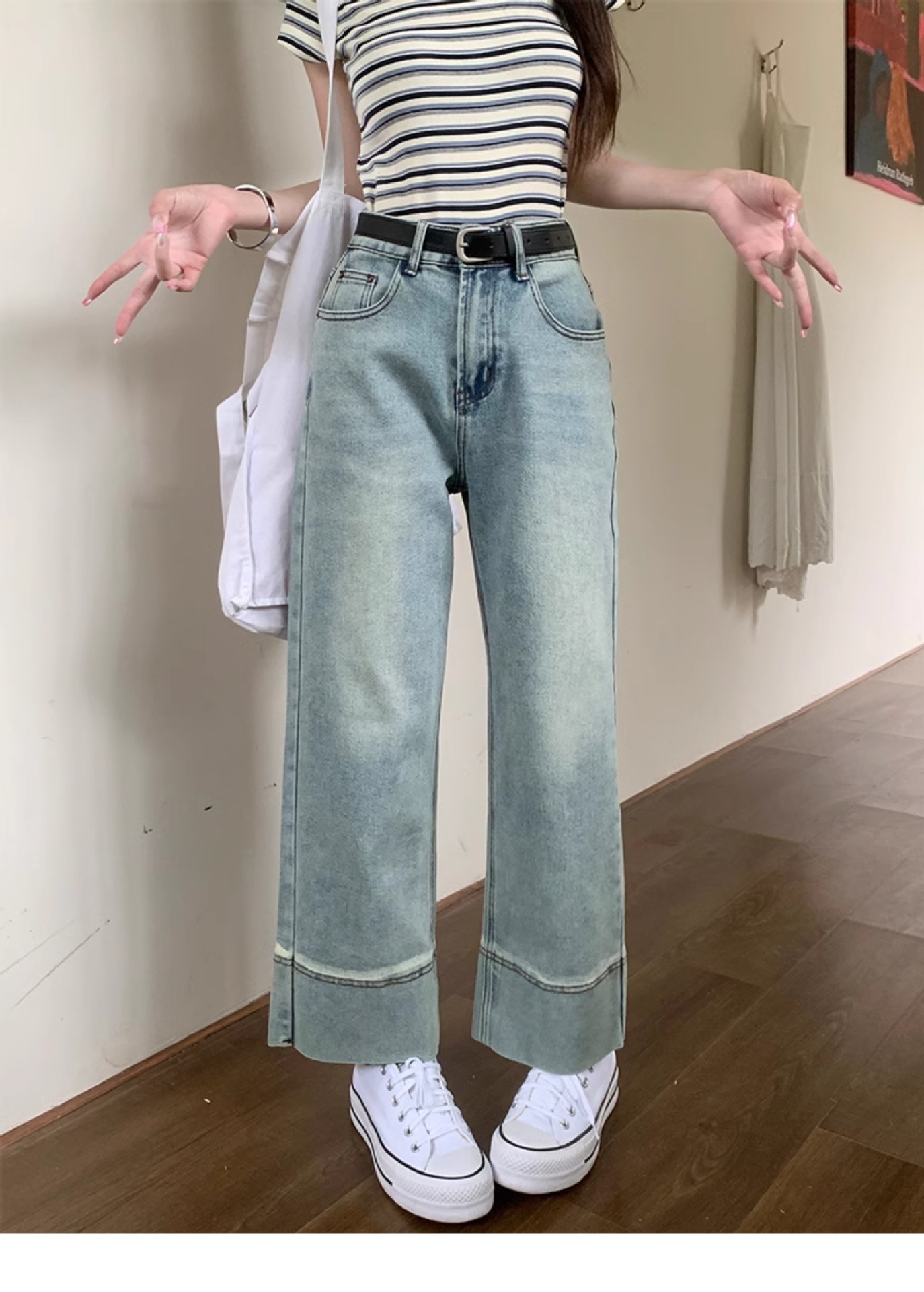 플러스 사이즈 빈티지 라이트 컬러 자른 청바지 여성의 가을 통통녀 높은 허리 슬리밍 느슨한 짧은 스트레이트 와이드 다리 바지스토어 가기