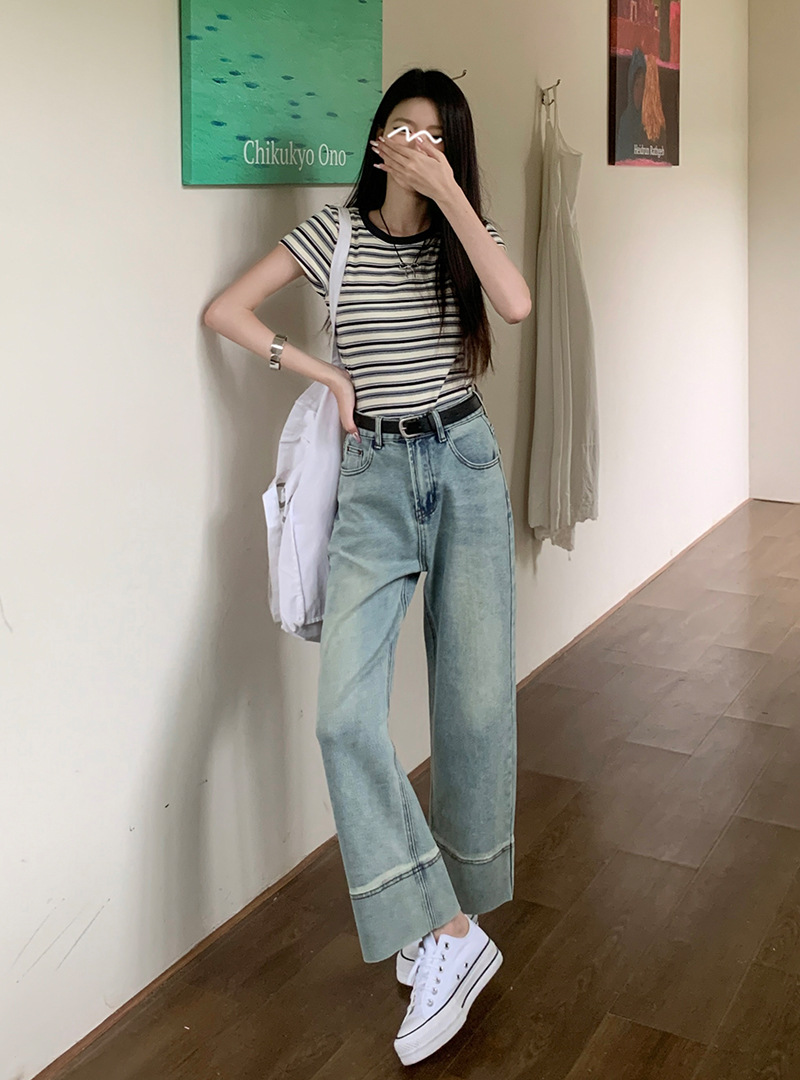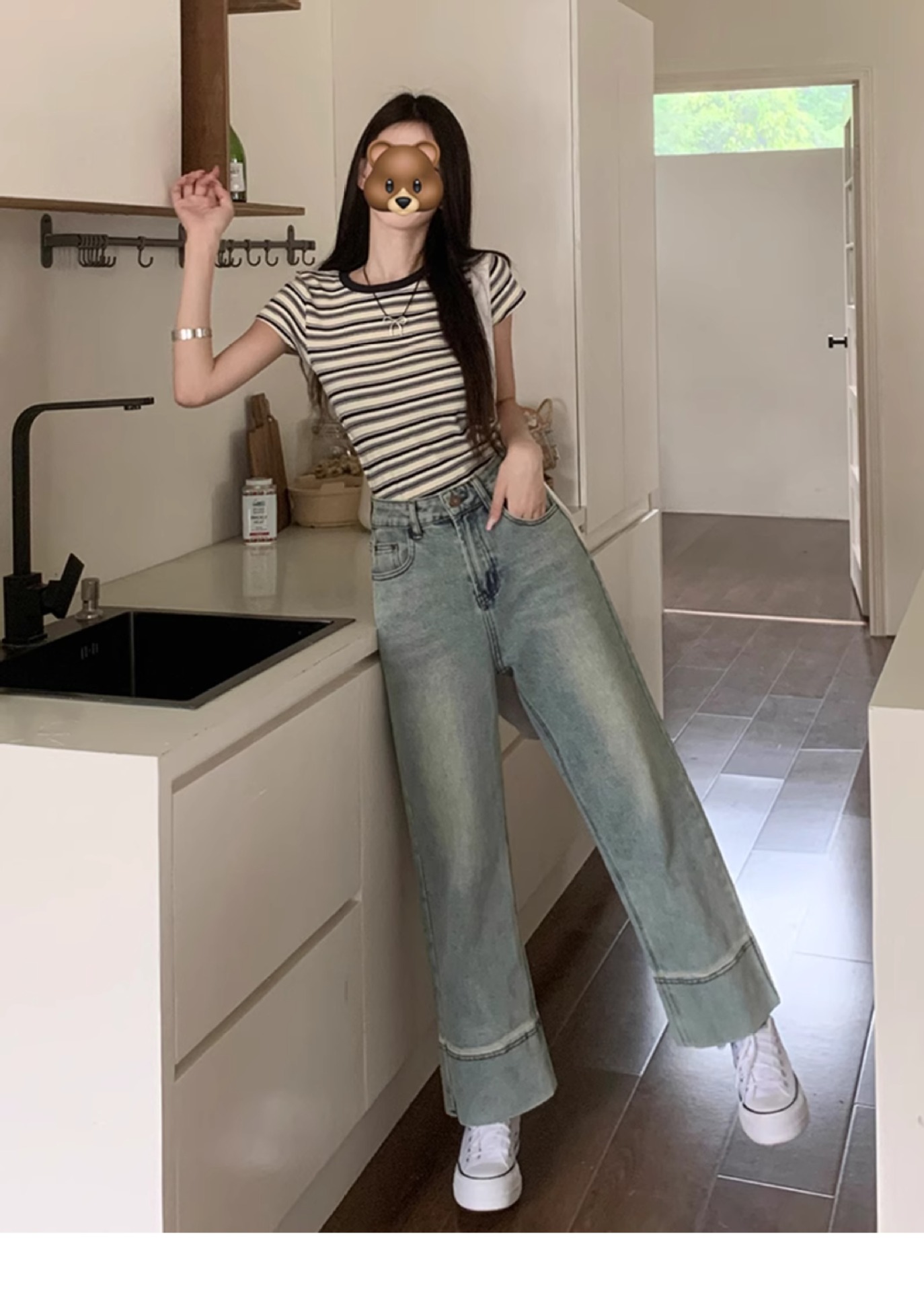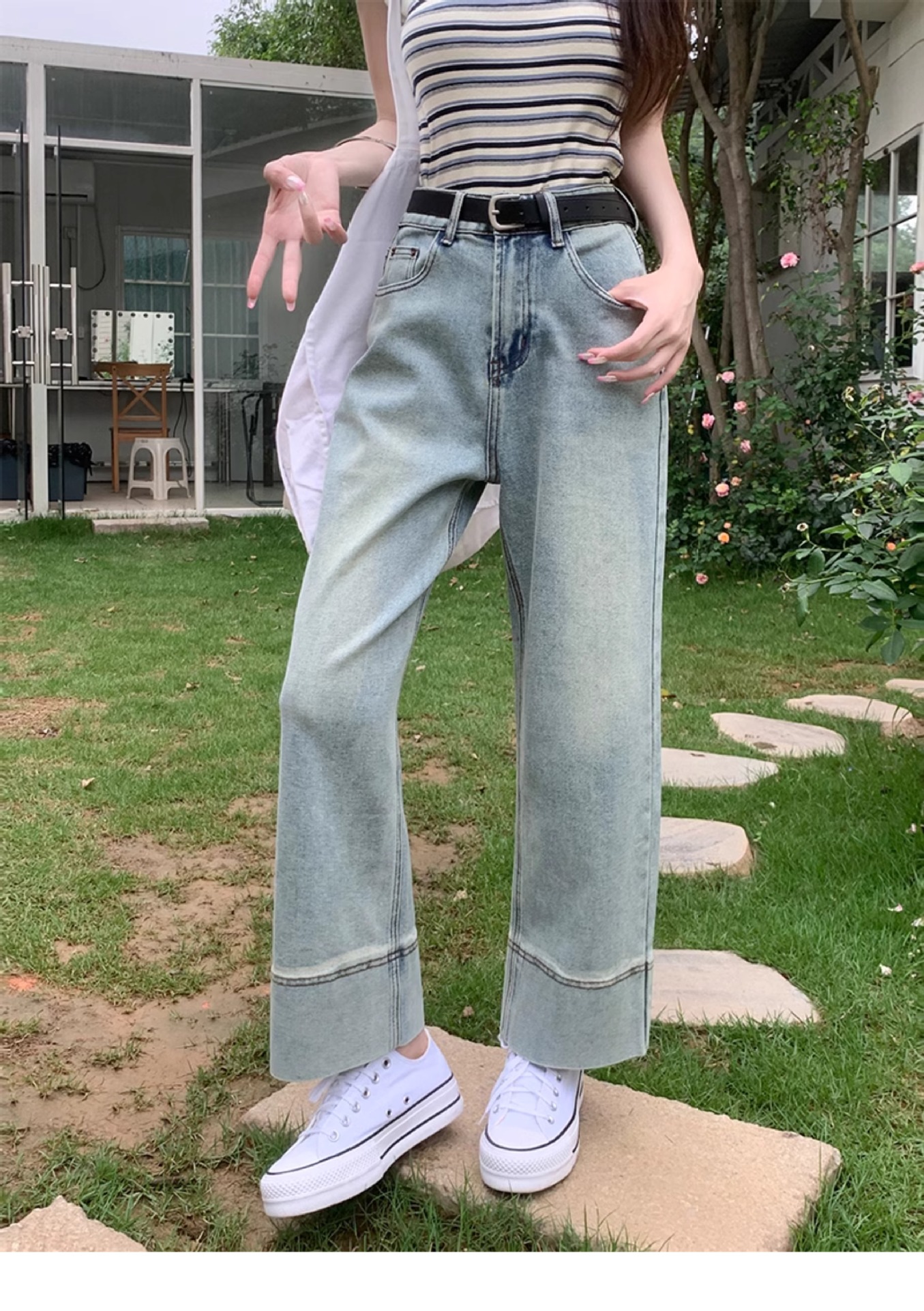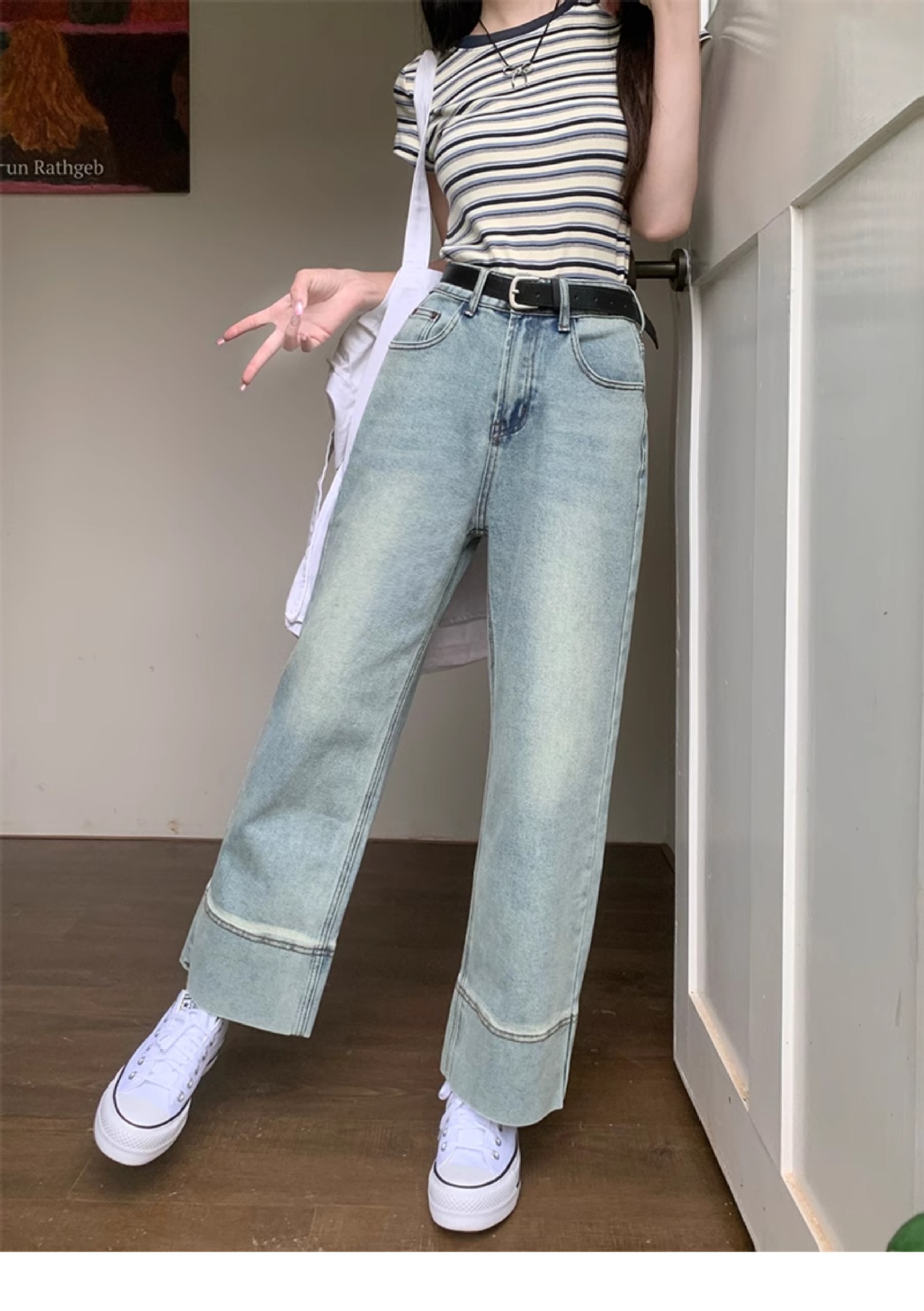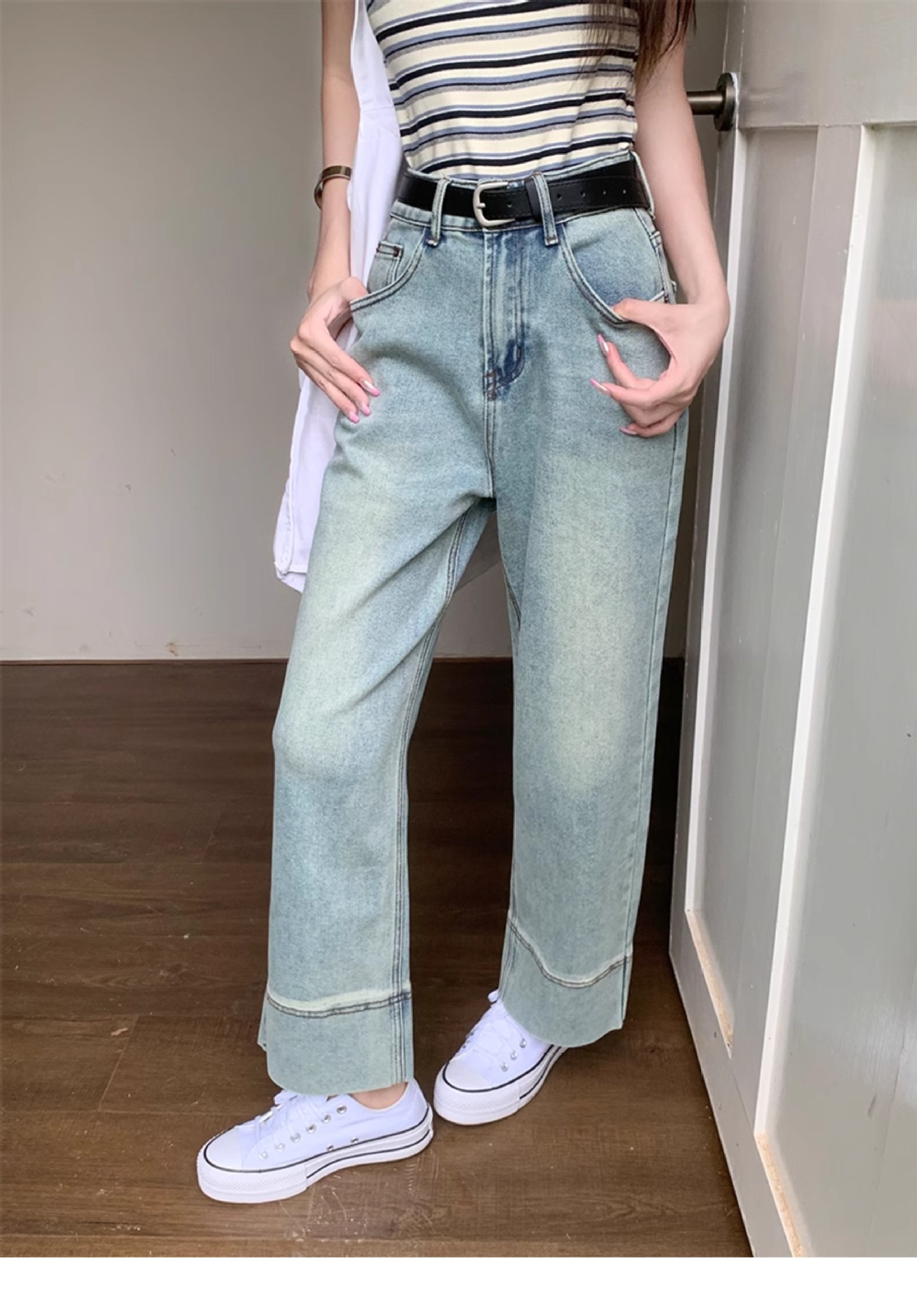 플러스 사이즈 빈티지 라이트 컬러 자른 청바지 여성의 가을 통통녀 높은 허리 슬리밍 느슨한 짧은 스트레이트 와이드 다리 바지스토어 가기