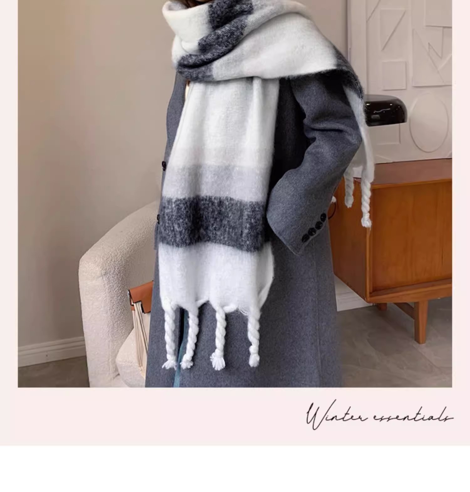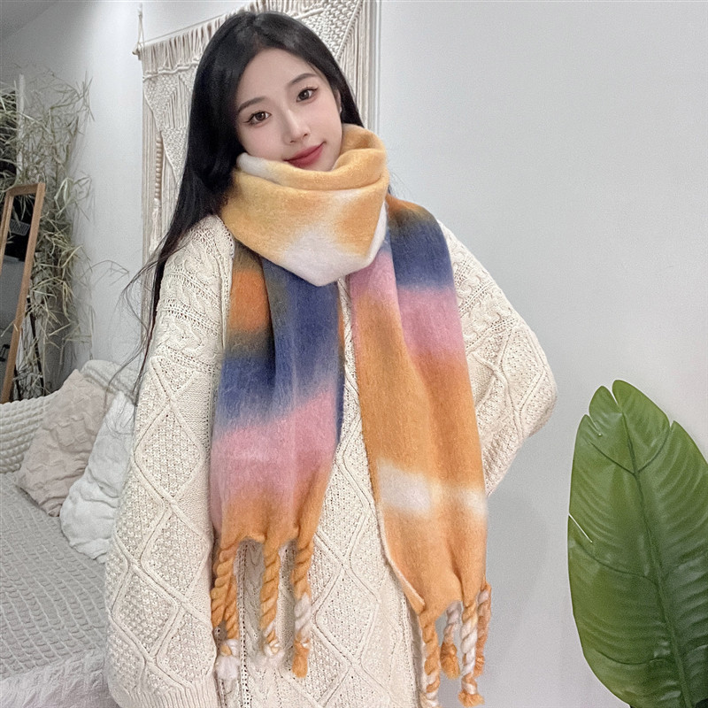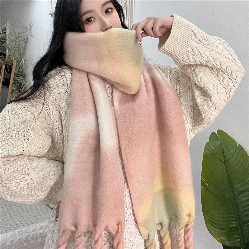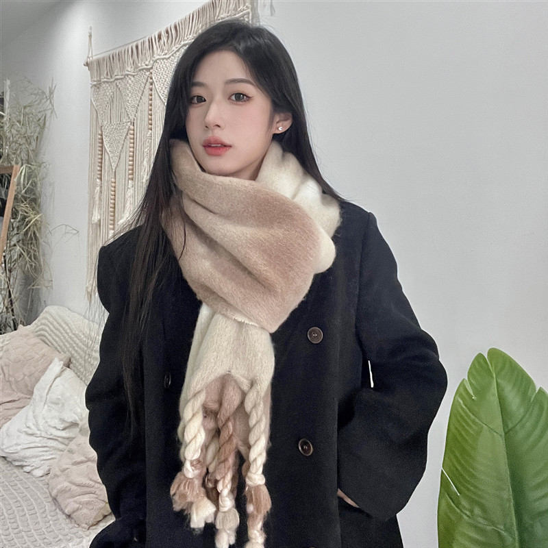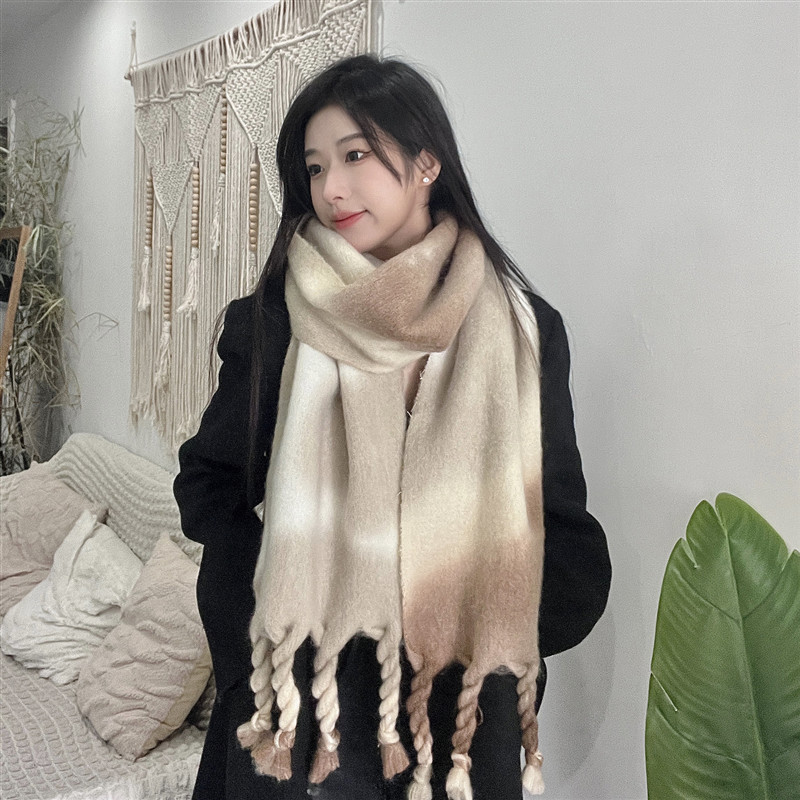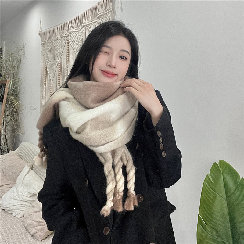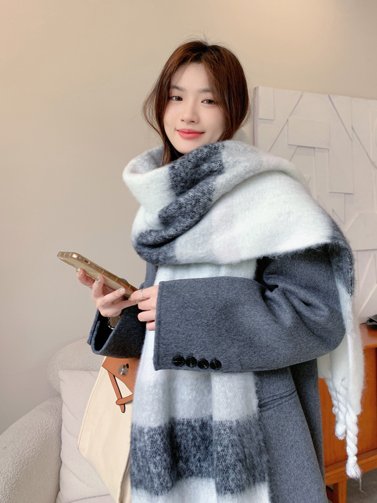 겨울 여성용 흑백 그라데이션 스카프, 두껍고 길어진 버전, 따뜻한 숄, 모헤어 모조 캐시미어 태슬 스카프스토어 가기