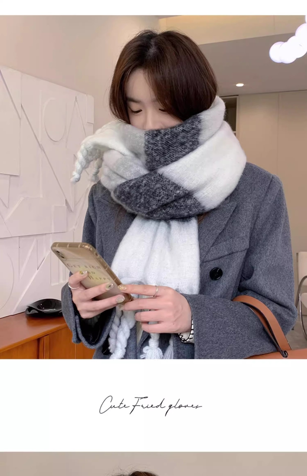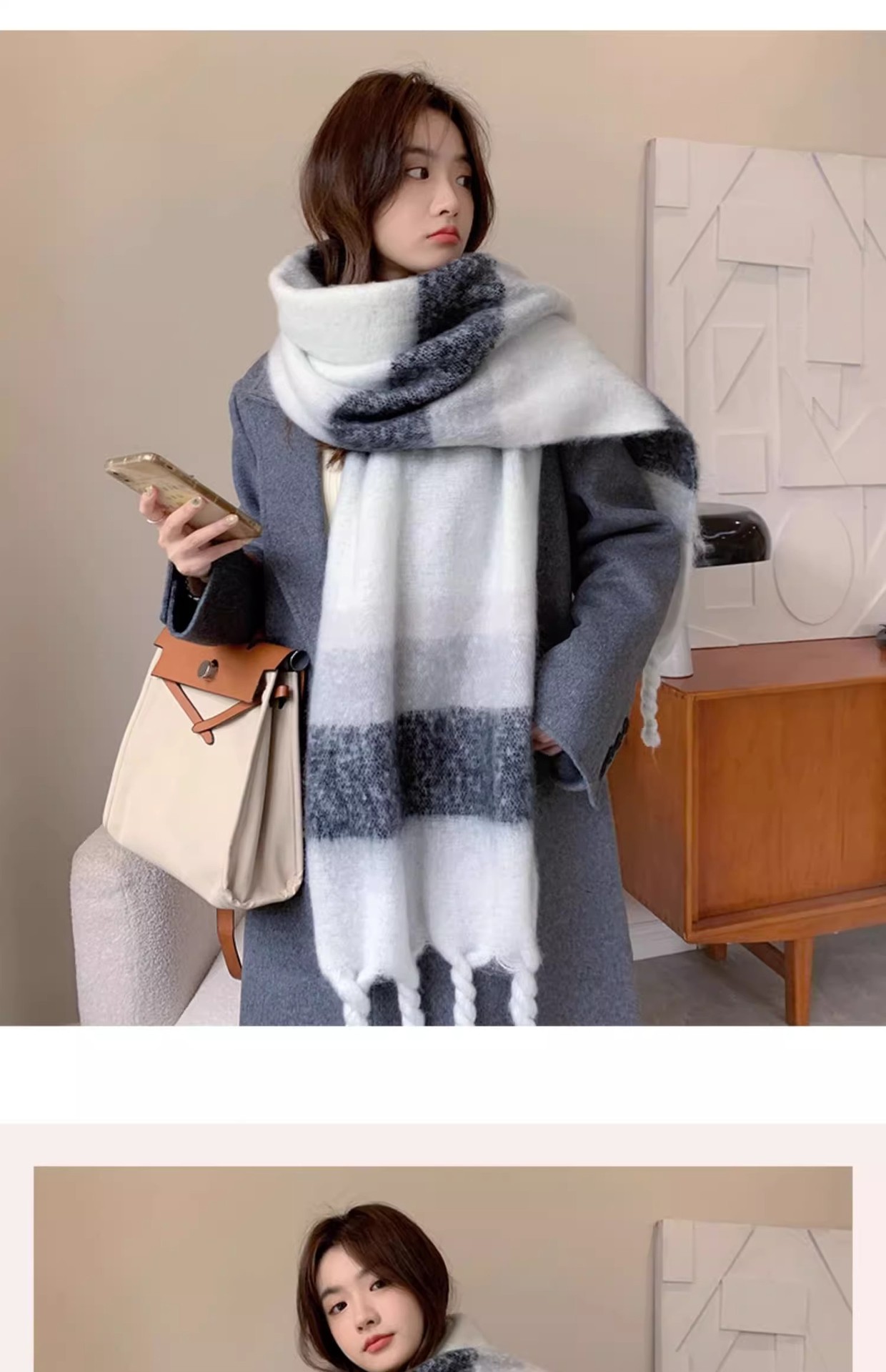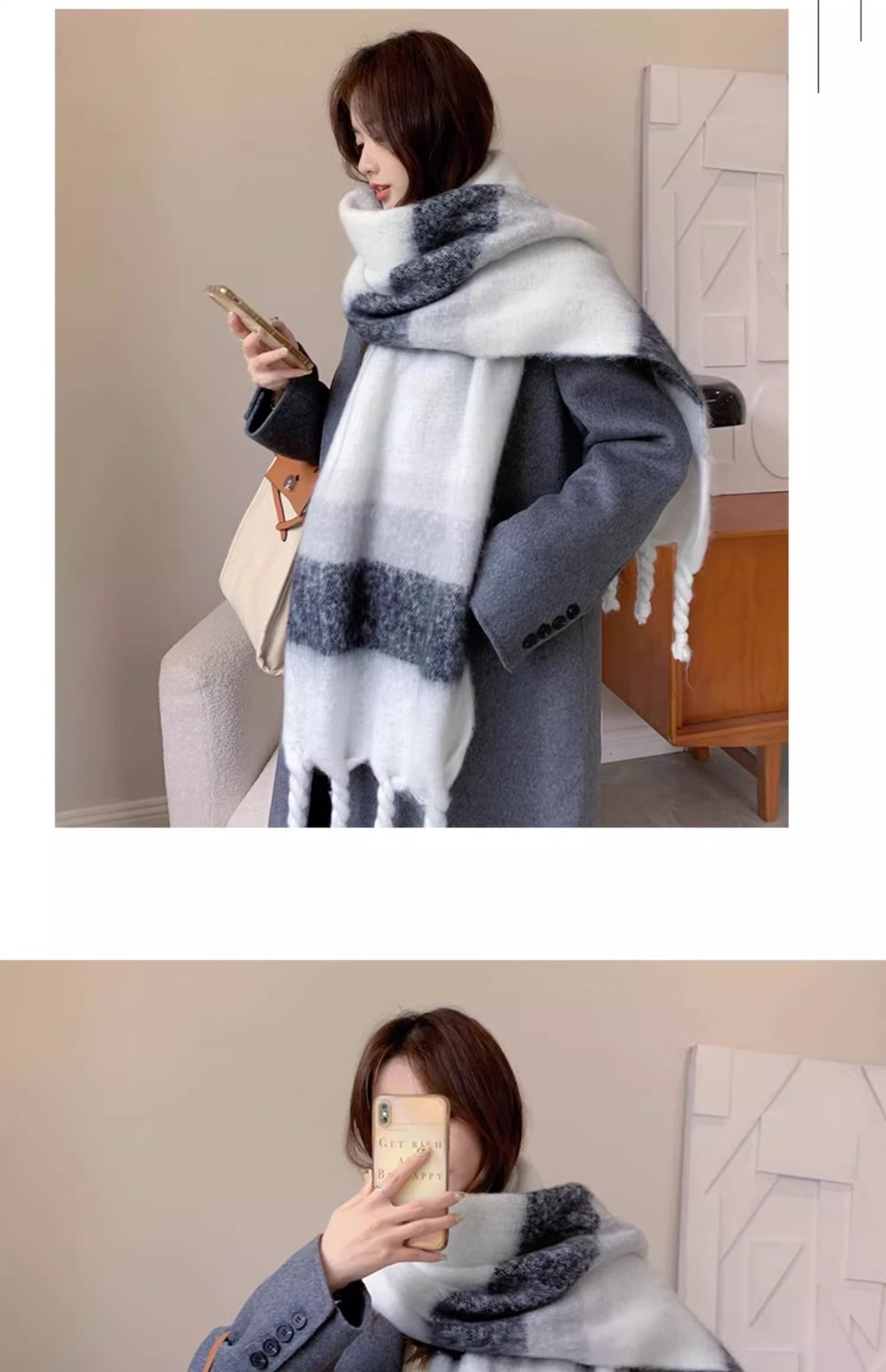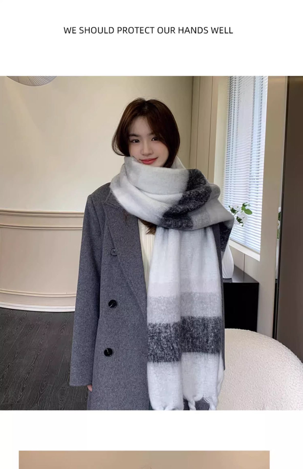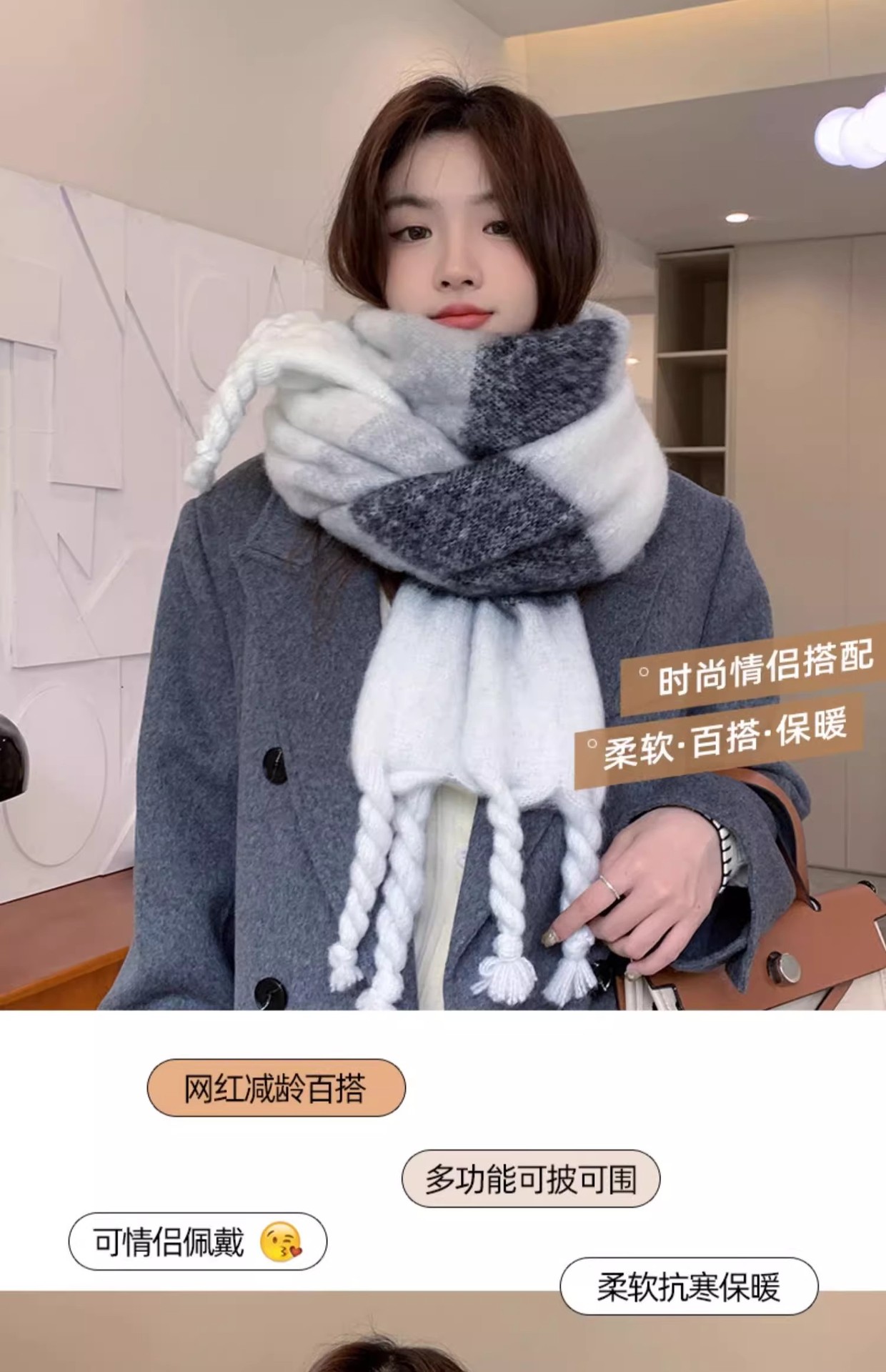 겨울 여성용 흑백 그라데이션 스카프, 두껍고 길어진 버전, 따뜻한 숄, 모헤어 모조 캐시미어 태슬 스카프스토어 가기