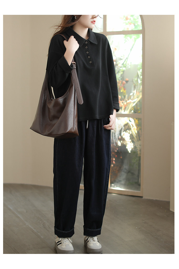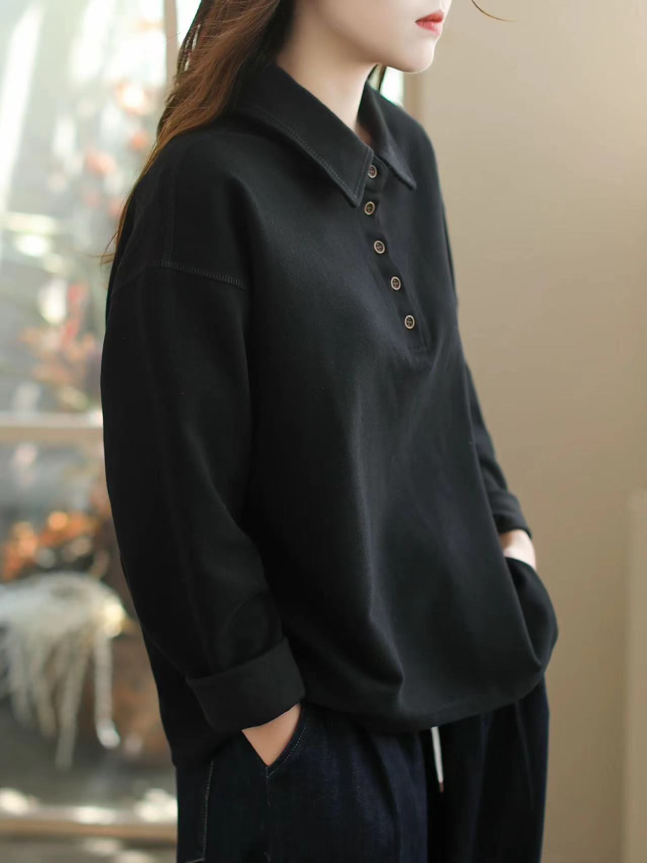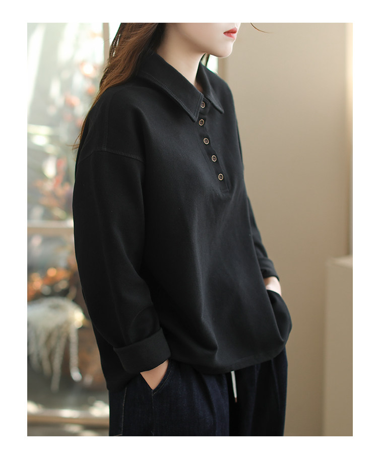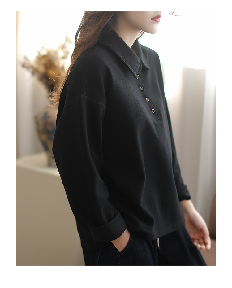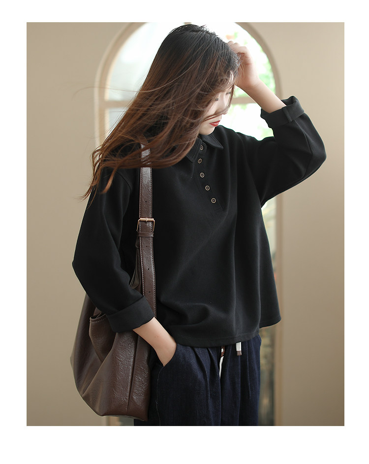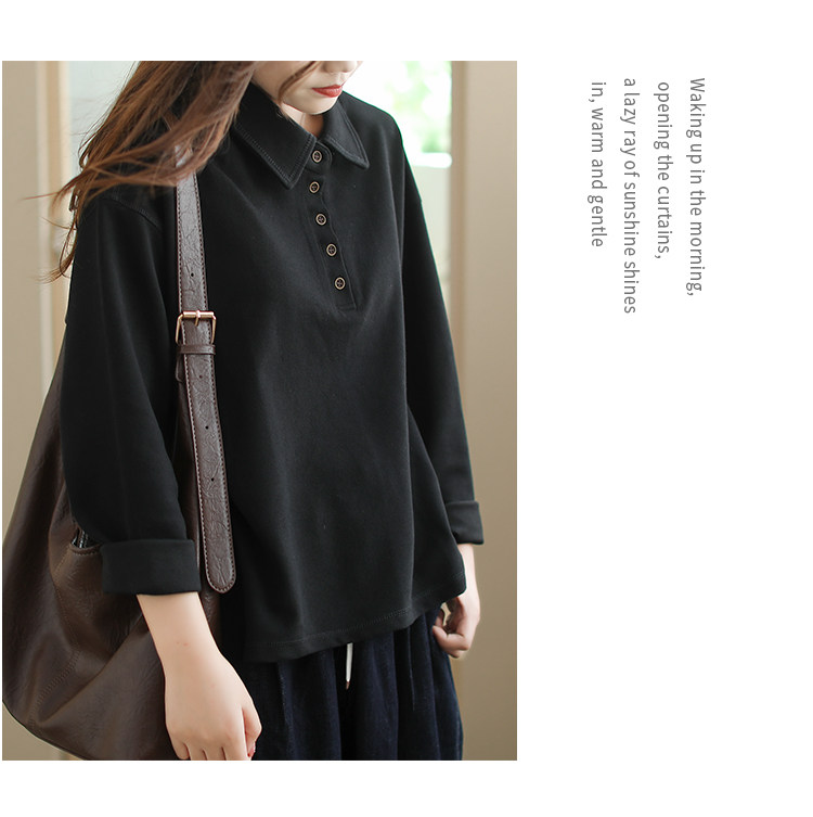 가을 새 땀 여성의 검은 느슨한 원래 예술적 면 캐주얼 통근 패션 여성 탑 2480