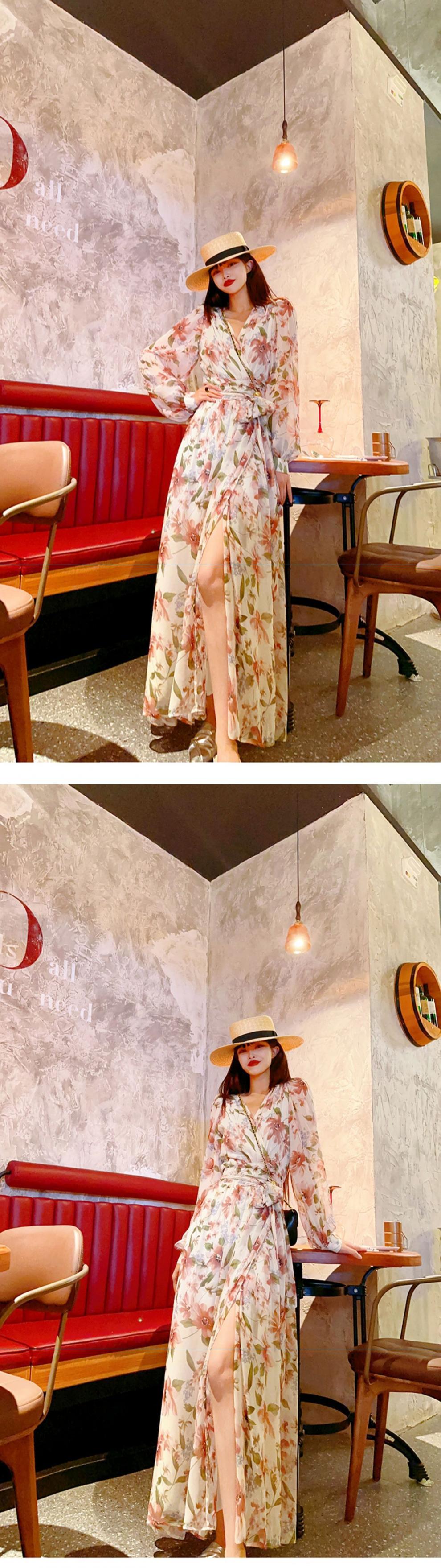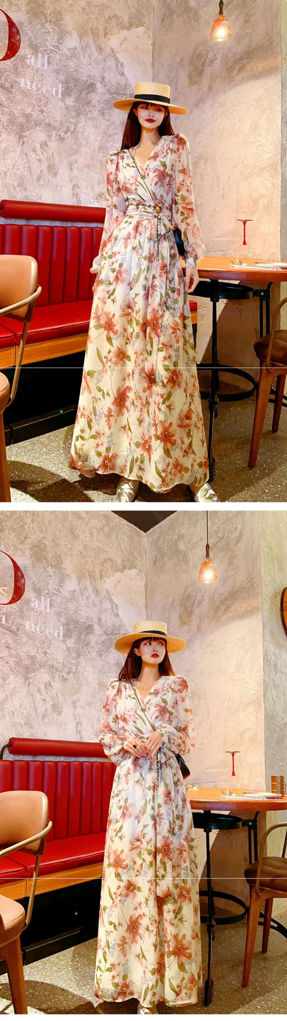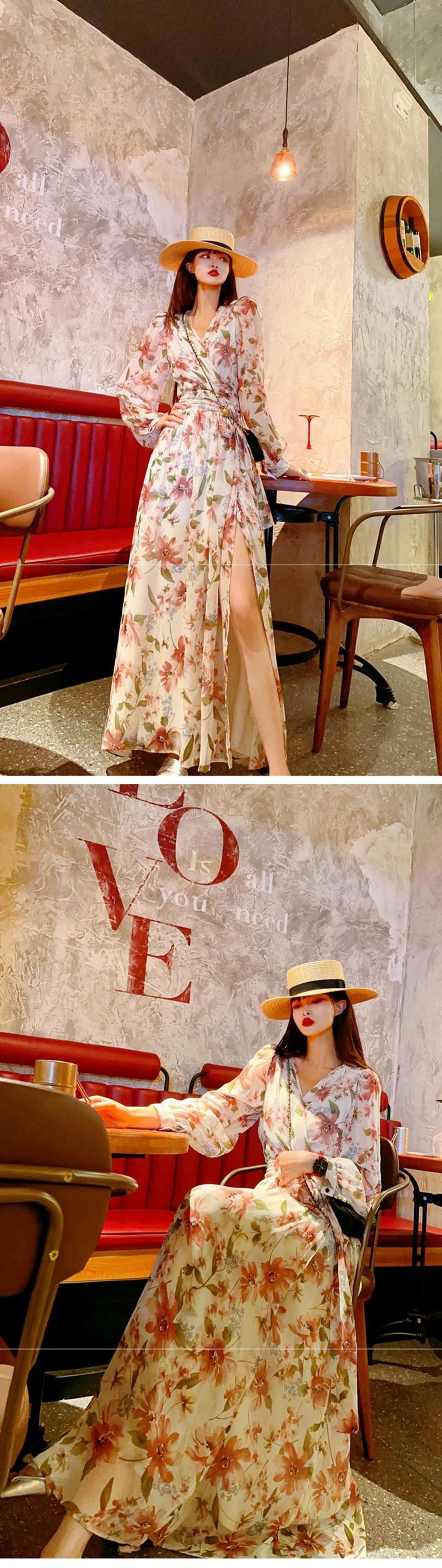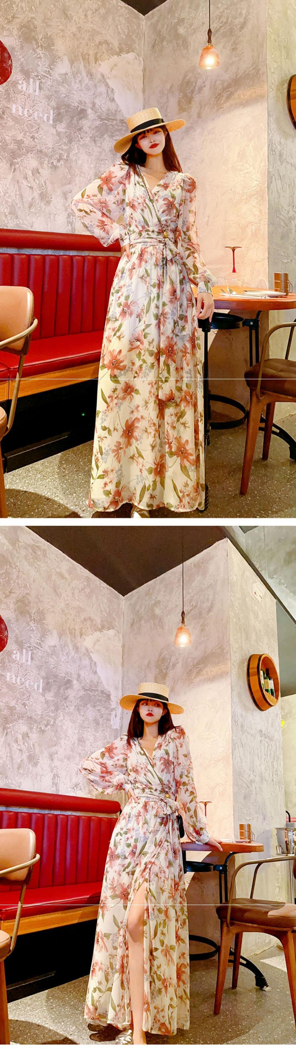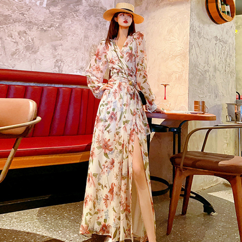 캐주얼 타이트 허리 프렌치 스트랩 플로랄 V-넥 원피스 슬림 레트로 쉬폰 슬릿 긴 소매 엄마를위한 섹시스토어 가기
