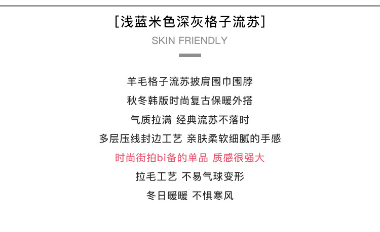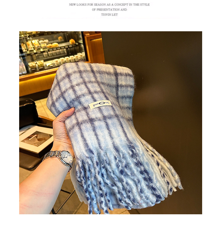 • 울 라이트 블루 베이지 다크 그레이 체크 무늬 태슬