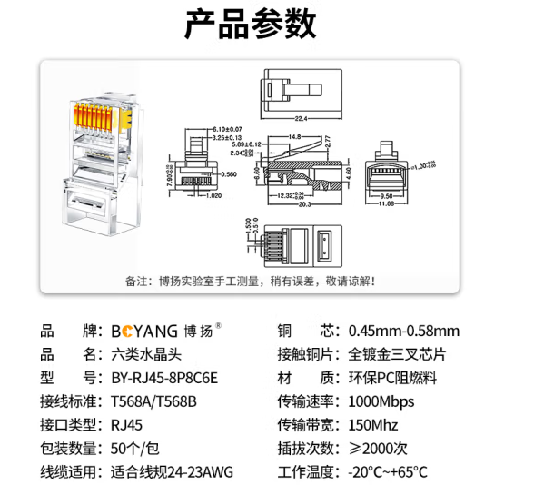 博扬(BOYANG)六类RJ45水晶头 CAT6类千兆网线水晶头 工程级非屏蔽连接头(50U镀金)100/盒 BY-RJ45-8P8C6E*1 合格证*1