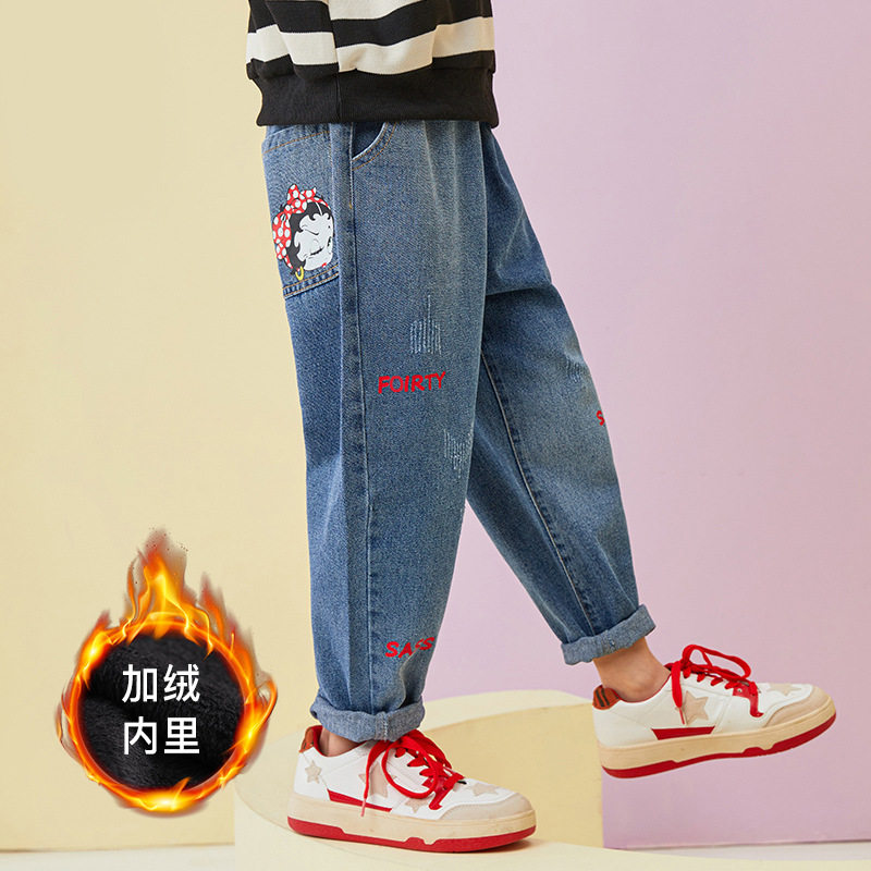베티 아동복 가을 겨울 여아 스트레이트 데님 팬츠 2024 한국판 여아용 가을 긴바지 플리스 안감