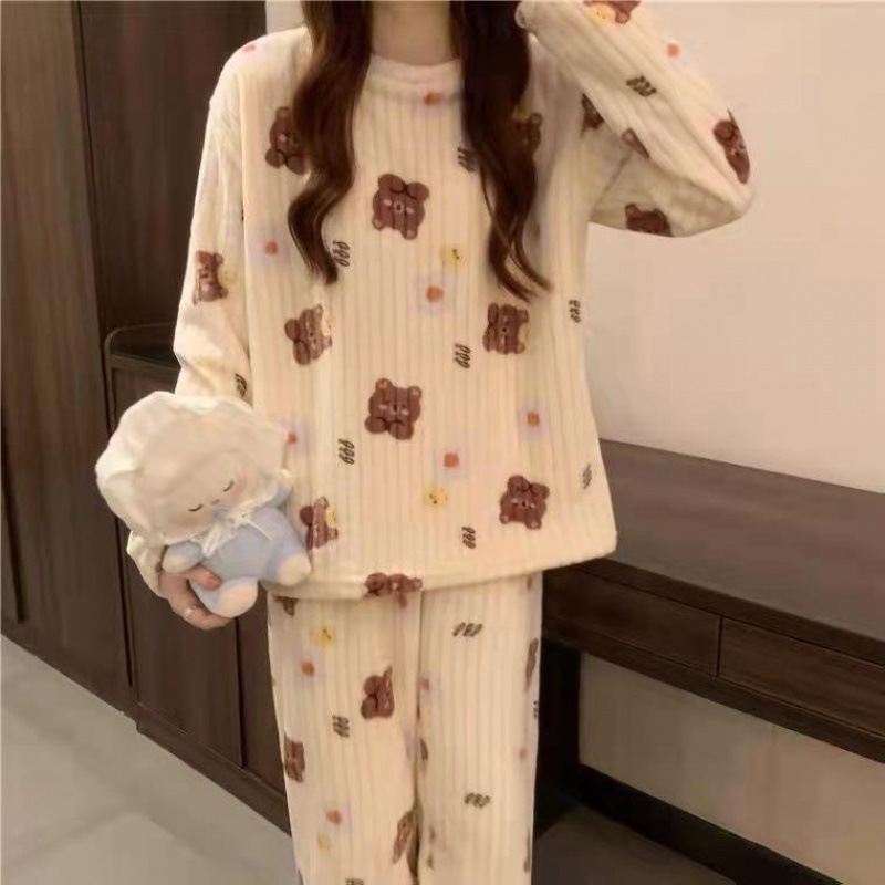 가을과 겨울 곰 인쇄 산호 양털 파자마 세트 여성용 느슨한 따뜻한 홈 착용 긴팔 투피스 세트