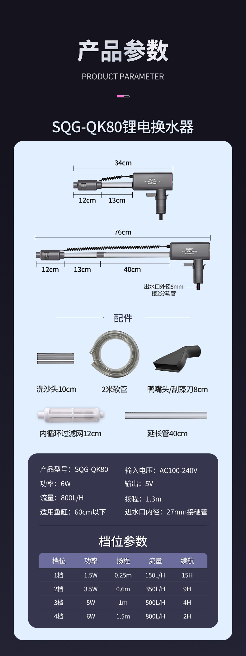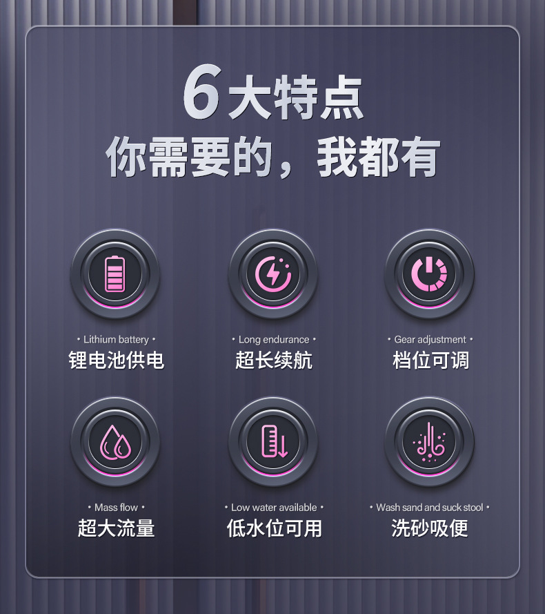 • [리튬 배터리 충전식, 다중 속도 조절 가능 18W] - 유량 1800L/H( 5m 호스 포함)