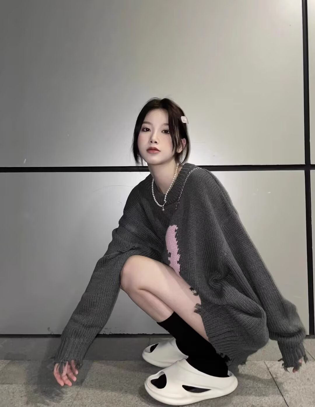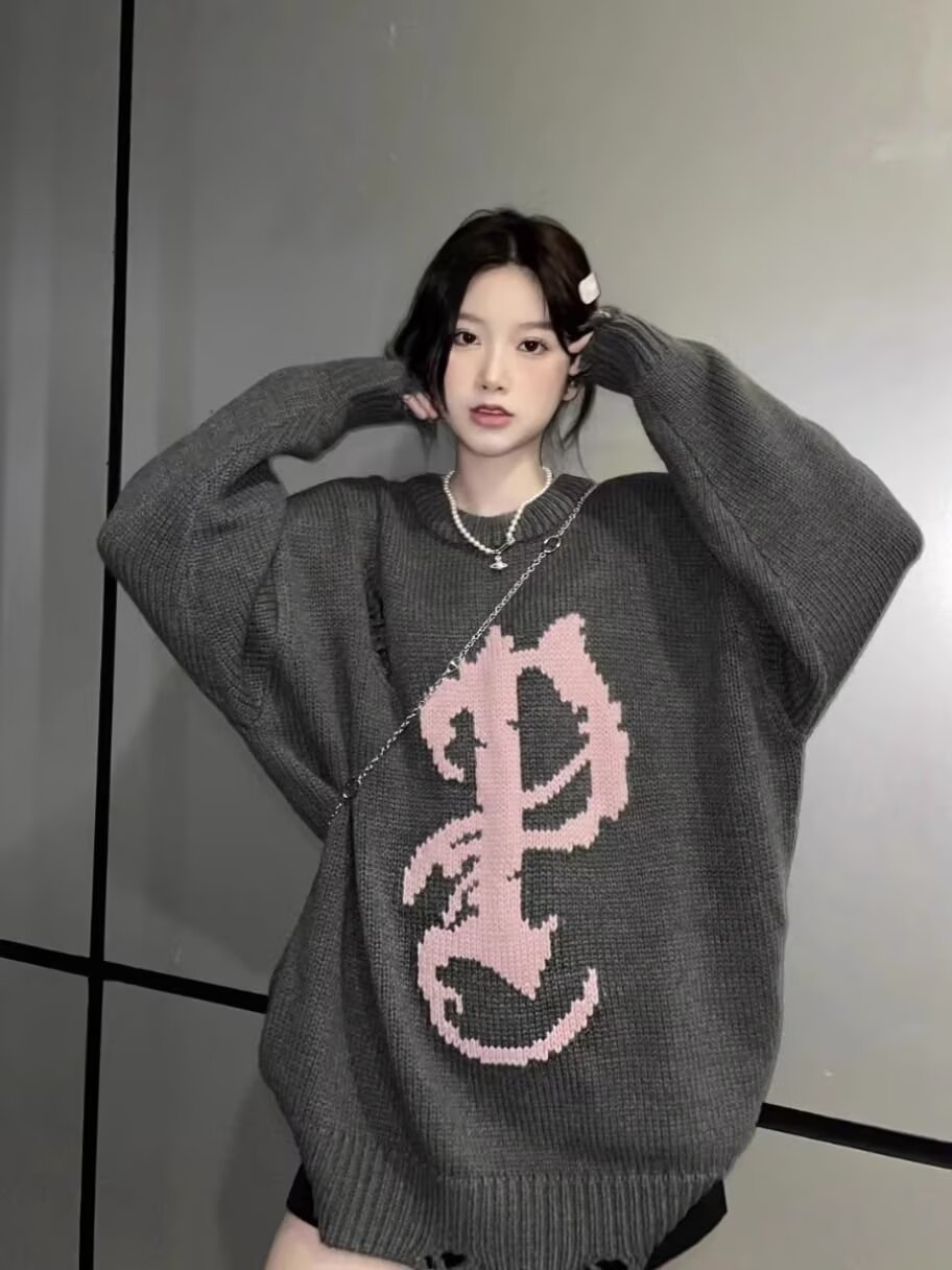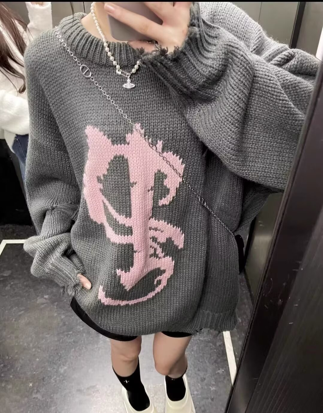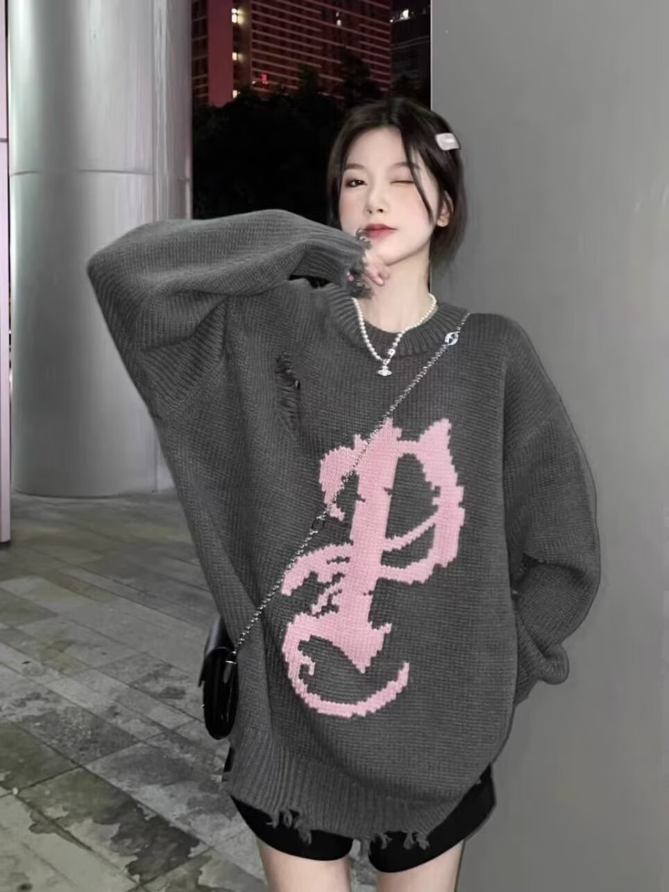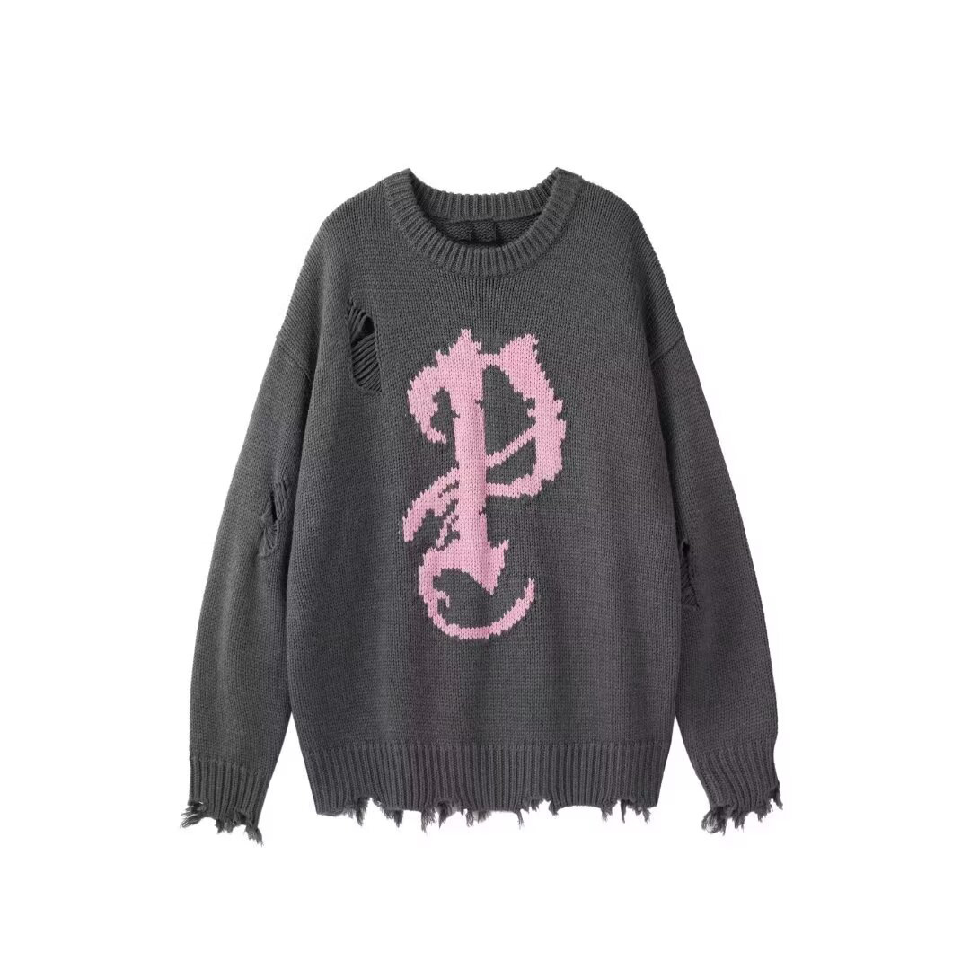 인터넷 연예인 패션 브랜드 Ins 니트 스웨터 편지 하이 스트리트 불규칙한 파괴 풀린 올 매치 남자 크루 넥 스웨터