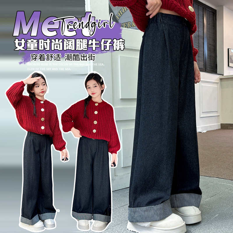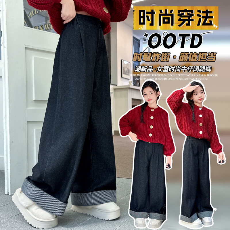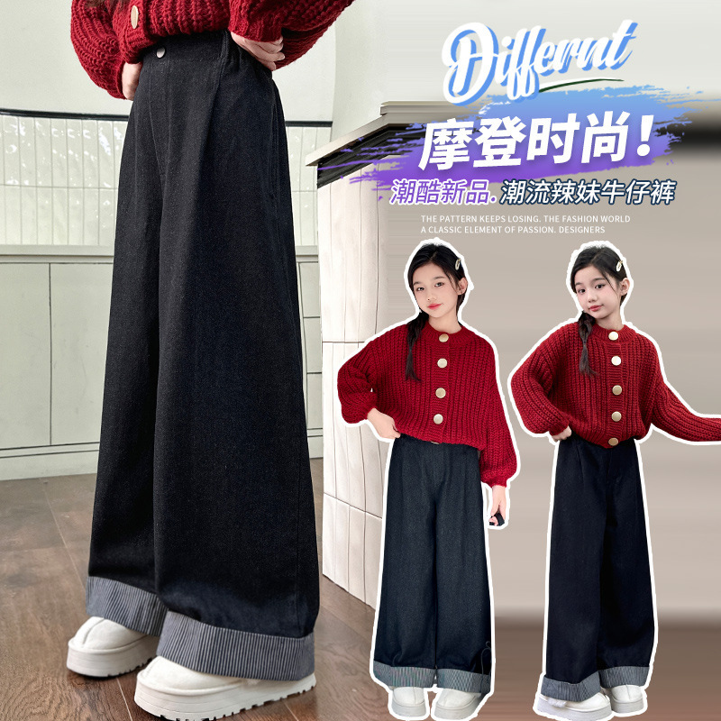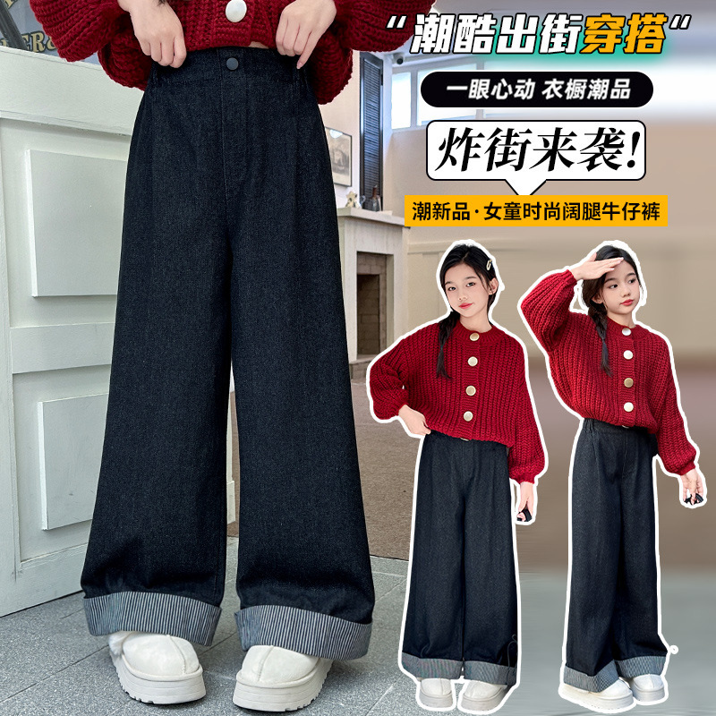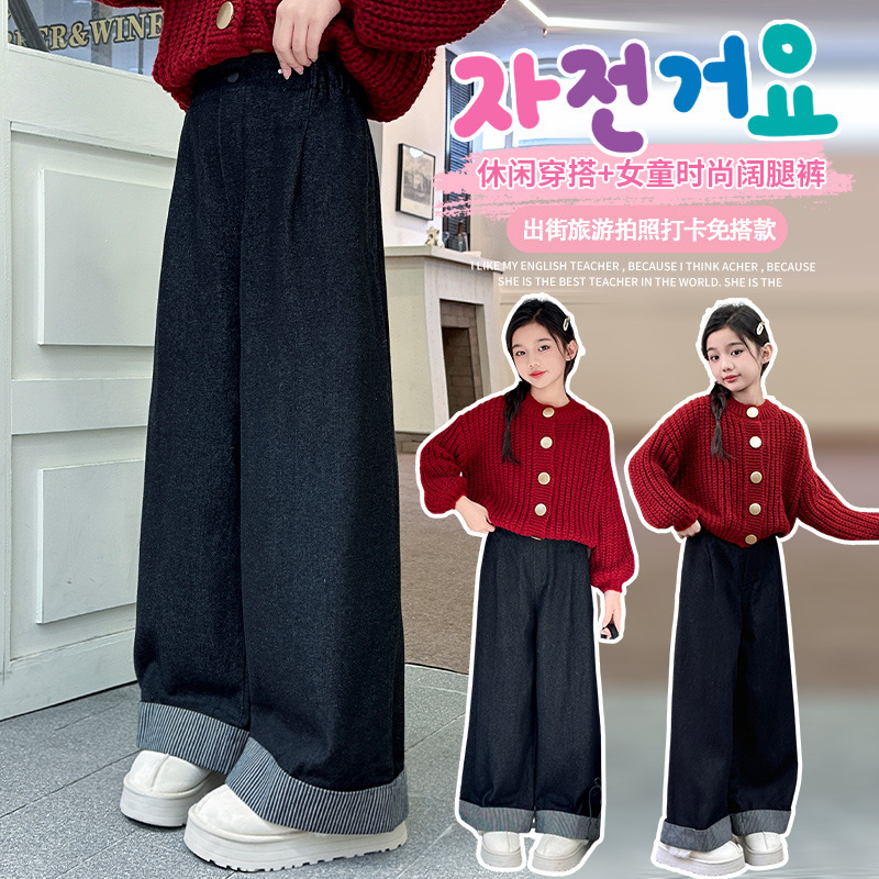 소녀 청바지 가을 착용 한국 스타일 소녀 유행 느슨한 넓은 다리 바지 어린이 봄과 가을 컬링 스트레이트 팬츠스토어 가기