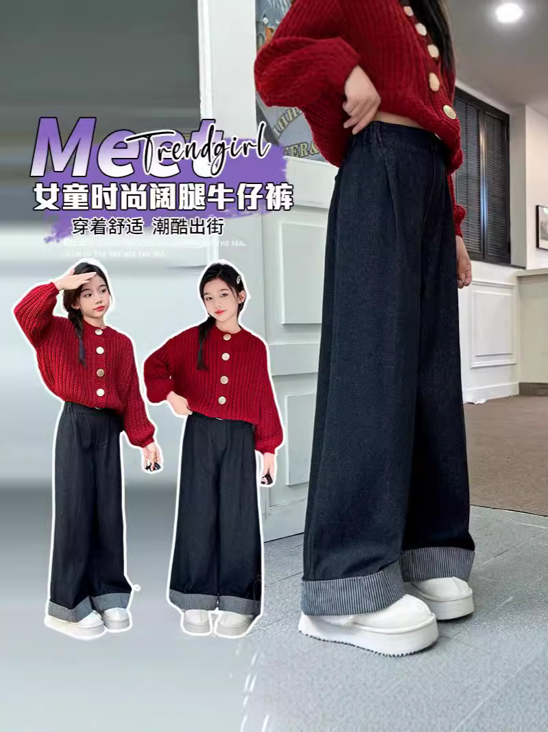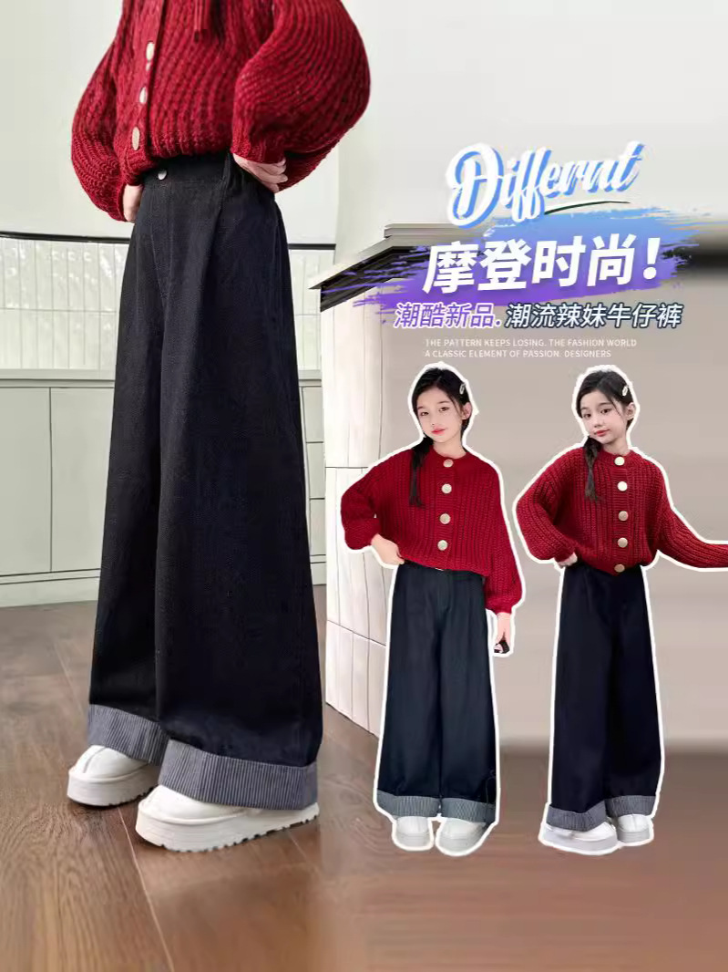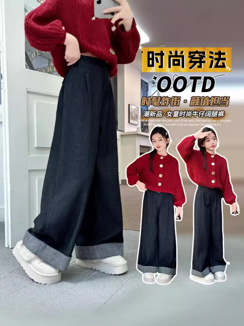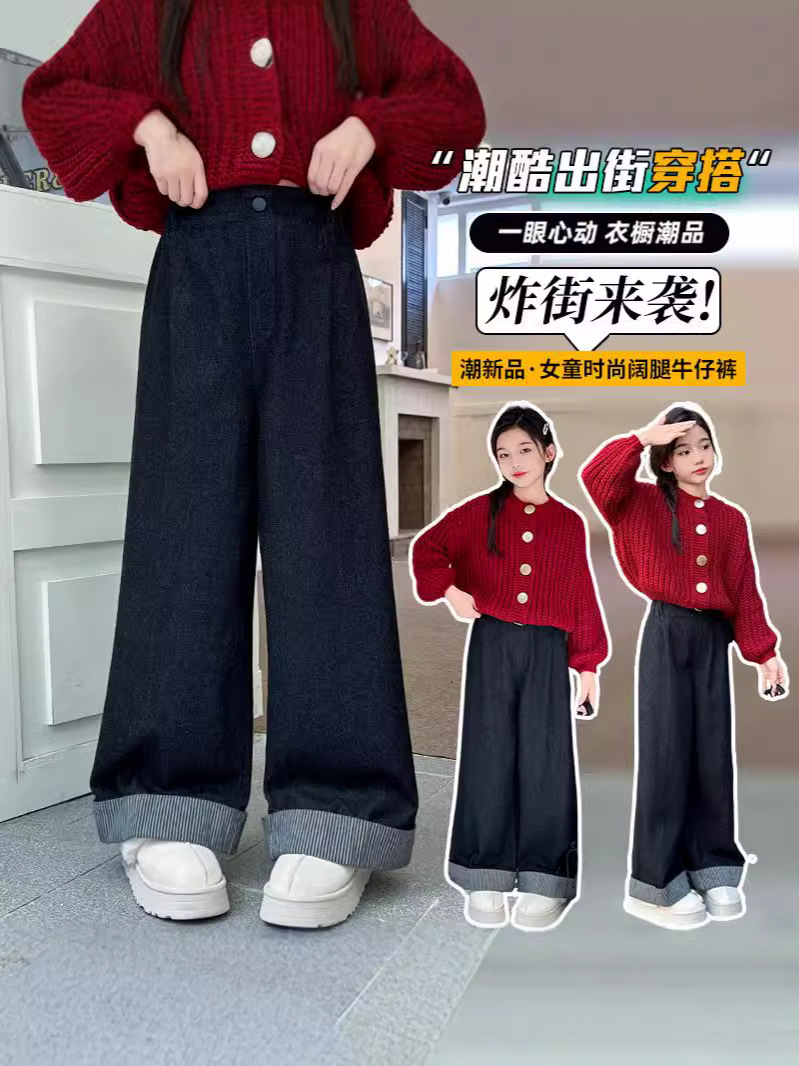 소녀 청바지 가을 착용 한국 스타일 소녀 유행 느슨한 넓은 다리 바지 어린이 봄과 가을 컬링 스트레이트 팬츠스토어 가기