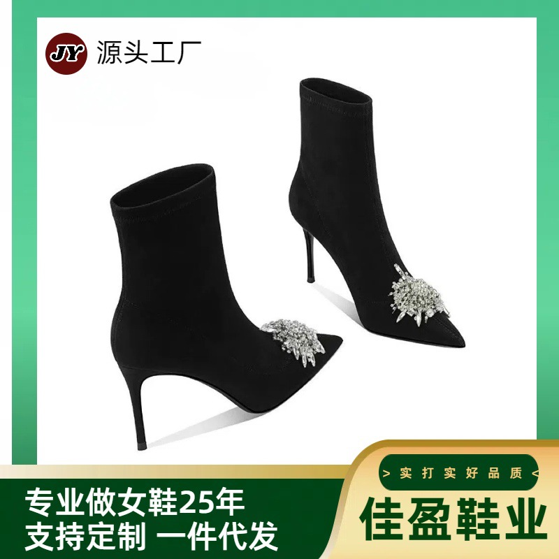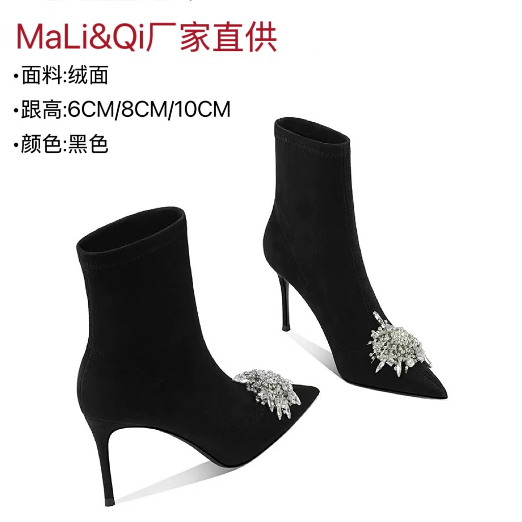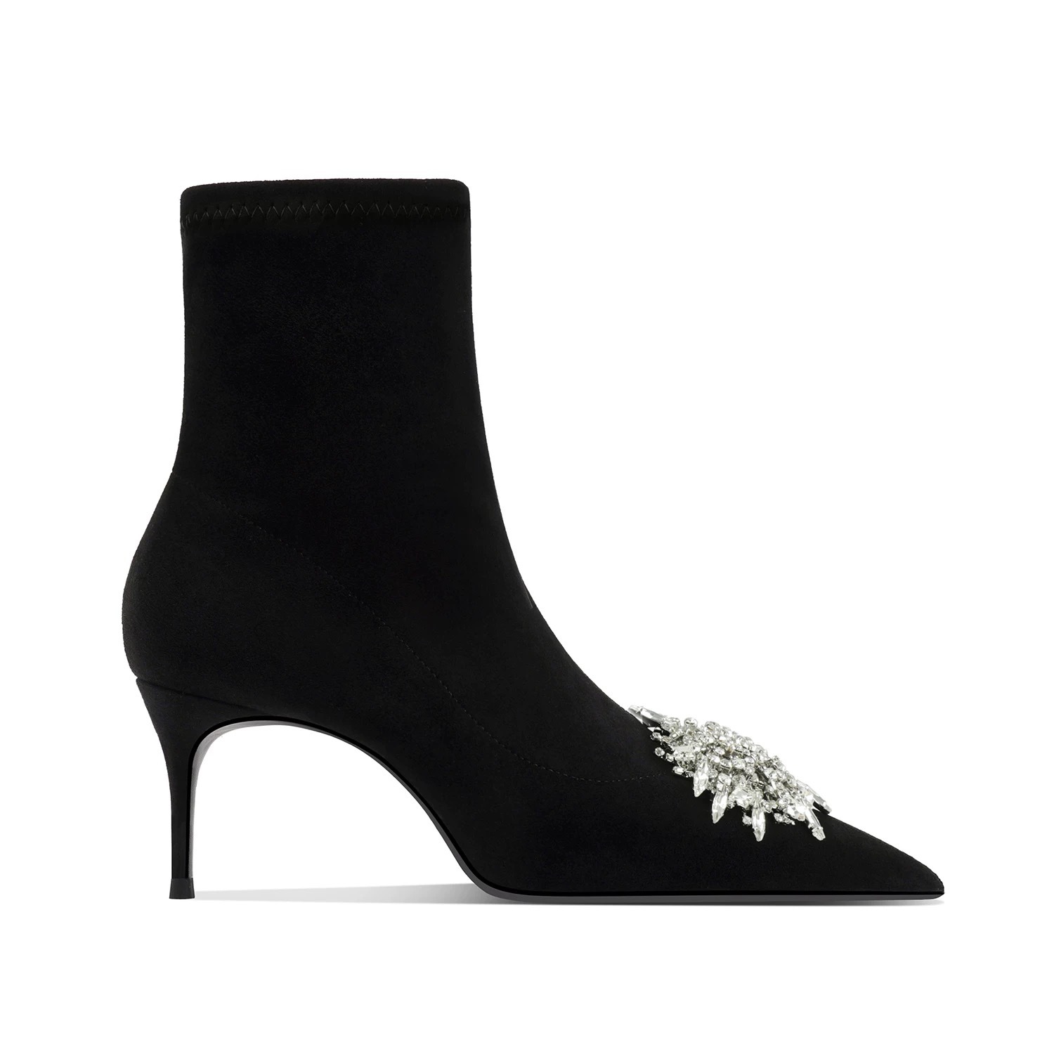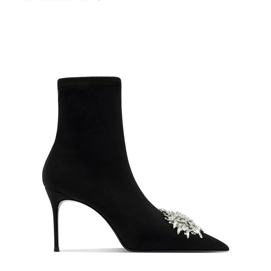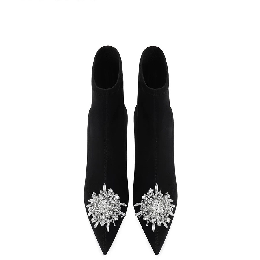 블랙 스웨이드 라인스톤 하이힐 앵클 부츠 여자 2025 년 겨울 새로운 뾰족한 얇은 굽 스트레치 부츠 기모 얇은 부츠스토어 가기