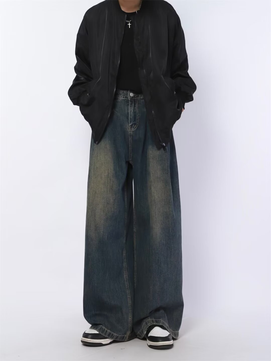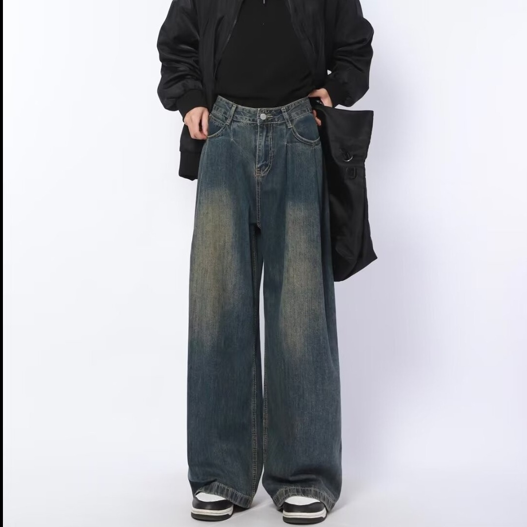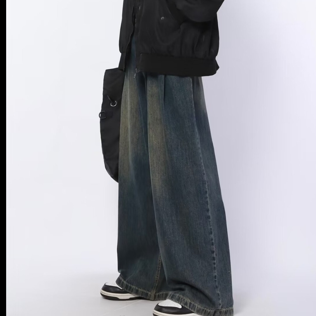 홍콩 스타일 올 매치 캐주얼 세탁 강아지 잘 생긴 스트레이트 청바지 남자 봄과 가을 느슨한 유행 넓은 다리 바지