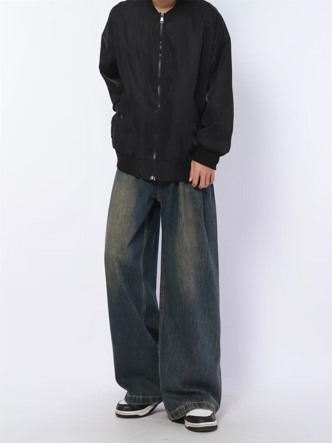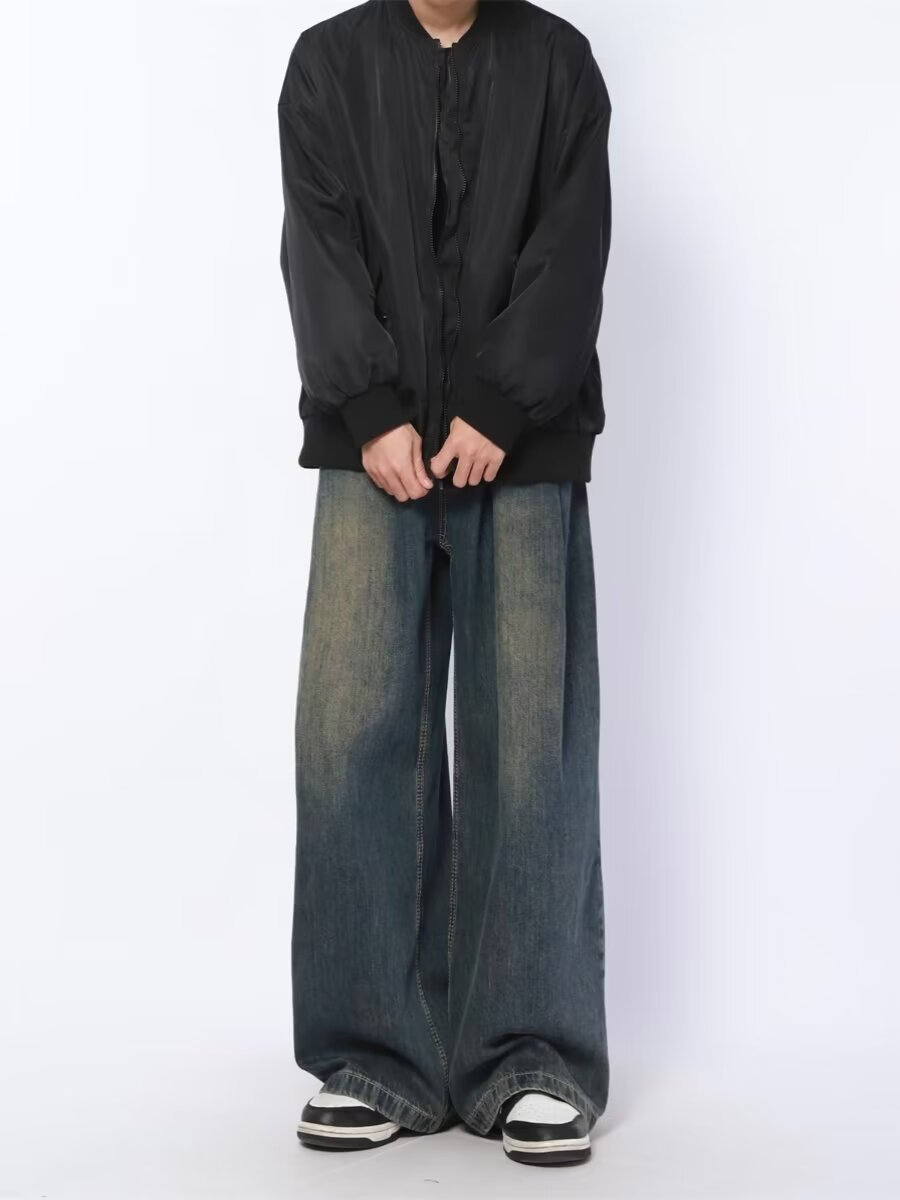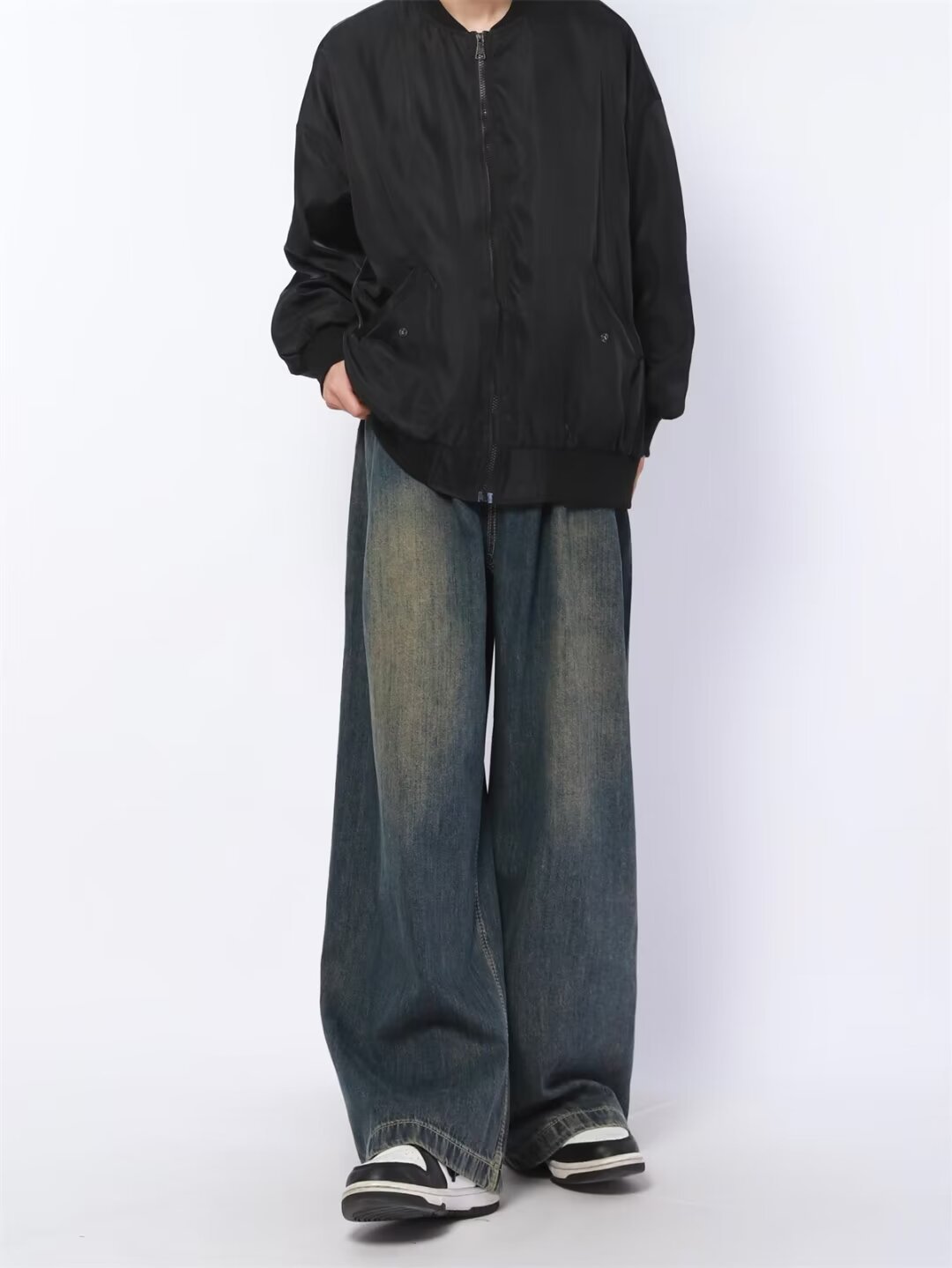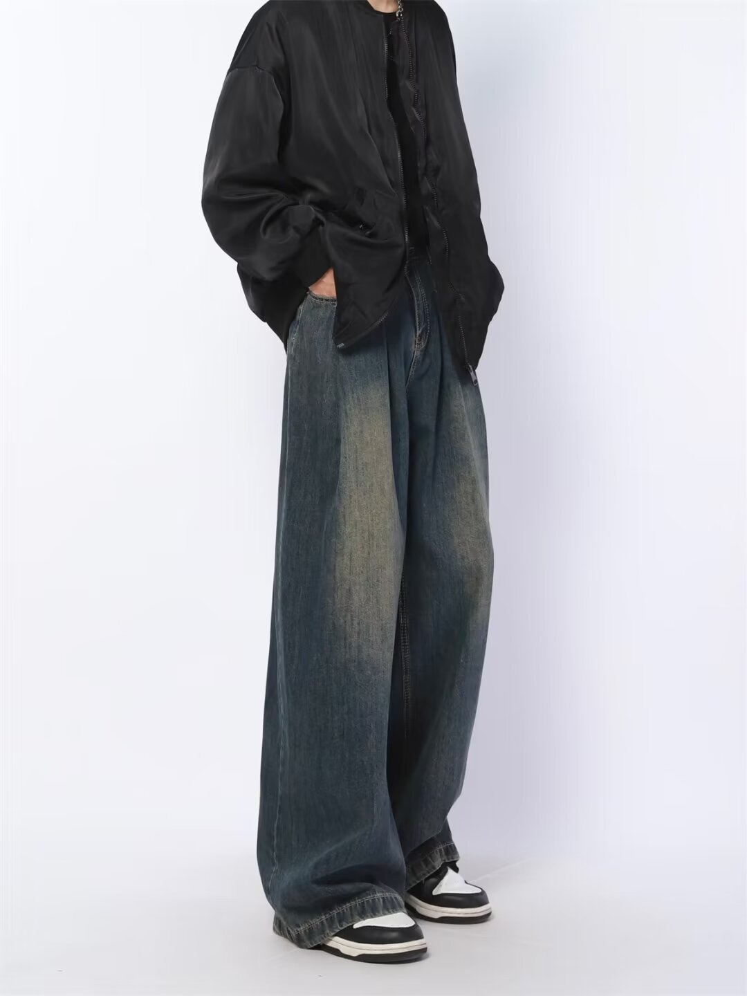 홍콩 스타일 올 매치 캐주얼 세탁 강아지 잘 생긴 스트레이트 청바지 남자 봄과 가을 느슨한 유행 넓은 다리 바지