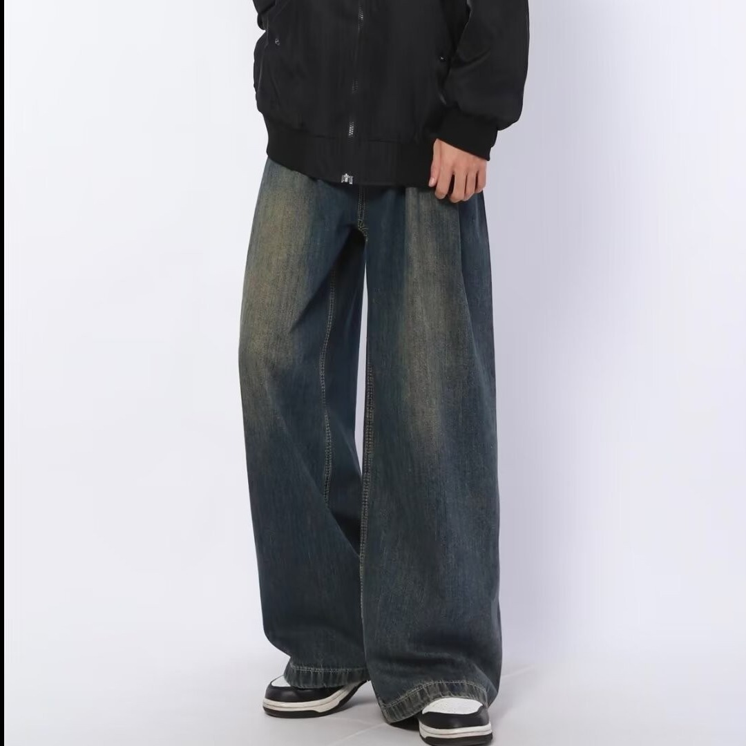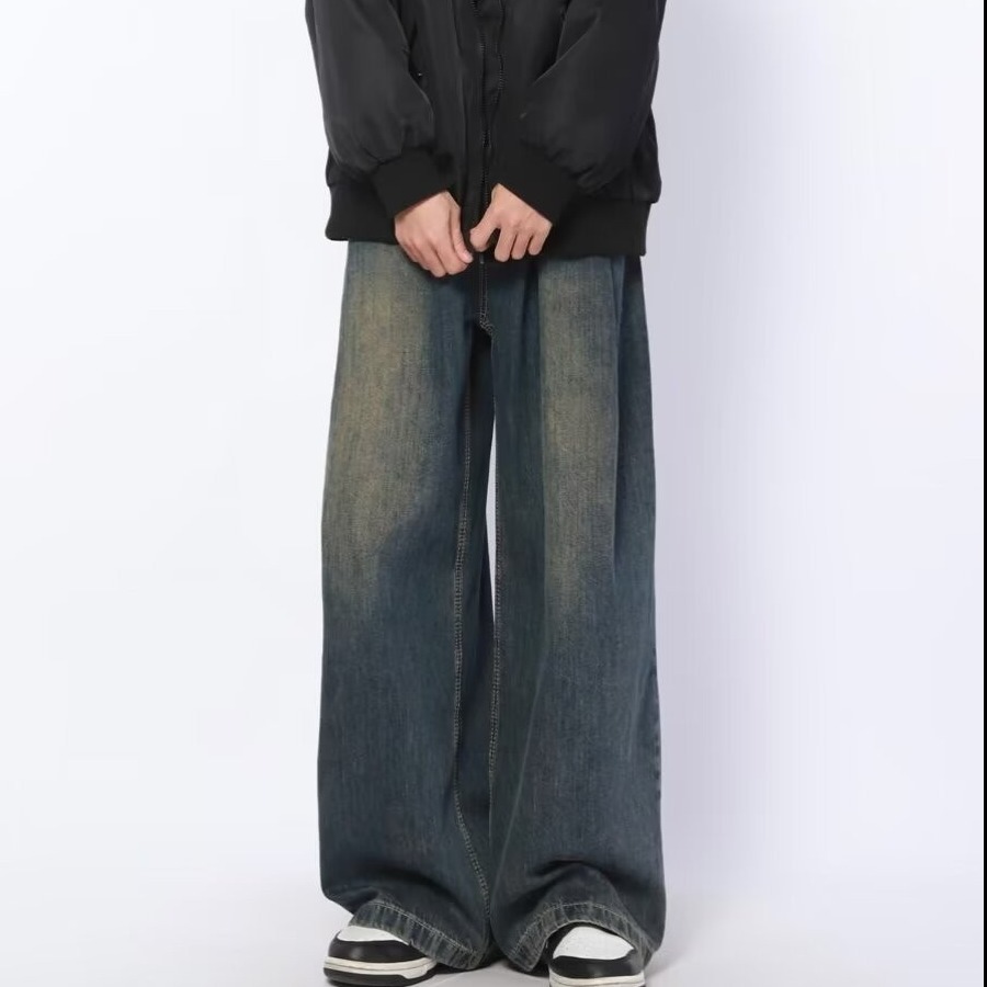 홍콩 스타일 올 매치 캐주얼 세탁 강아지 잘 생긴 스트레이트 청바지 남자 봄과 가을 느슨한 유행 넓은 다리 바지스토어 가기