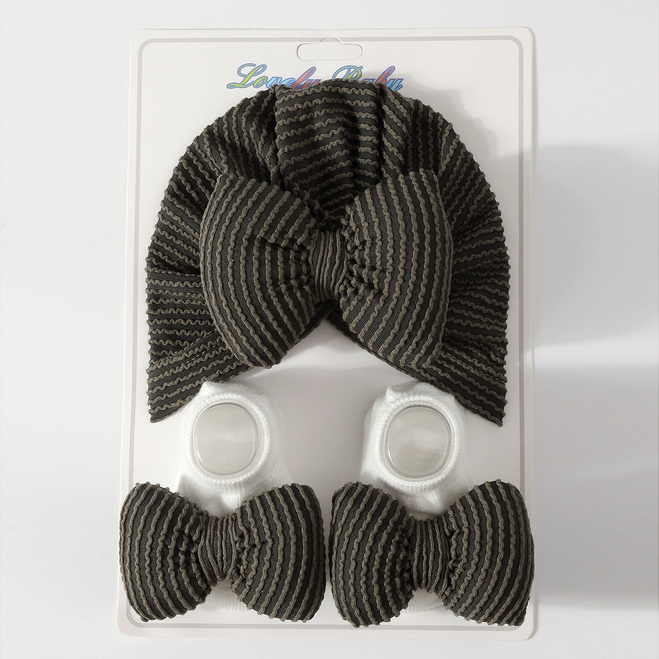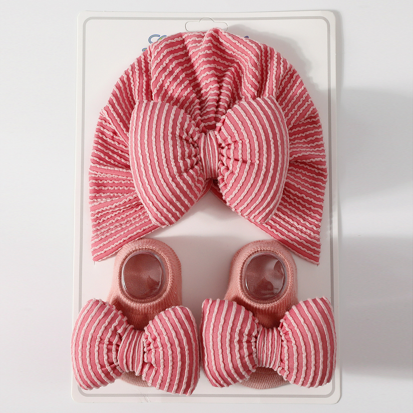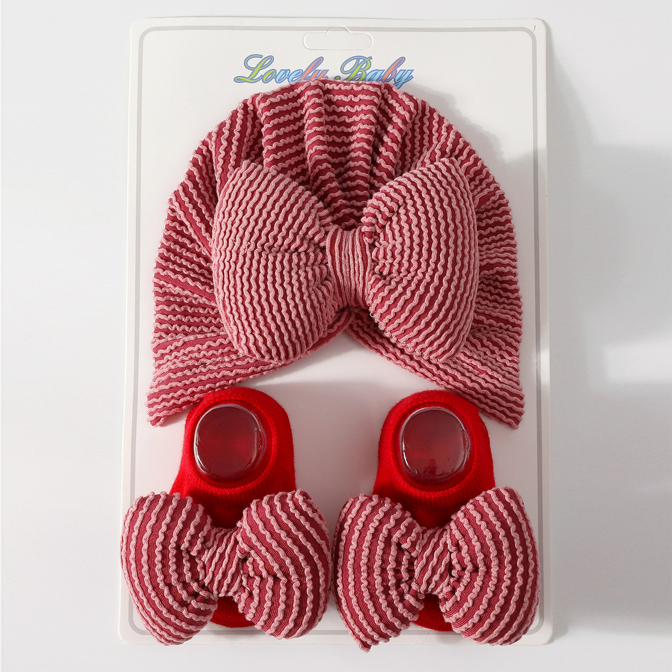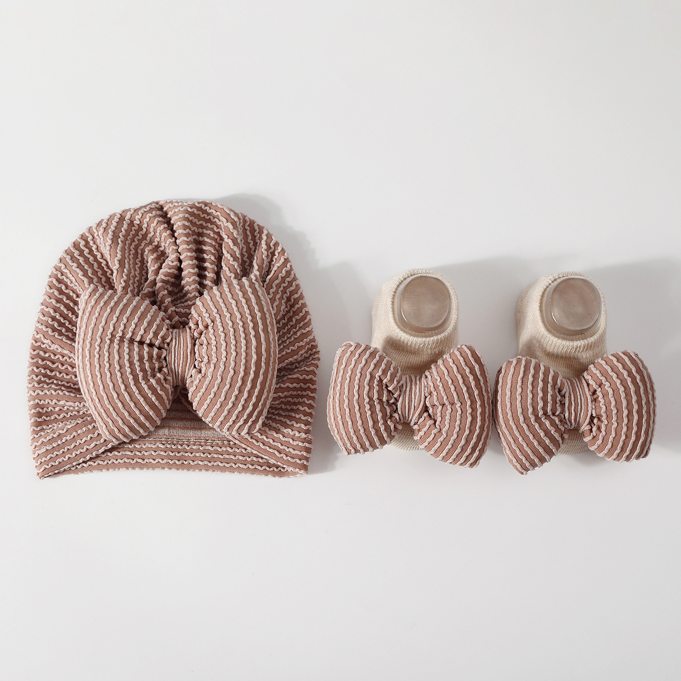 유아 줄무늬 큰 활 모자 양말 세트 신생아 Fontanelle 보호 인도 모자 아기 면 모자