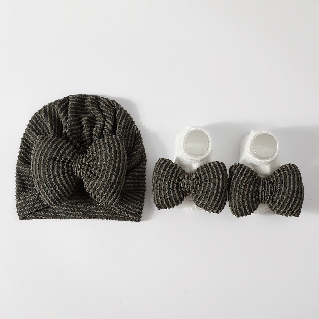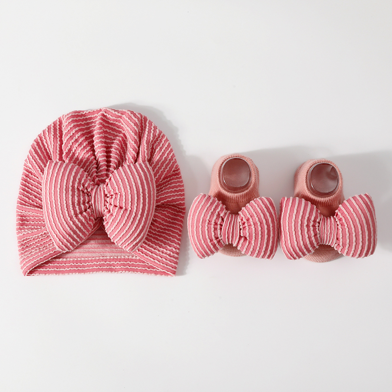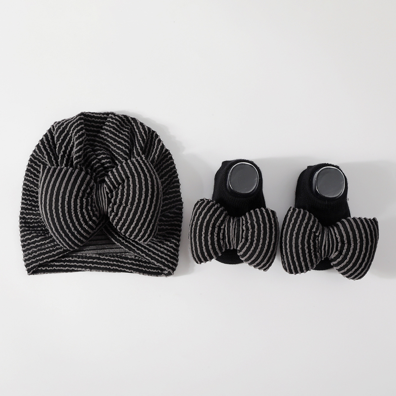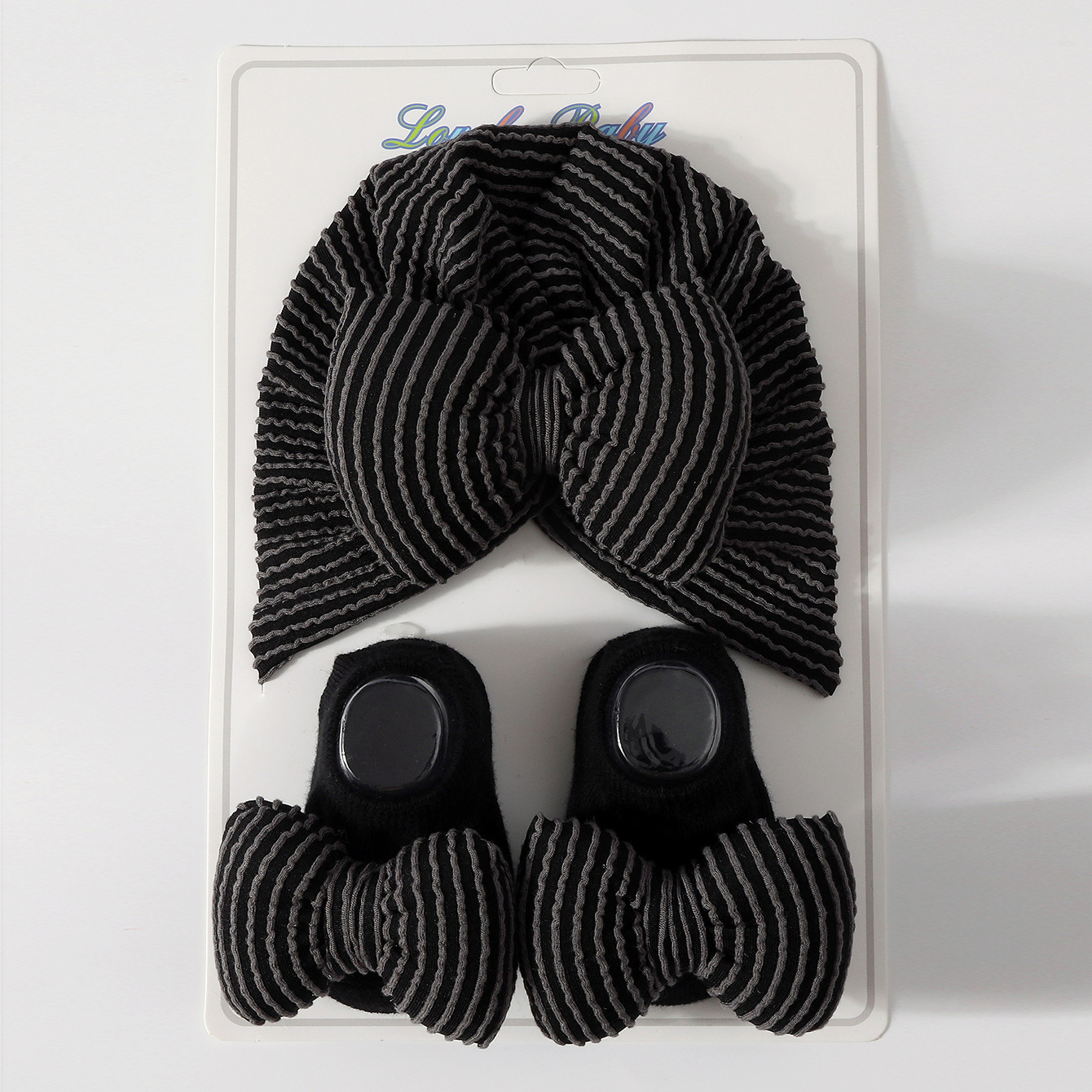 유아 줄무늬 큰 활 모자 양말 세트 신생아 Fontanelle 보호 인도 모자 아기 면 모자
