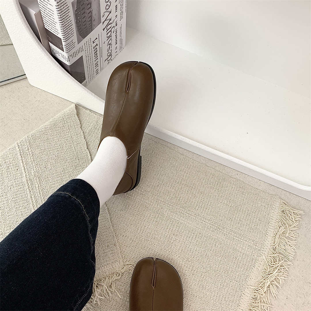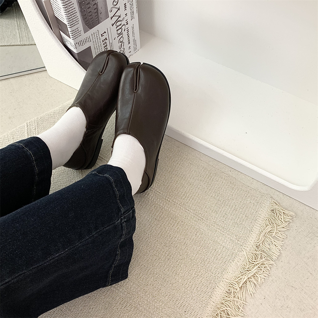여성을위한 분할 발가락 돼지 발가락 신발 가을 새로운 프랑스 복고풍 캐주얼 작은 가죽 신발 부드러운 플랫 로퍼
