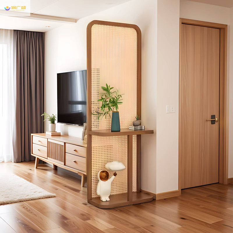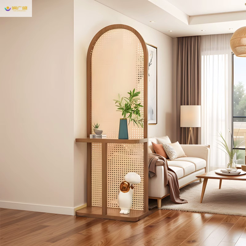 Run Guangsheng 등나무 스크린 파티션 거실 입구 단단한 나무 복고풍 좌석 스크린 와비사비 스타일 스토리지 이동식 랙스토어 가기