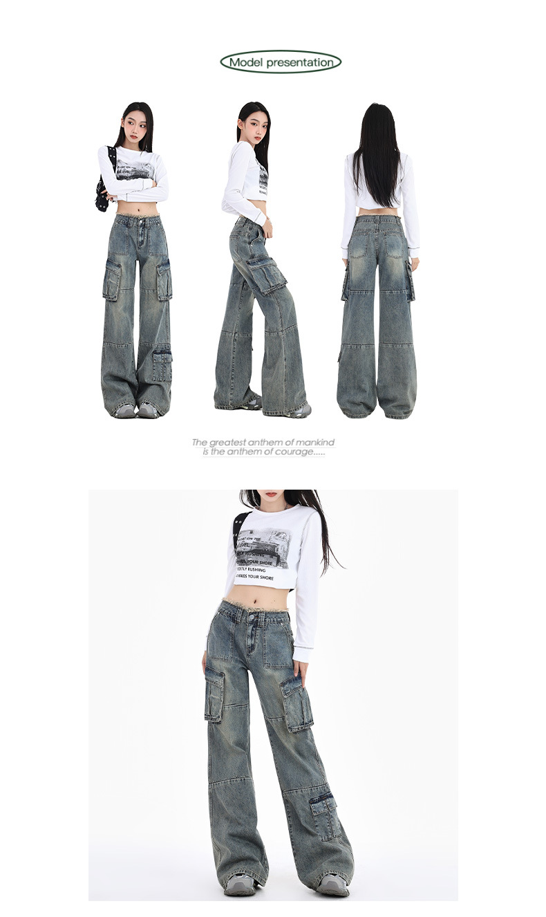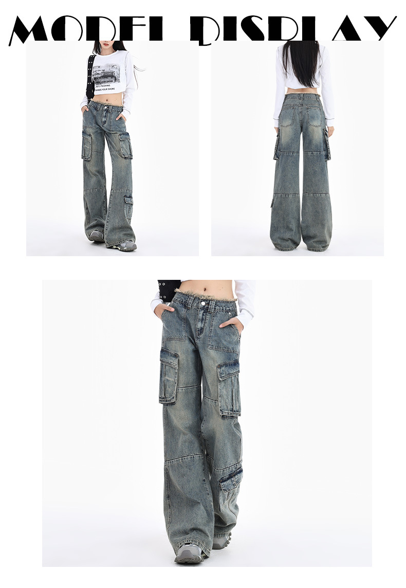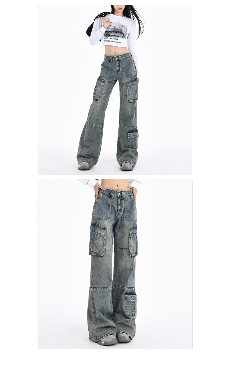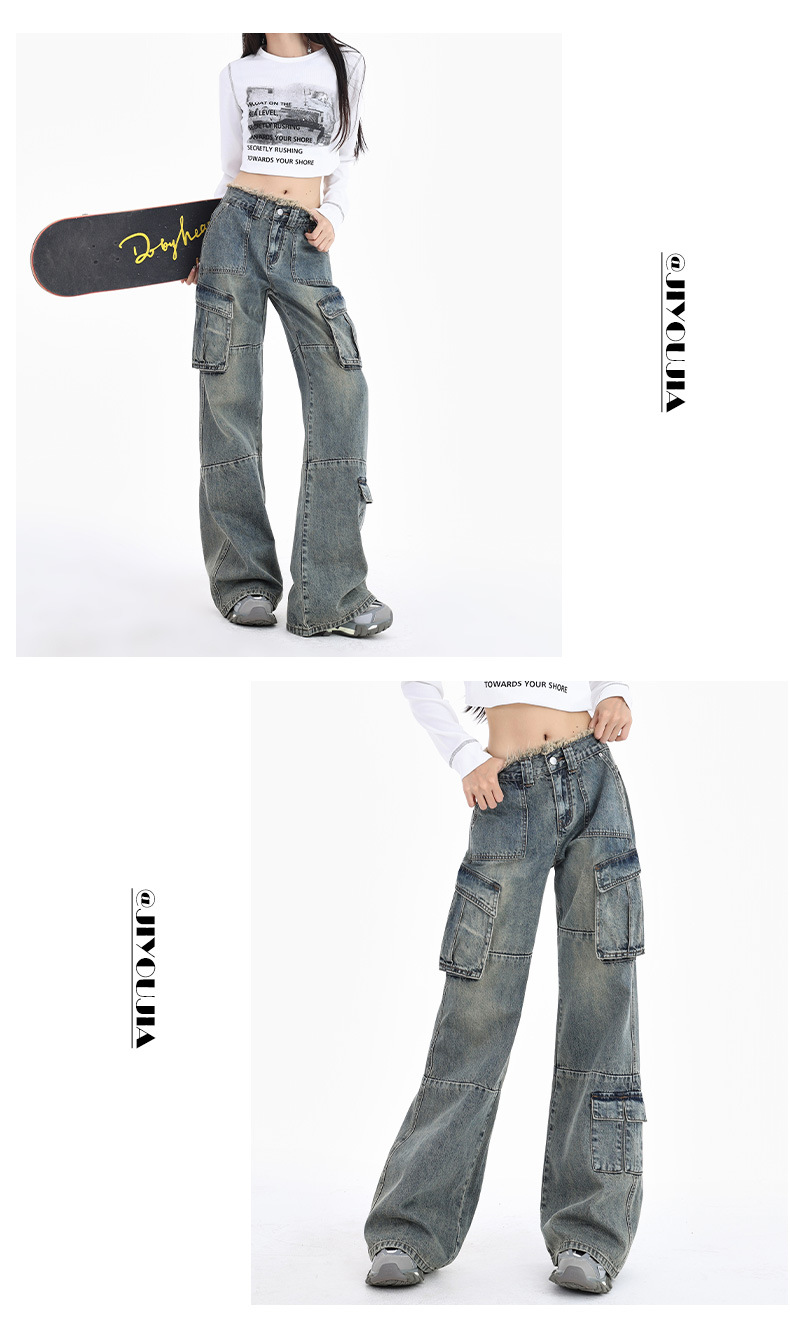 2024 새로운 미국 레트로 폴드 데님 여성의 높은 허리 슬리밍 넓은 다리 바지 레트로 블루 바지스토어 가기