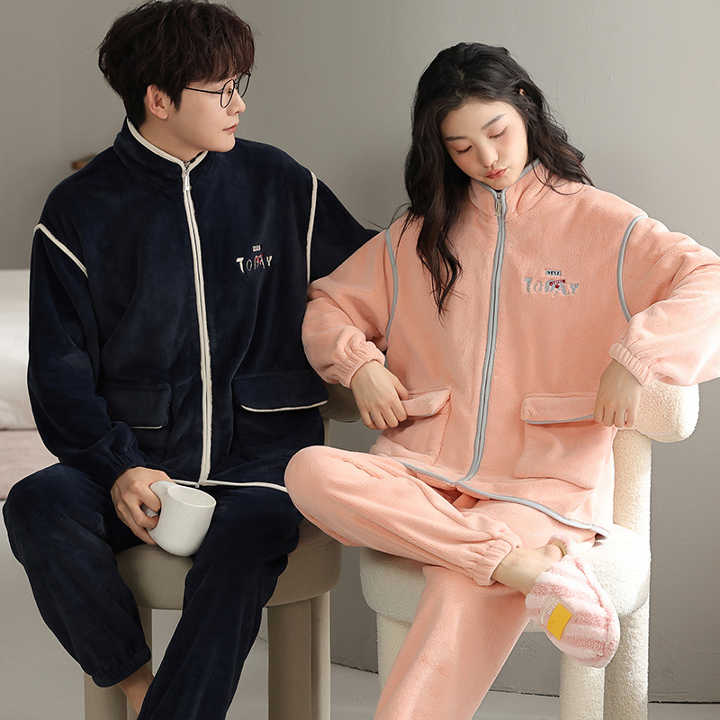사슴 시간 커플 플란넬 파자마 여성의 가을과 겨울 두껍게 기모 산호 양털 스탠드 칼라 지퍼 남성 홈 의류 세트스토어 가기