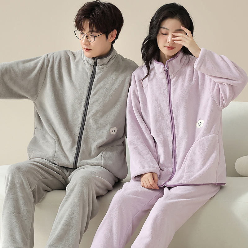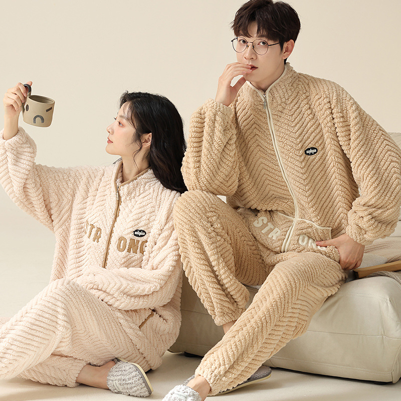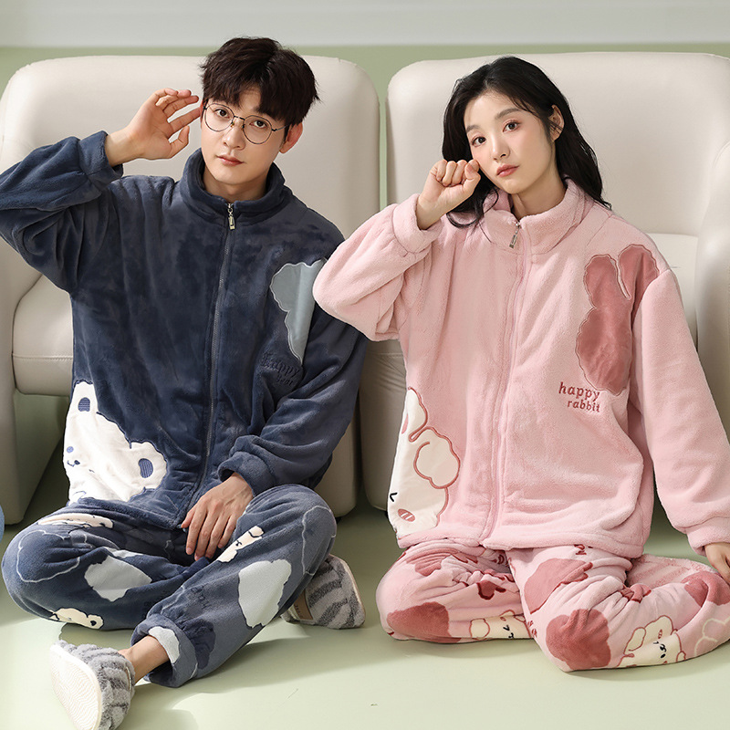 사슴 시간 커플 플란넬 파자마 여성의 가을과 겨울 두껍게 기모 산호 양털 스탠드 칼라 지퍼 남성 홈 의류 세트