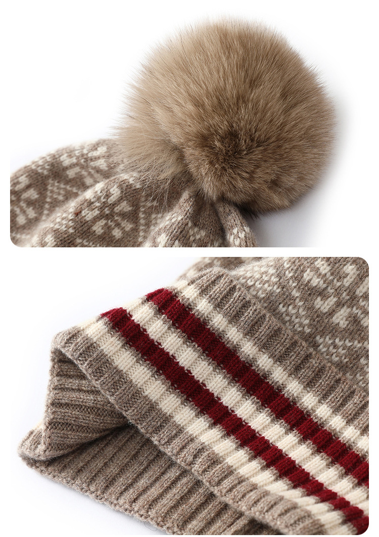 2024 겨울 한국 스타일 순수한 양모 모자 여성 모피 볼 모자 니트 자카드 패션 따뜻한 차가운 귀 보호 모자 차가운 모자
