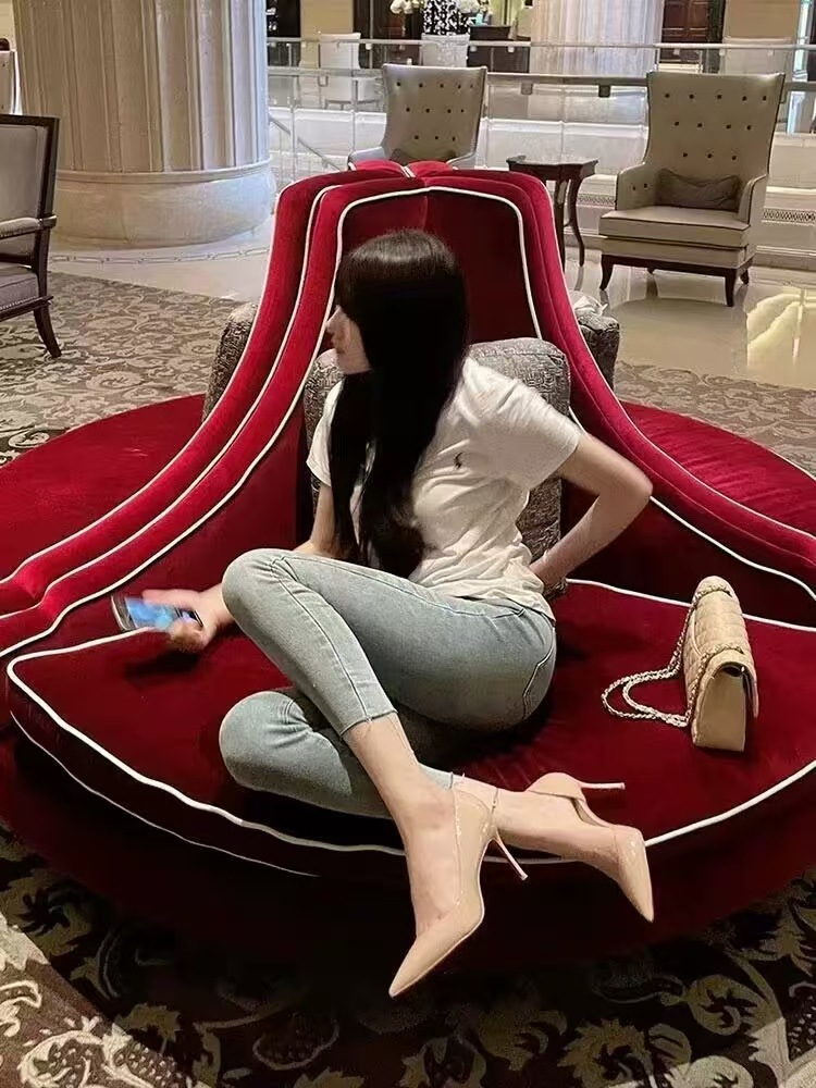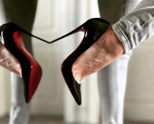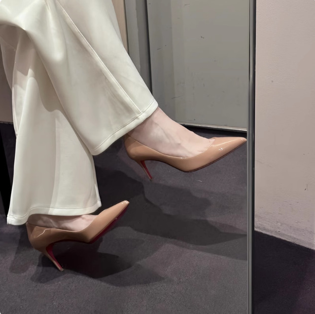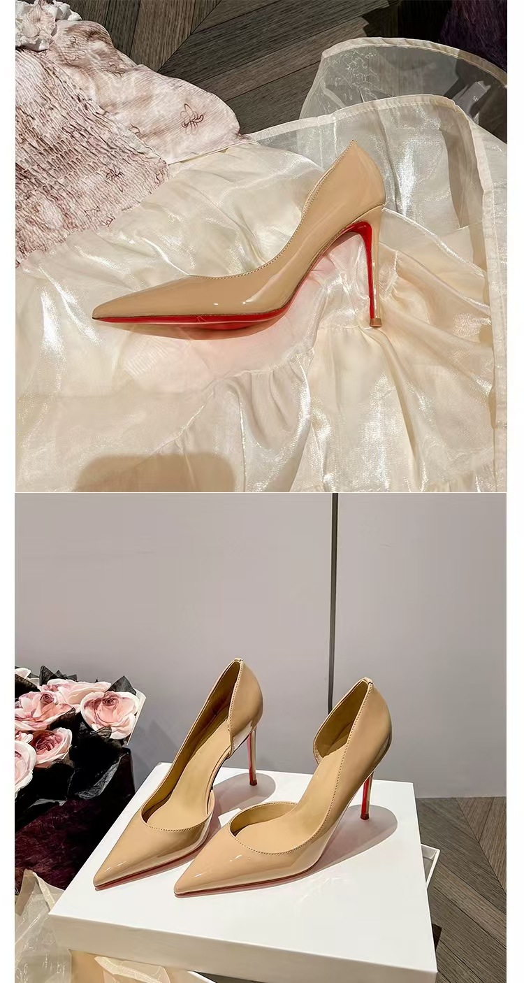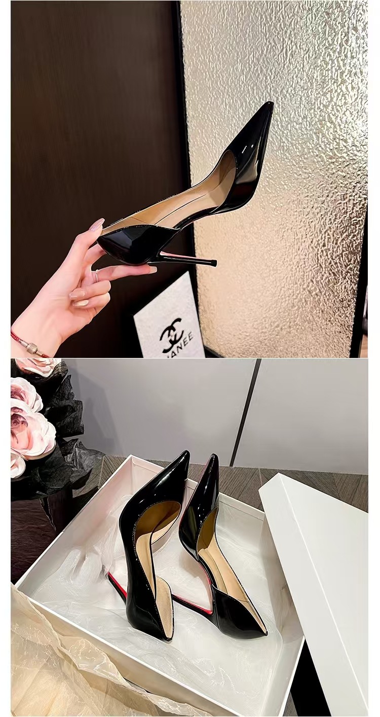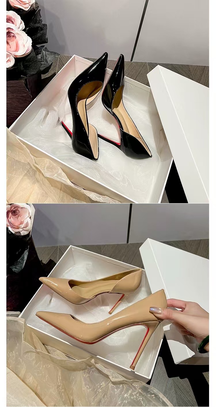 재고 있음, 즉시 배송 가능, 여성용 섹시한 누드 컬러 레드솔 하이힐, 뾰족코 사이드컷팅, 슬림 힐, 블랙 래커 가죽 슬립온 슈즈스토어 가기