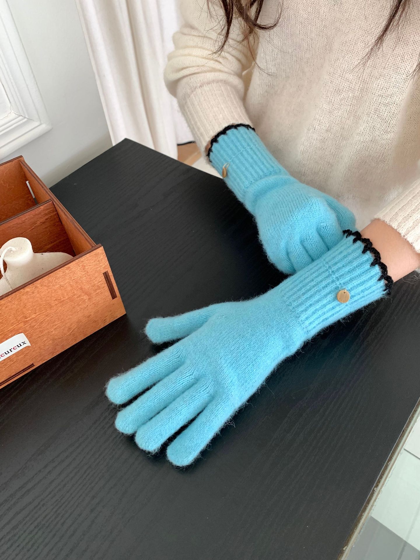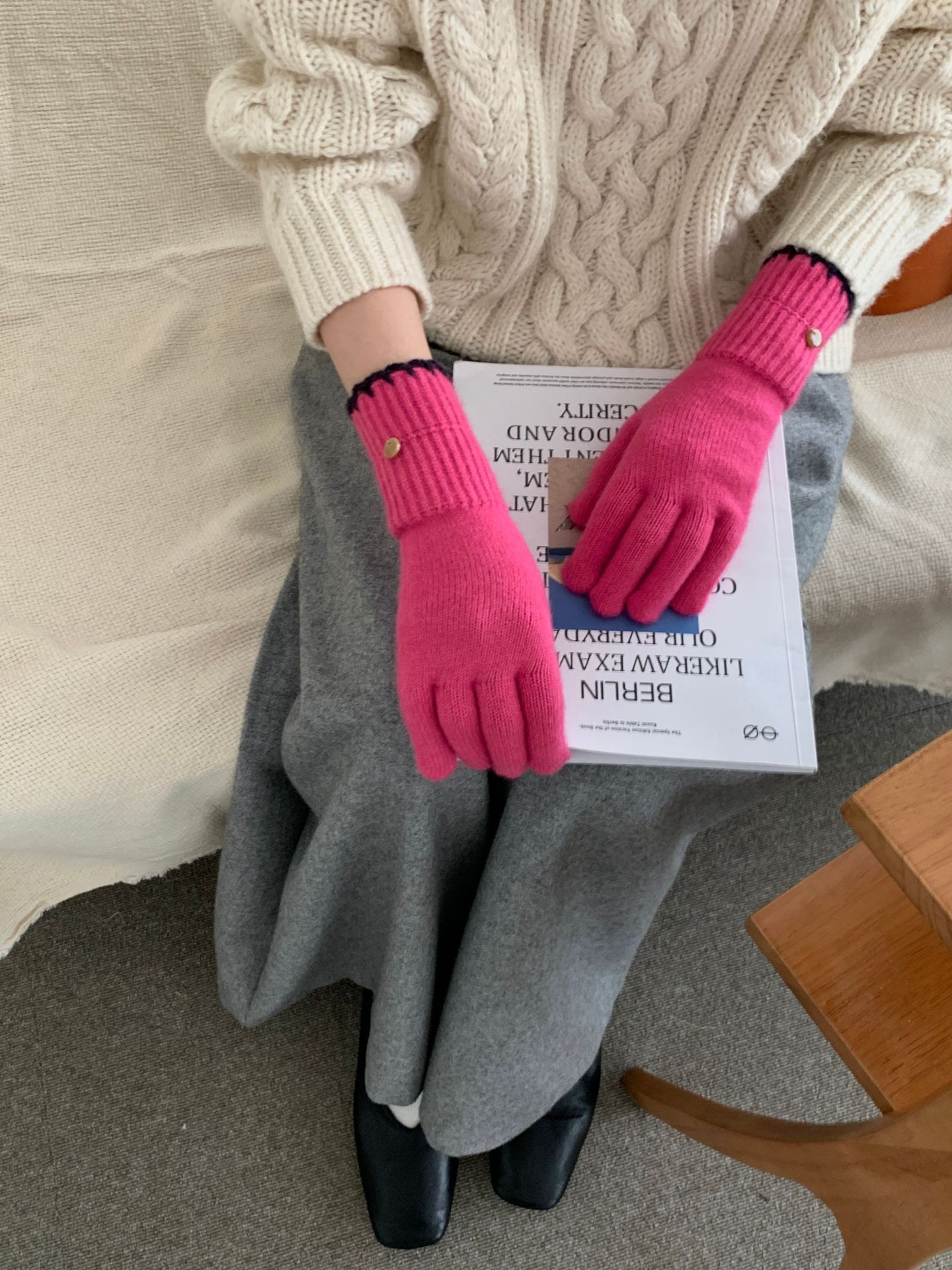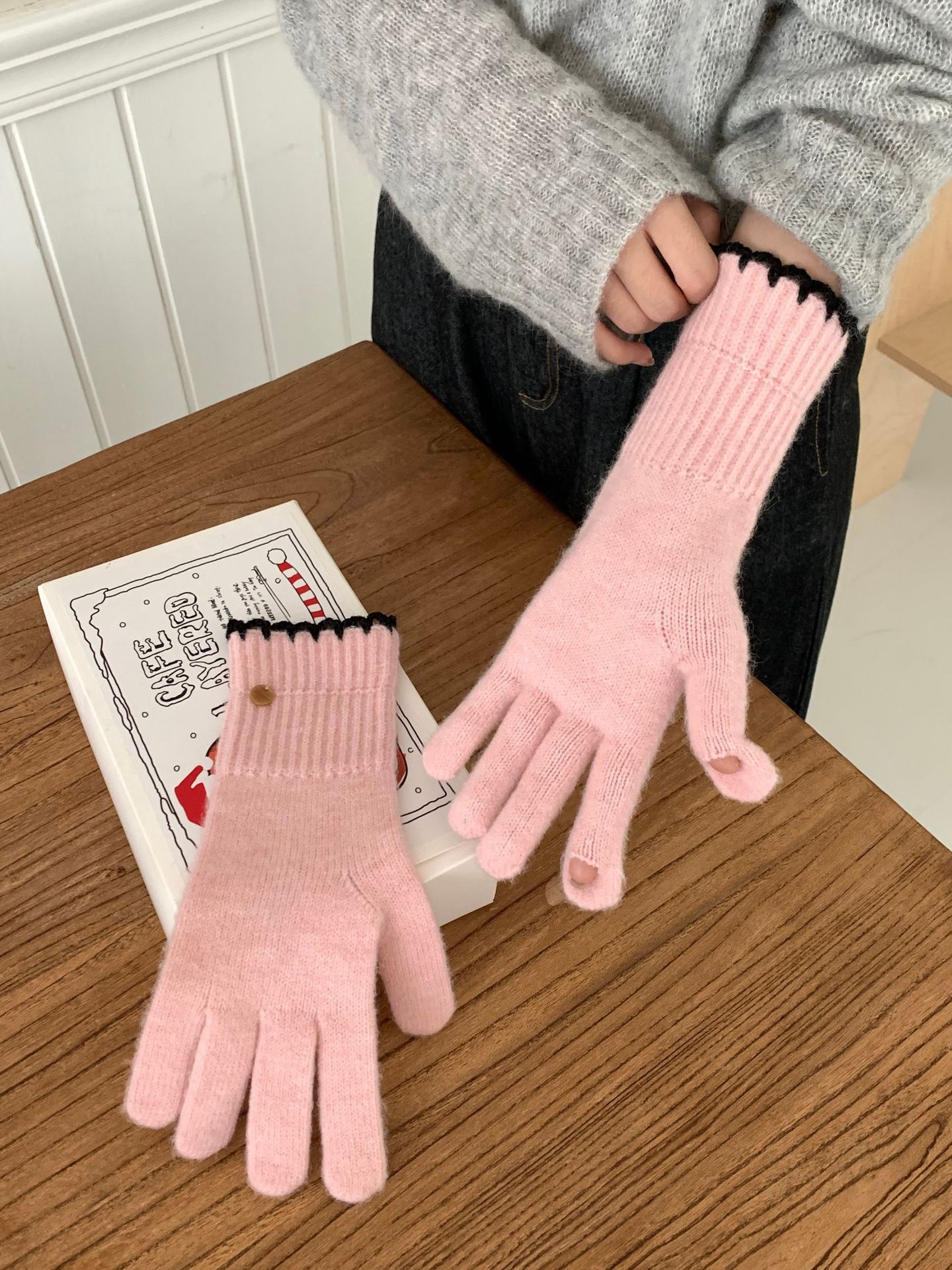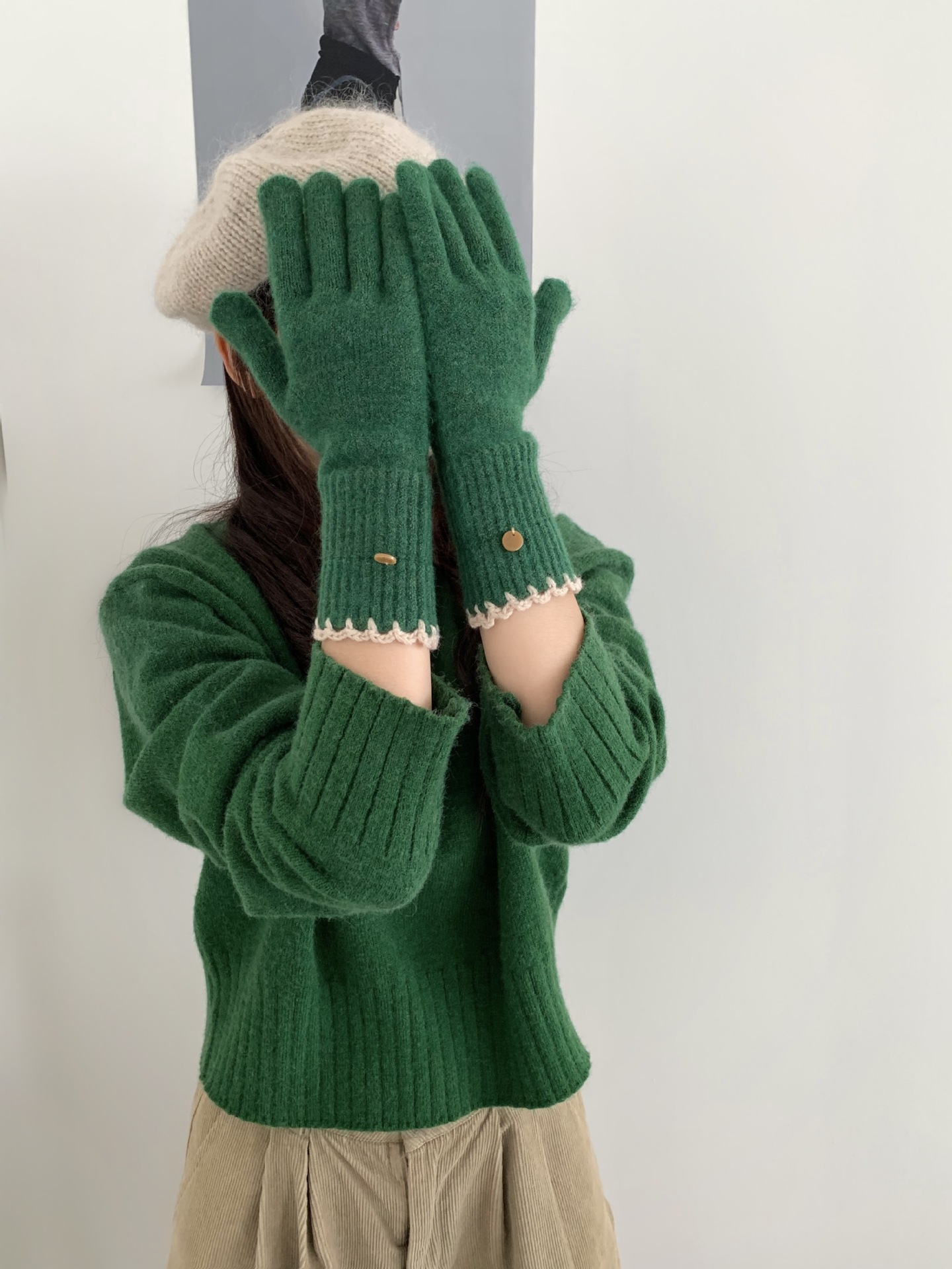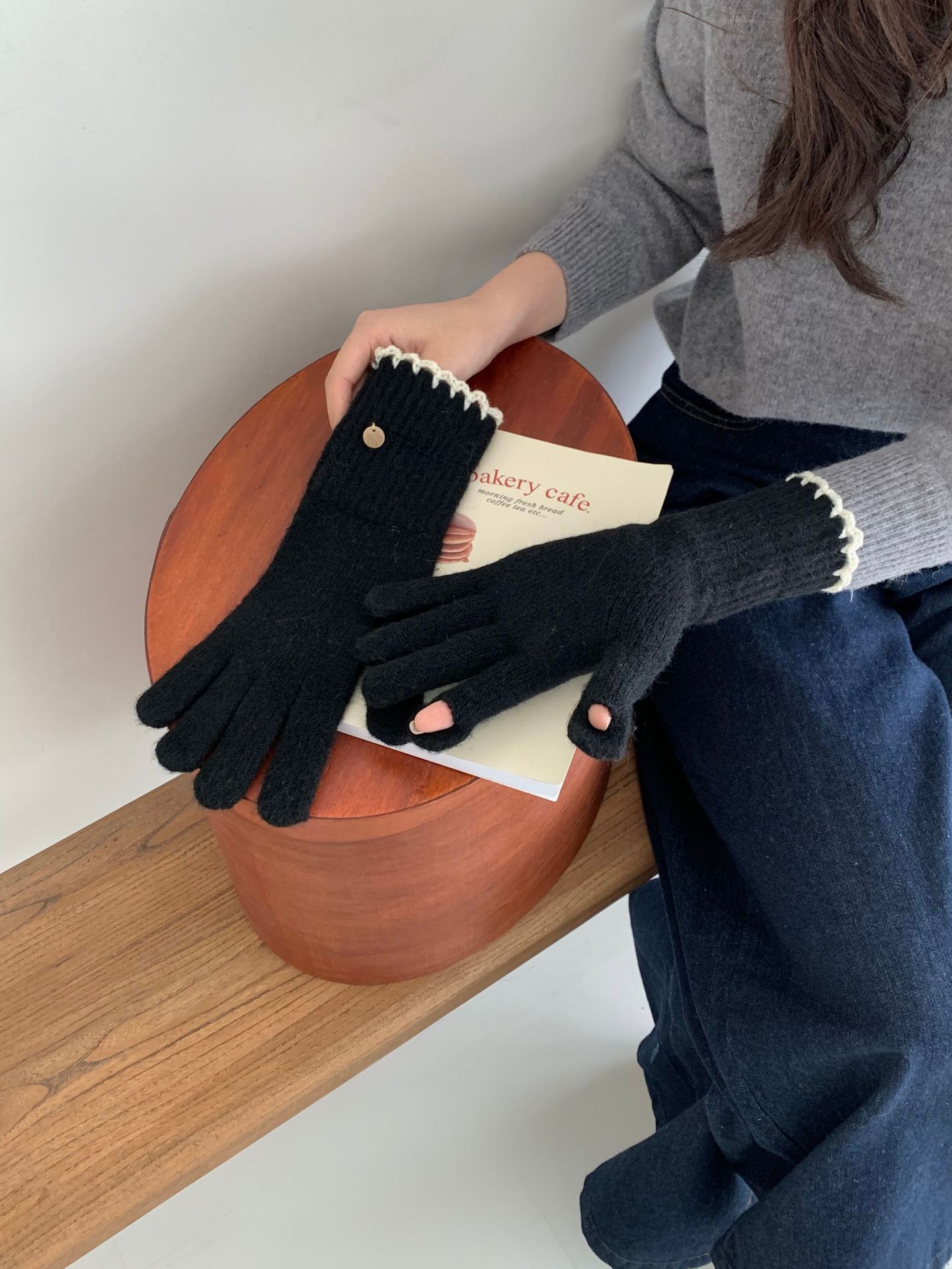 양모 단색 니트 장갑 한국 버전 여성의 2024 년 새로운 가을과 겨울 라이딩 손가락 누출 터치 스크린이 두꺼워졌습니다.