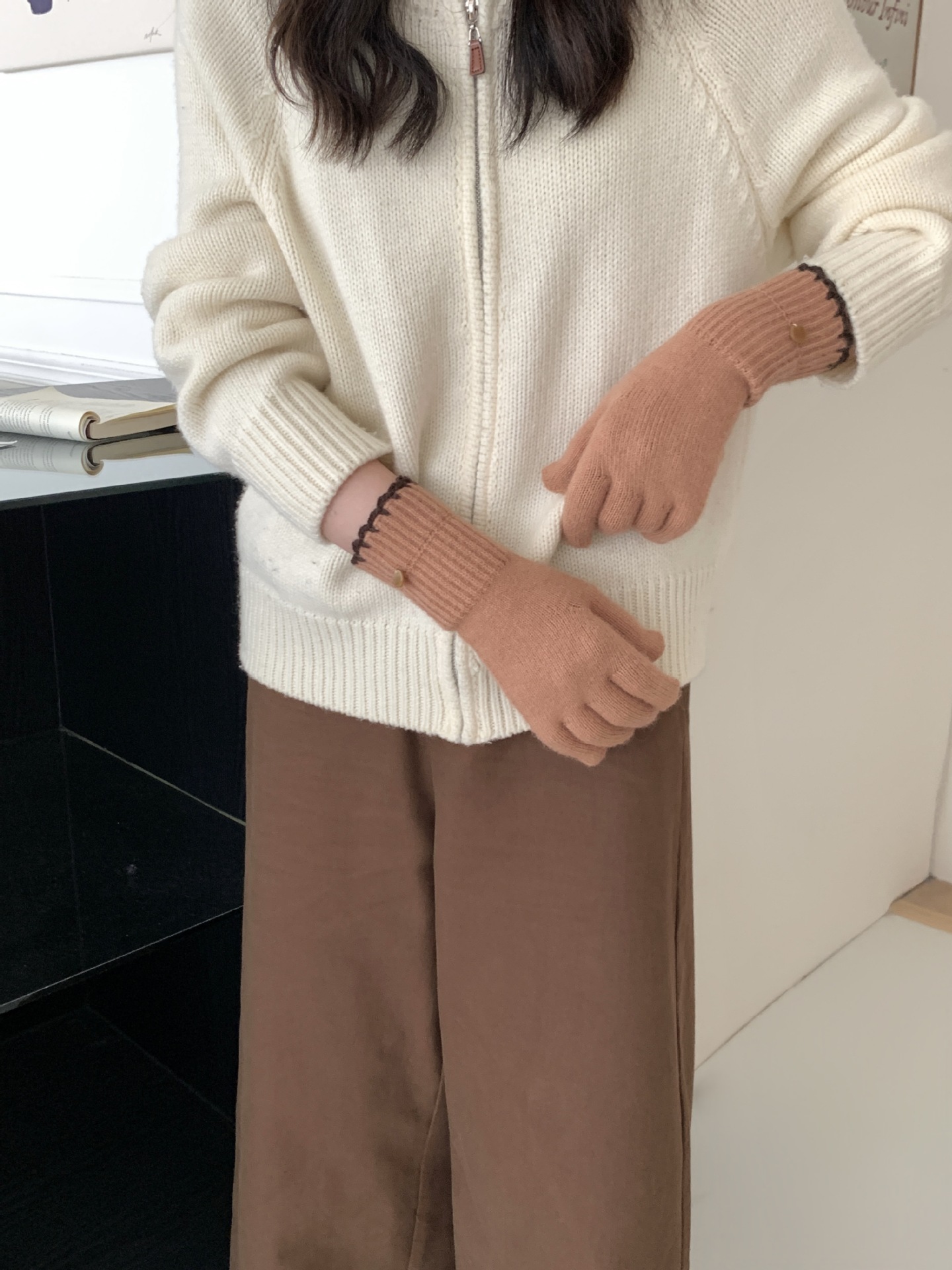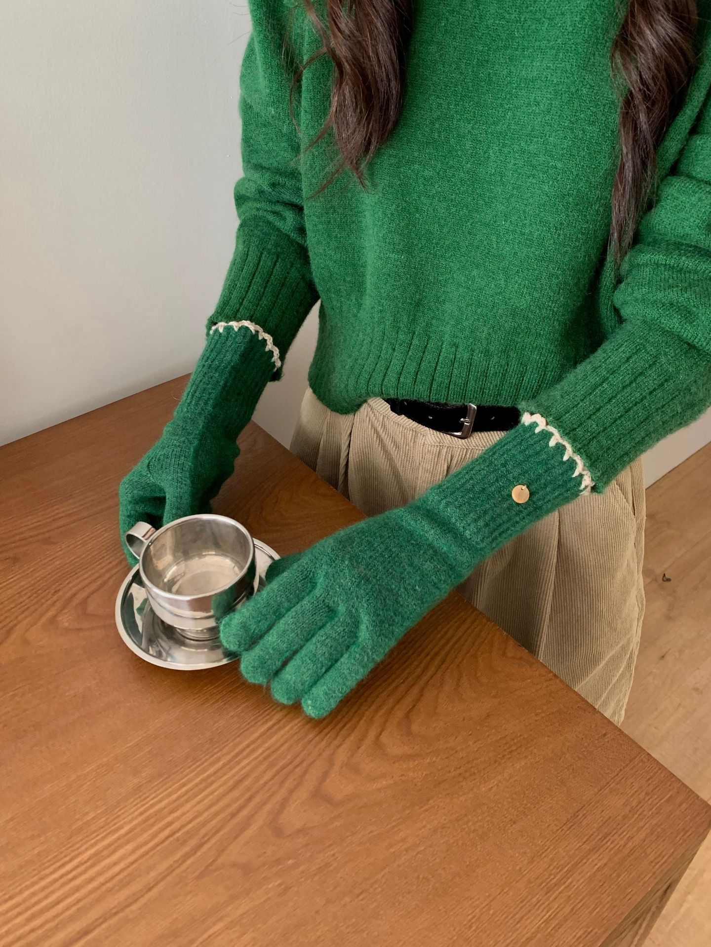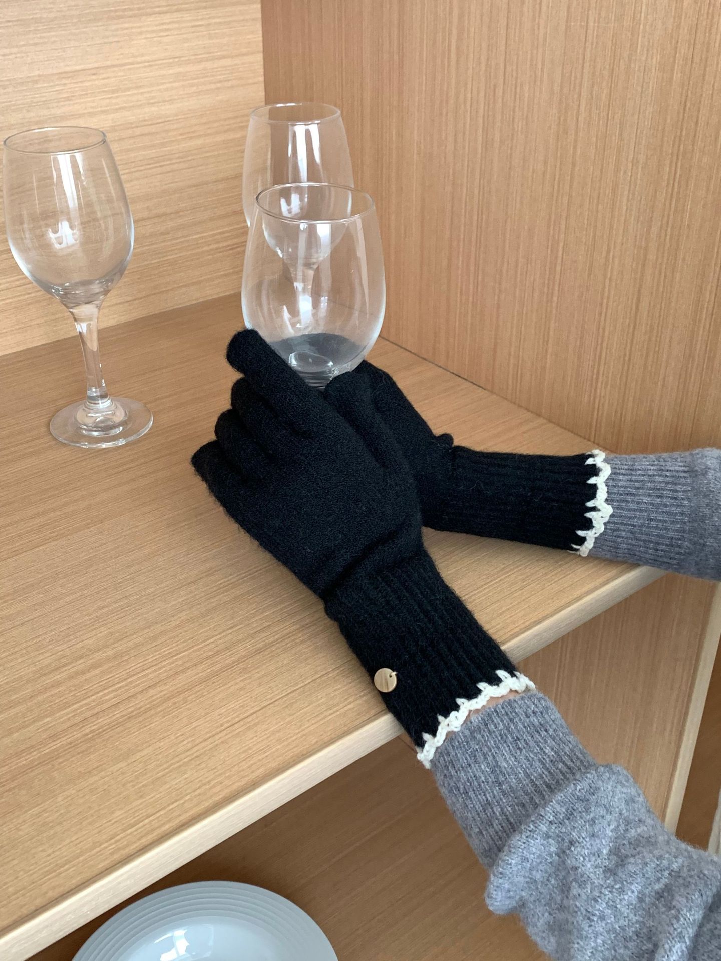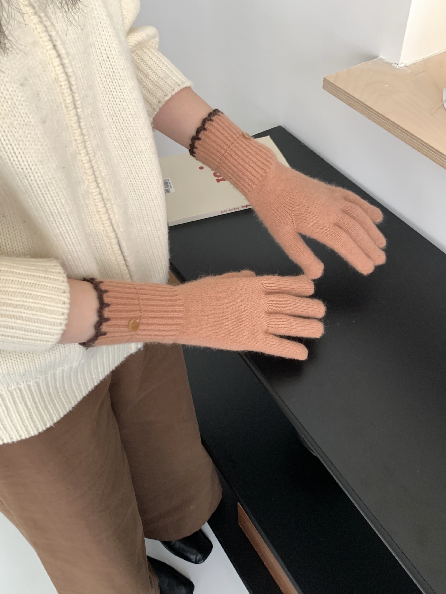 양모 단색 니트 장갑 한국 버전 여성의 2024 년 새로운 가을과 겨울 라이딩 손가락 누출 터치 스크린이 두꺼워졌습니다.