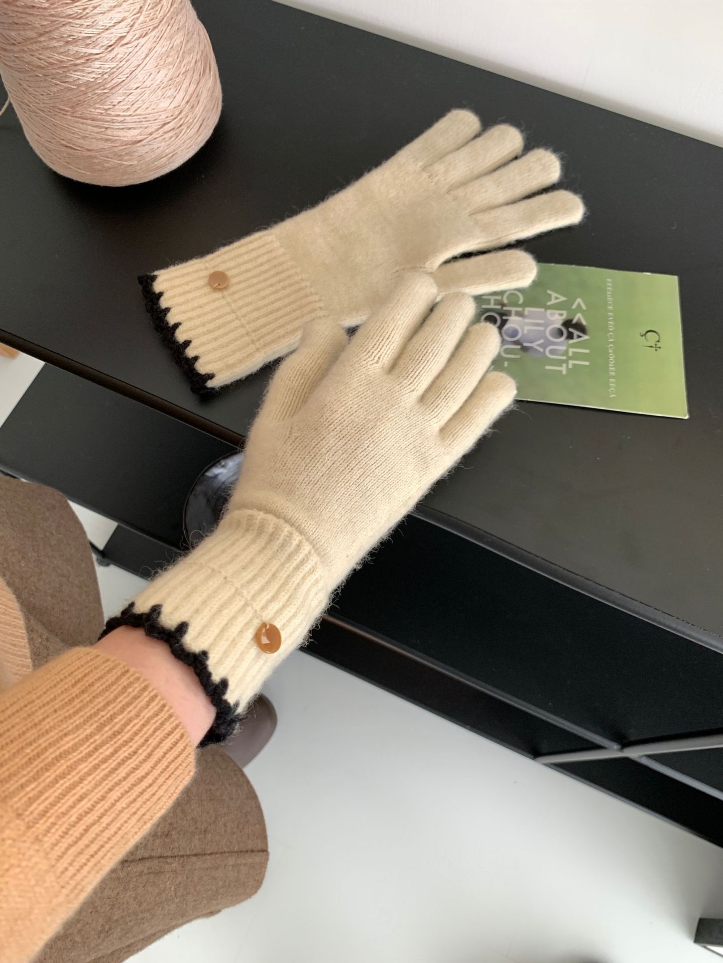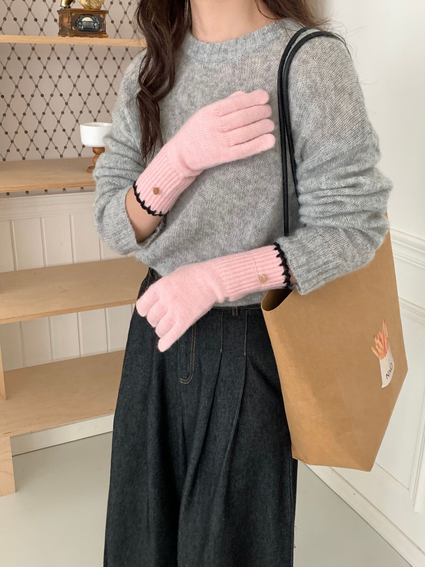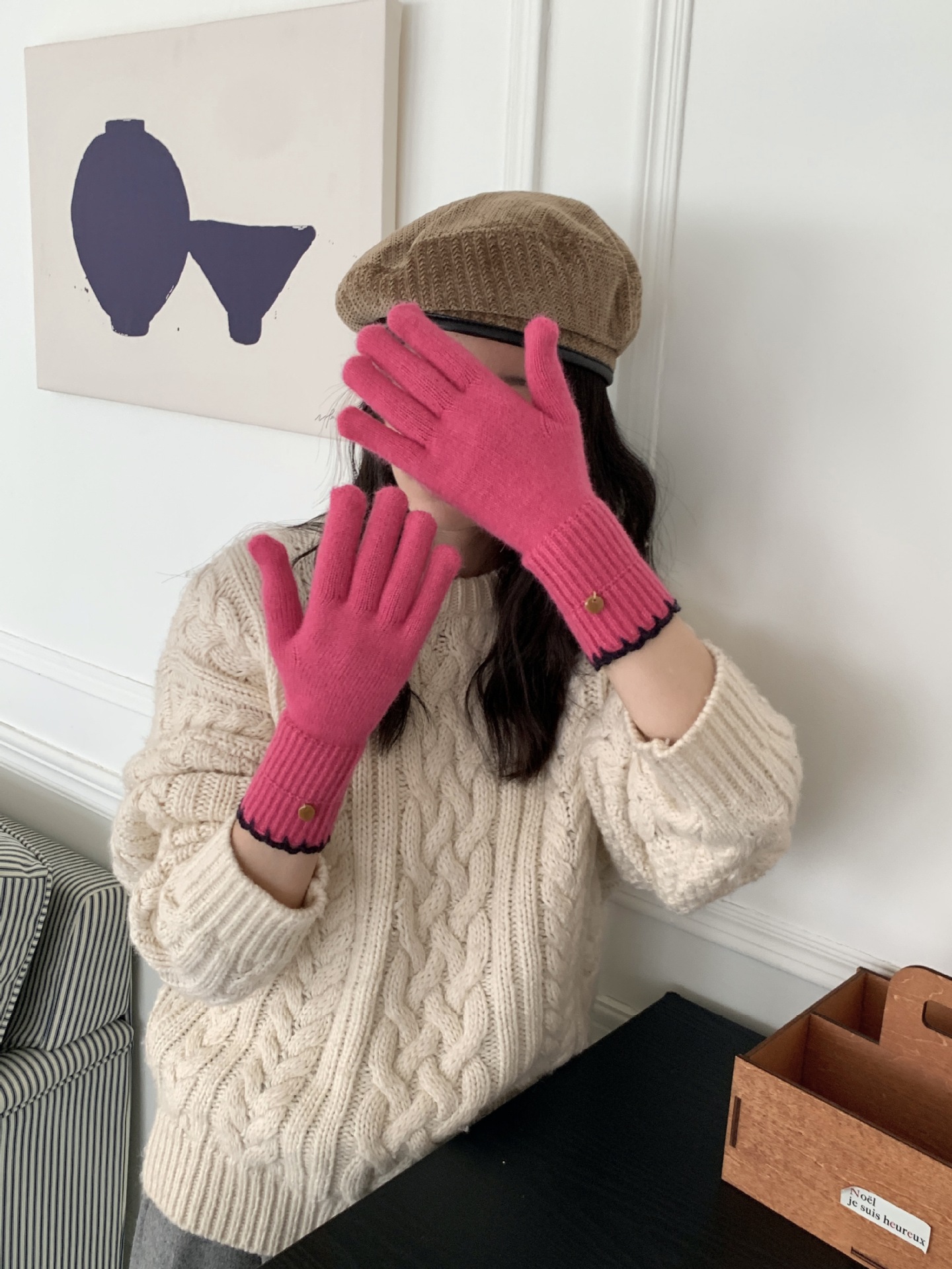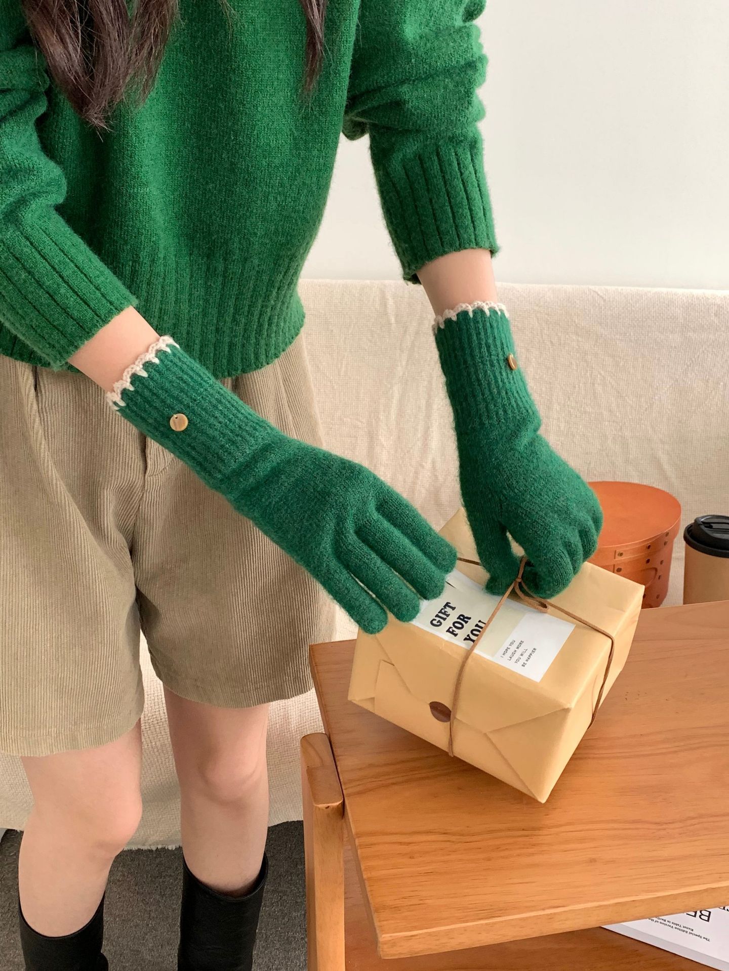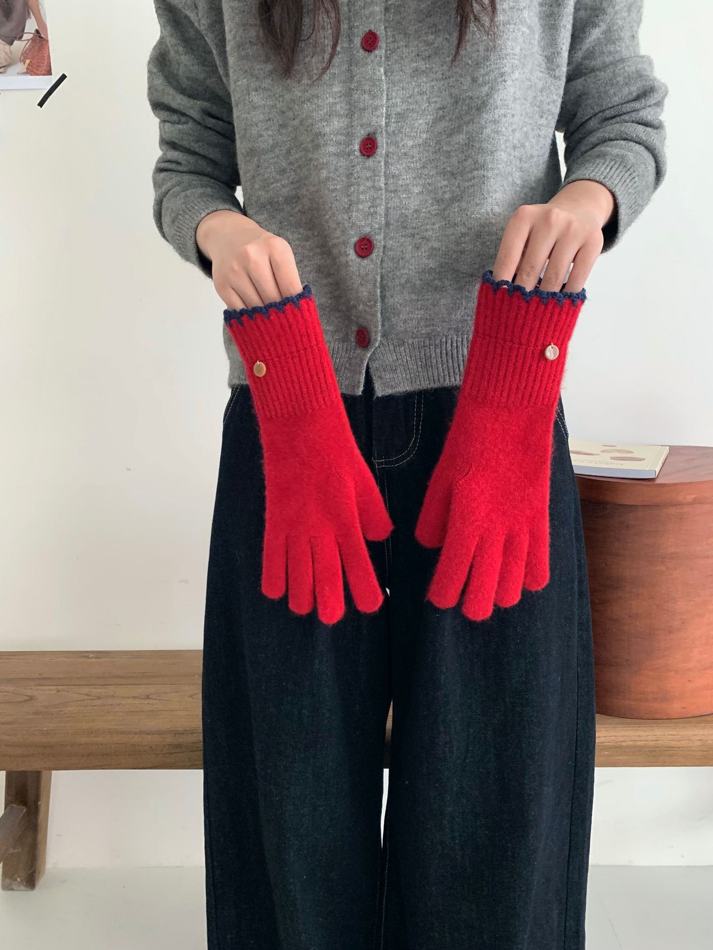 양모 단색 니트 장갑 한국 버전 여성의 2024 년 새로운 가을과 겨울 라이딩 손가락 누출 터치 스크린이 두꺼워졌습니다.스토어 가기