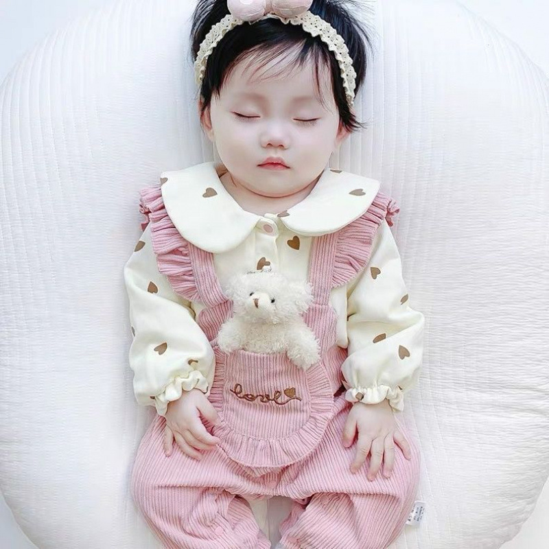 아기의 원피스 옷 가을 아기 소녀의 가짜 투피스 슈퍼 귀여운 귀여운 더블 레이어 봄과 가을 옷 외부 등반 옷 세트스토어 가기