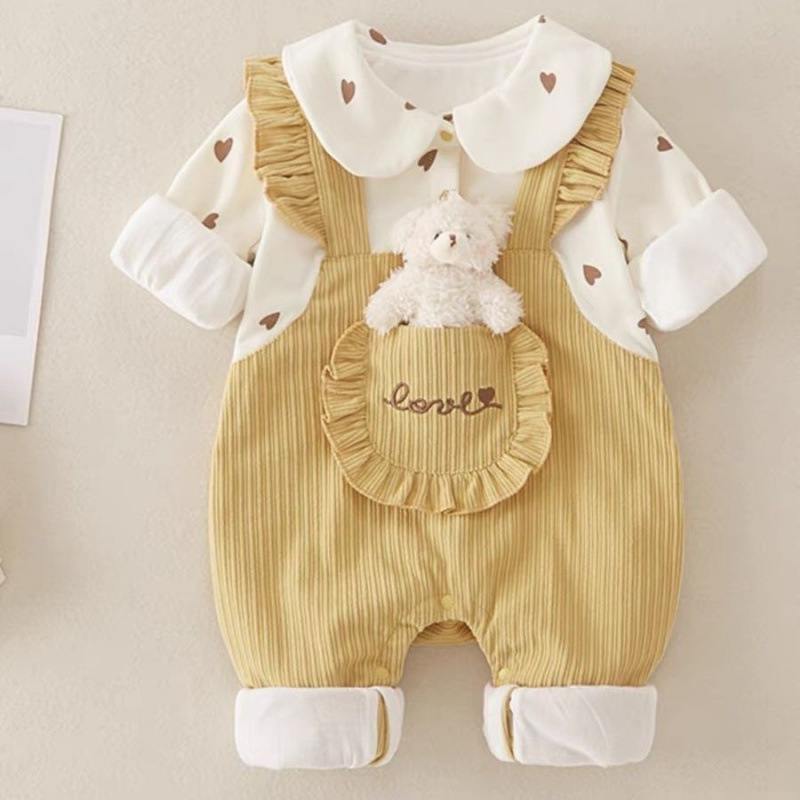 아기의 원피스 옷 가을 아기 소녀의 가짜 투피스 슈퍼 귀여운 귀여운 더블 레이어 봄과 가을 옷 외부 등반 옷 세트