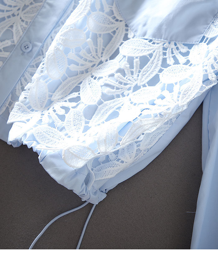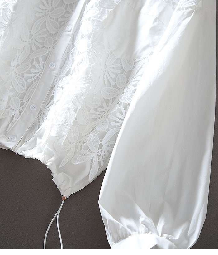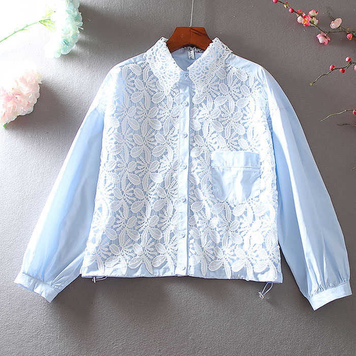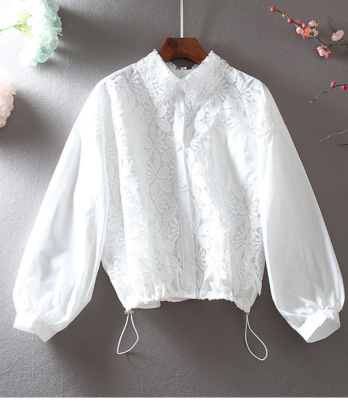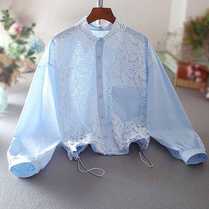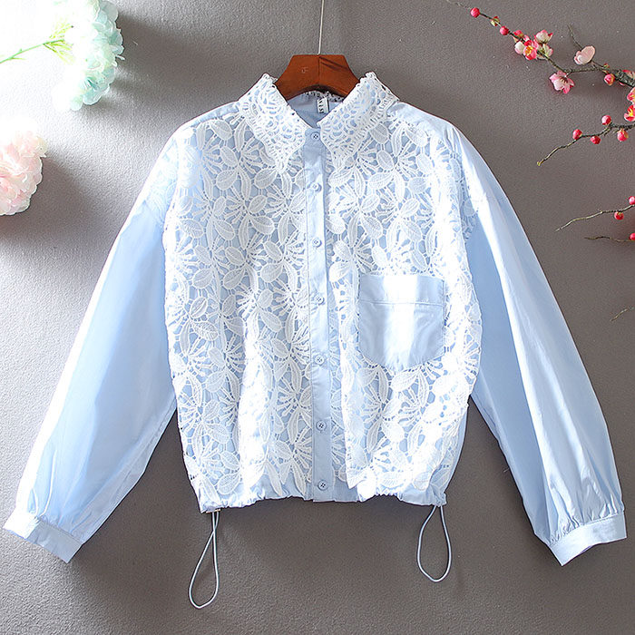 우아한 높은 허리 짧은 긴 소매 느슨한 레이스 바느질 프랑스 캐주얼 순면 가을 셔츠 올 매치 패션 탑스토어 가기