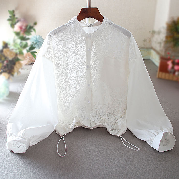 우아한 높은 허리 짧은 긴 소매 느슨한 레이스 바느질 프랑스 캐주얼 순면 가을 셔츠 올 매치 패션 탑