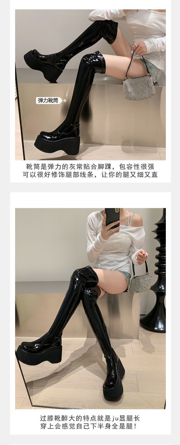 스트레치 부츠 가을과 겨울 올 매치 블랙 플랫폼 바닥 얇은 부츠 7CM 방수 플랫폼 두꺼운 바닥 무릎 위 롱 부츠 한국식 웨지 힐스토어 가기