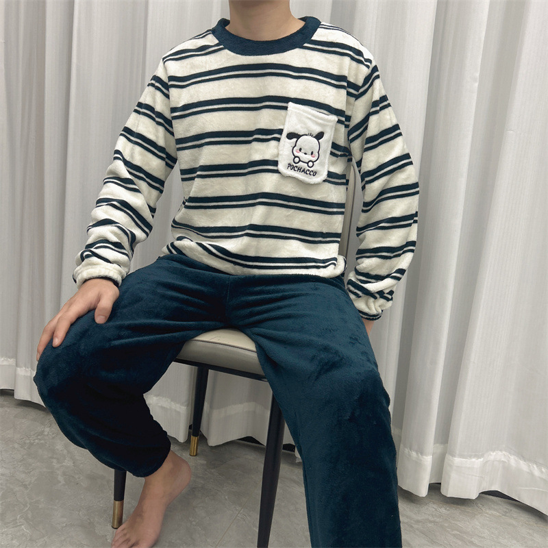 국경 간 잠옷 남자의 가을과 겨울 새로운 플란넬 크루 넥 풀오버 긴 소매 캐주얼 만화 따뜻한 집 옷 세트