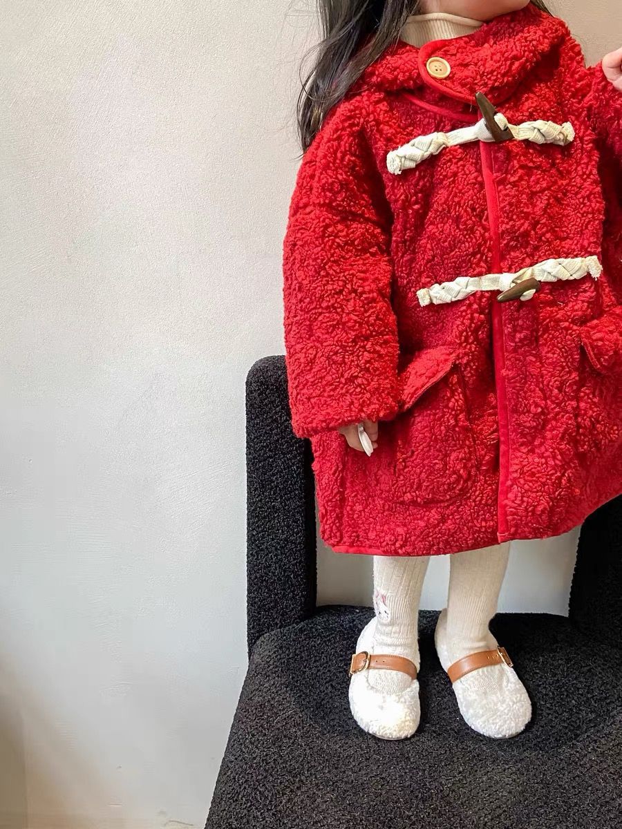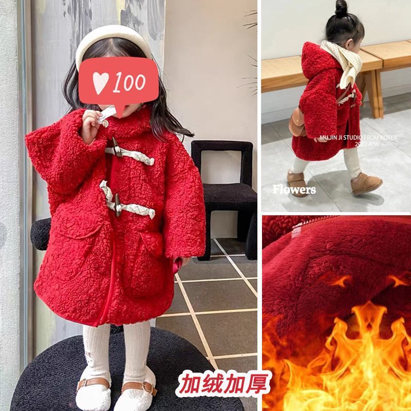 여아 양털 코트 가죽과 모피 일체형 2025 겨울 한국 스타일 어린이 후드 중간 길이 코트 털이 많은
