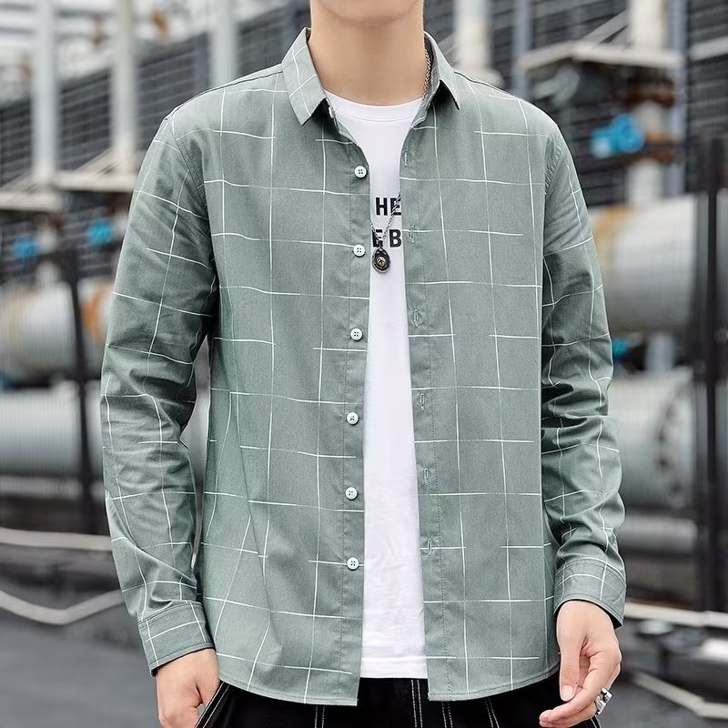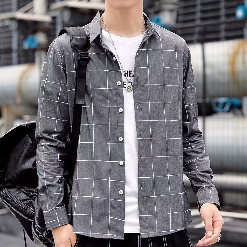 청소년 격자 무늬 셔츠 남성용 긴팔 한국식 슬림핏 패셔블 유행의 잘생긴 셔츠 남성용 2024 봄과 가을 새 자켓스토어 가기