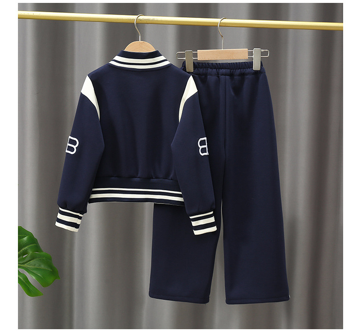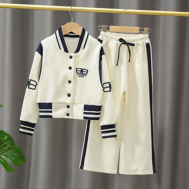 여자 야구 세트 세트 트렌디 한 팬 종 다 어린이 가을 2024 새로운 유행 짧은 스웨트 셔츠 넓은 다리 바지 투피스 세트